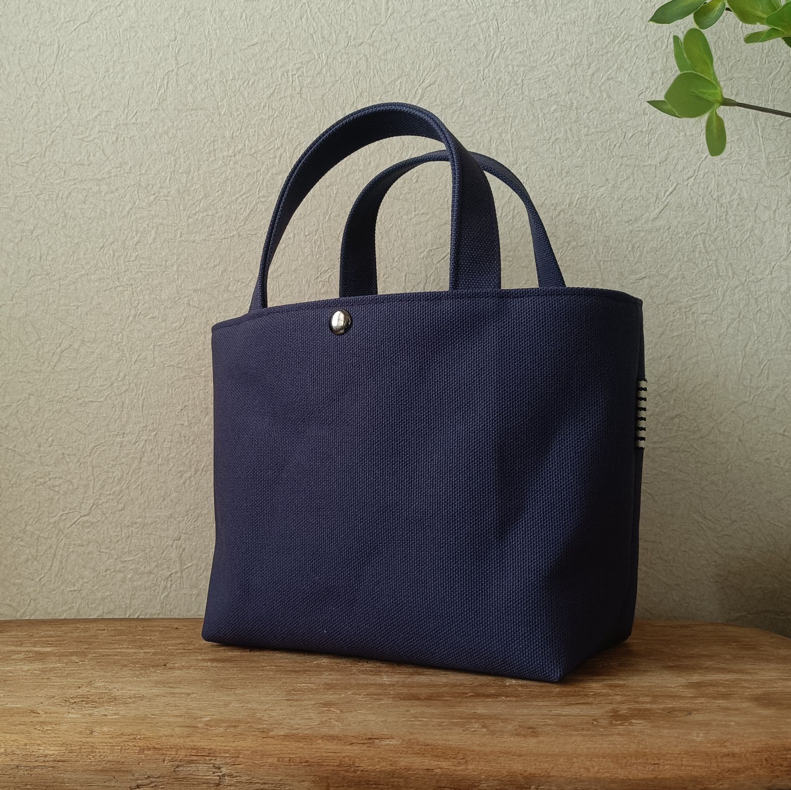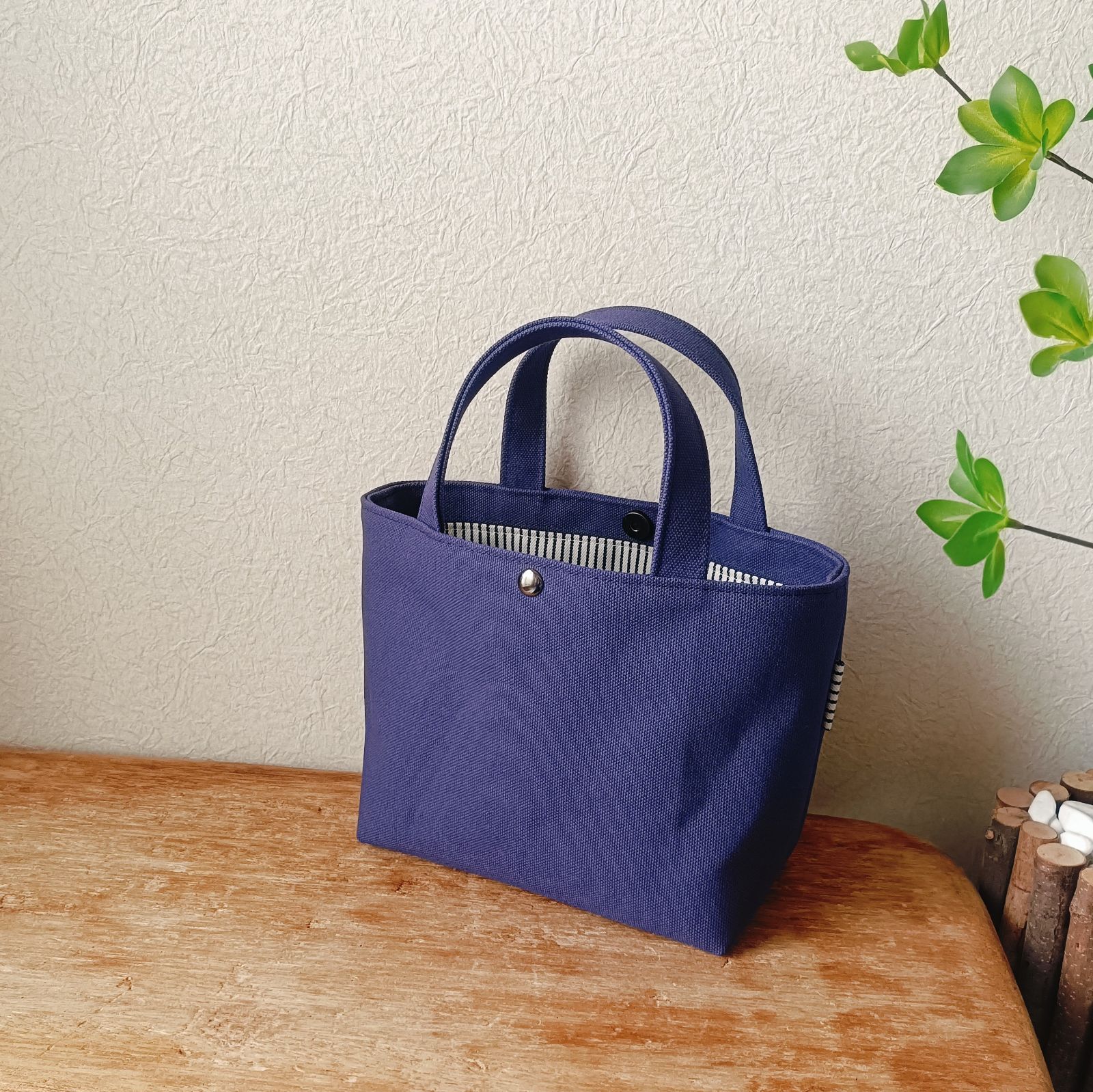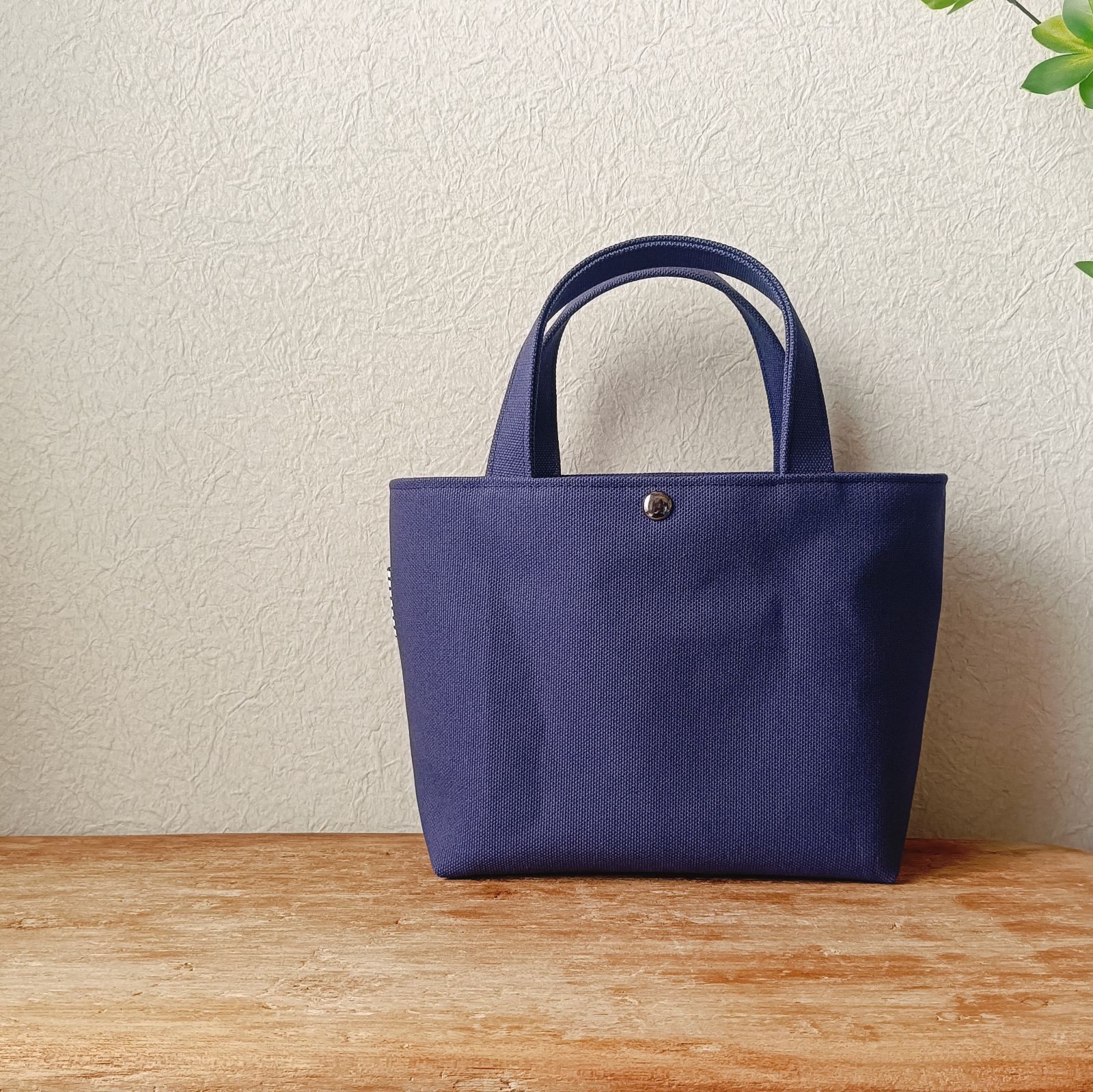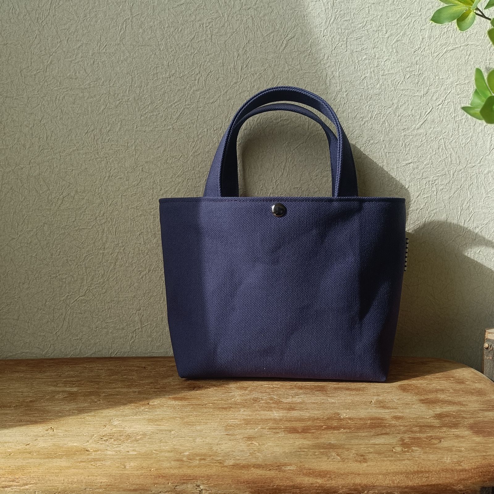 糊付け加工を施した帆布(パープルブルー)を使用していますので、ハリとコシのあるしっかりしたミニトートになっています。弱撥水効果もあり頑丈です。使い込めば、少しずつ柔らかくなり馴染んできます。