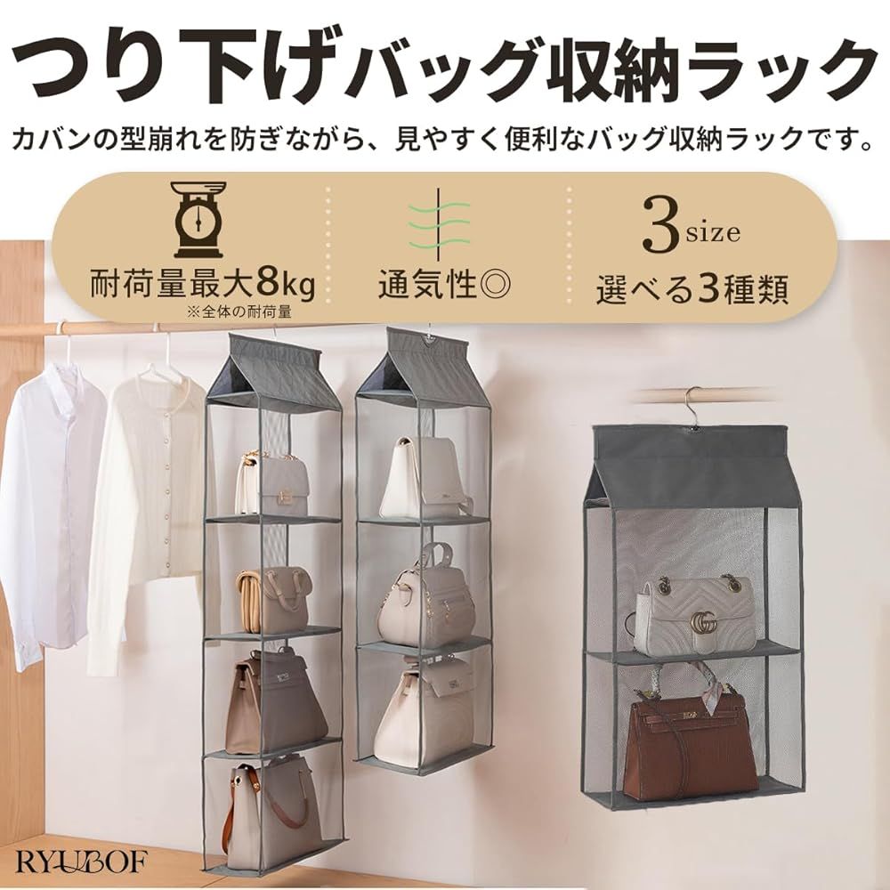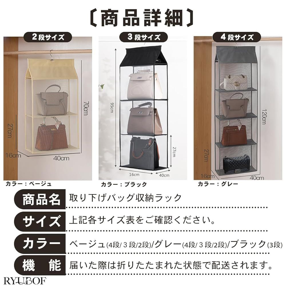 「商品状態」11「商品情報 (新品の場合) 」 「主な仕様」【選べるサイズ&しっかり収納】 吊り下げ式バッグ収納は、2段・3段・4段の3タイプ展開。各層の高さは約27cmで、大きめバッグもOK。上部には三角形スペース(約16cm)があり、型崩れを防ぎながらスムーズに収納できます。 サイズ展開: 4段:約40×16×120cm 3段:約40×16×95cm 2段:約40×16×70cm 折りたたみ時はわずか約40×16×2cmとコンパクト!
