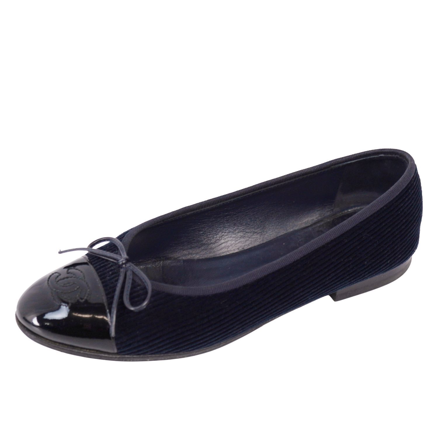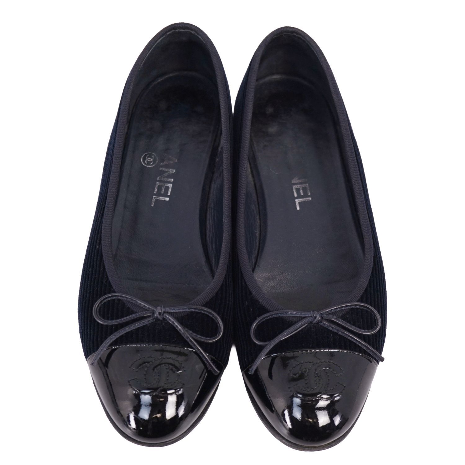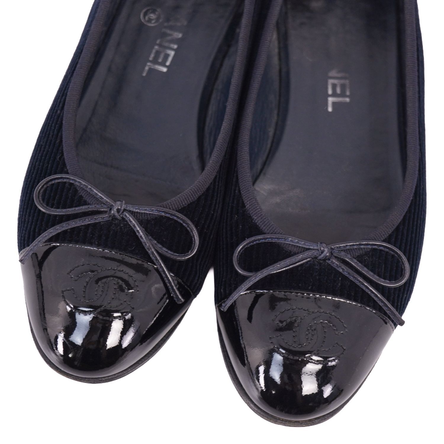 美品 シャネル CHANEL G02819 フラットパンプス キャップトゥ ココマーク リボン コーデュロイ シューズ 靴 36.5C
