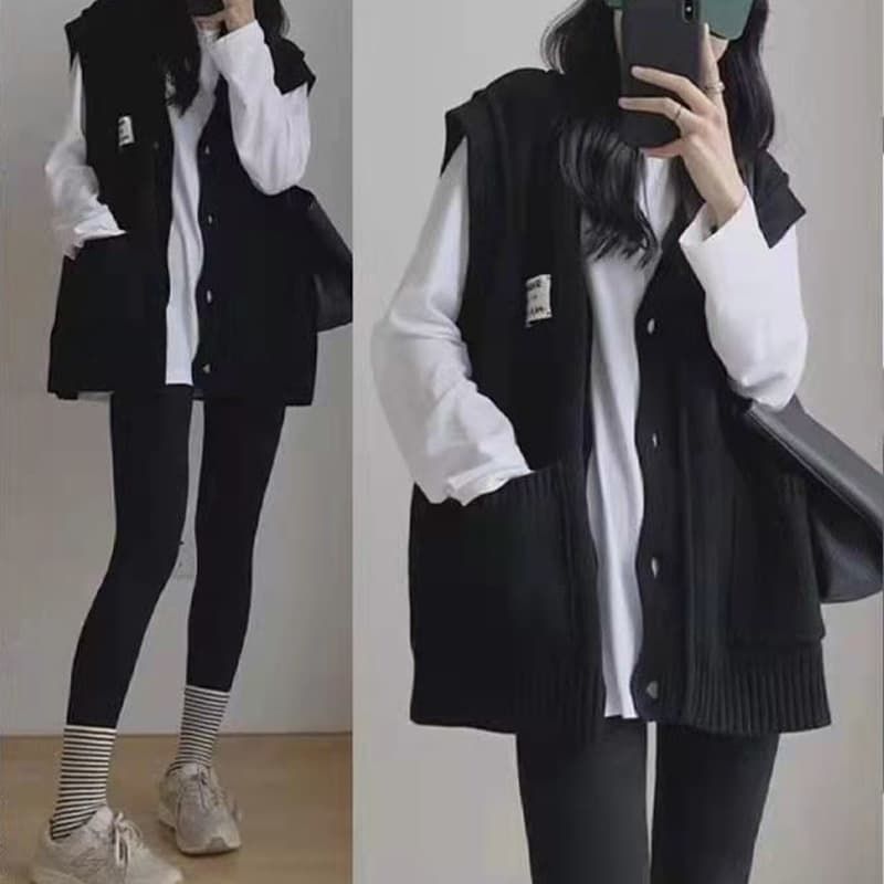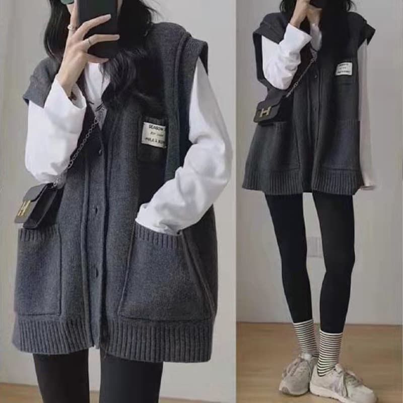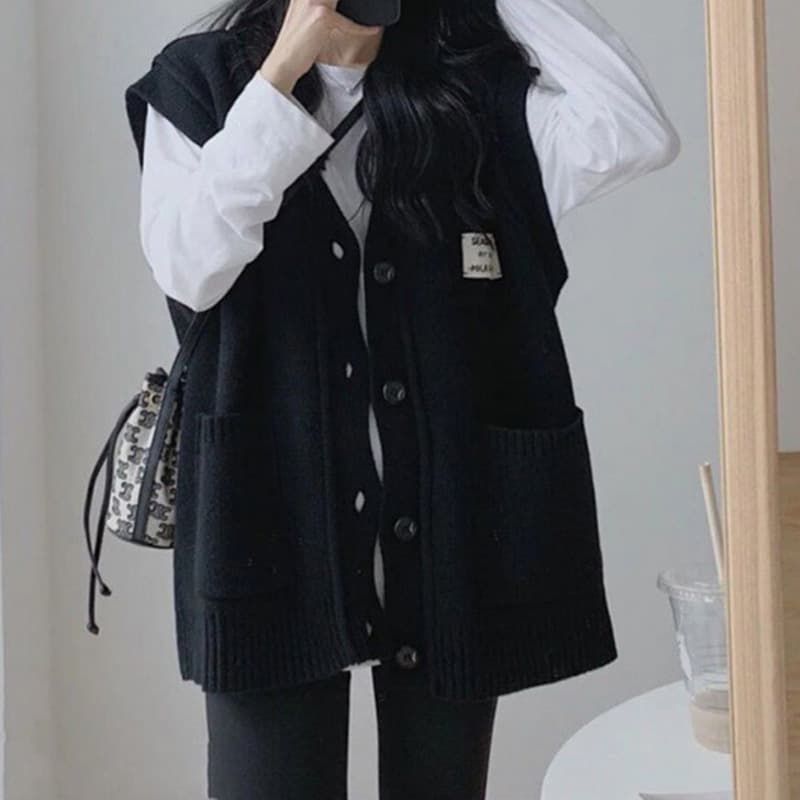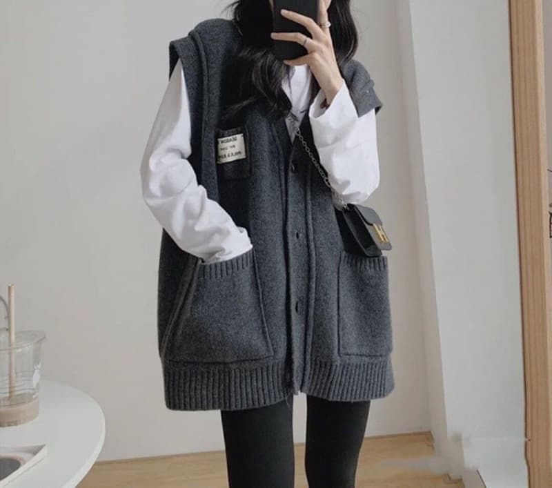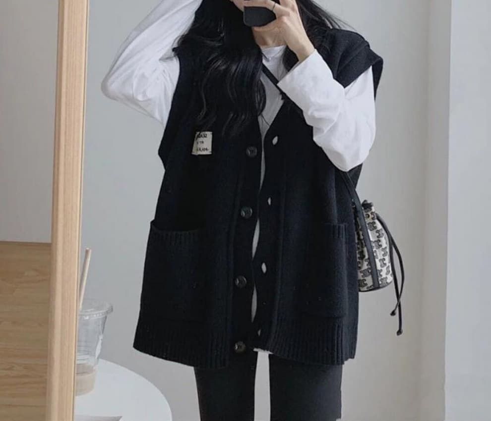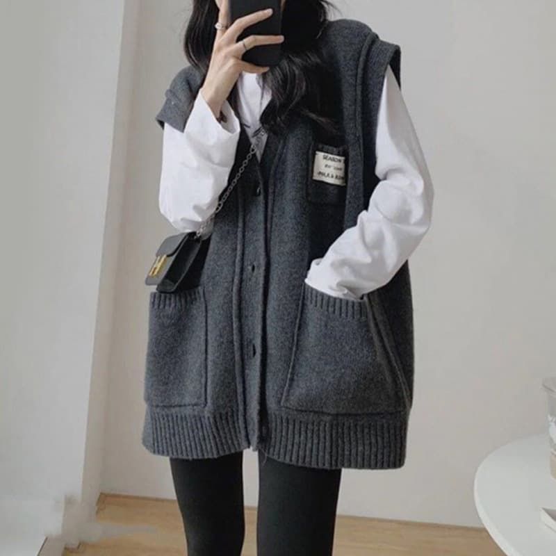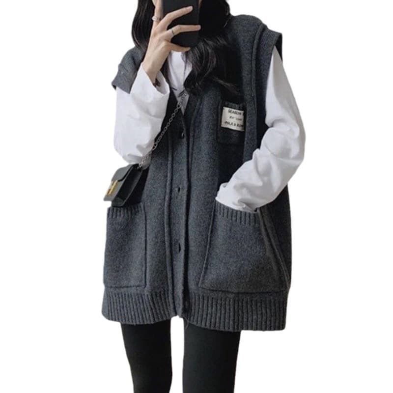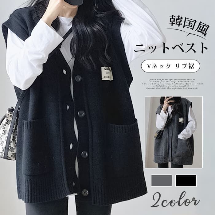 ニットベスト ポケット付き レディース Vネック リブ裾 ゆったり セーター 秋 冬 トップス 無地 ボタン留 前開き シンプル カジュアル 大人 可愛い 女性 お出かけ オフィス ビジネス 通勤 通学 韓国風