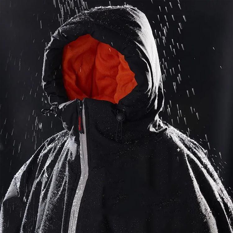 ■ フードにはドローコード付きで、フィット感を調節可能。