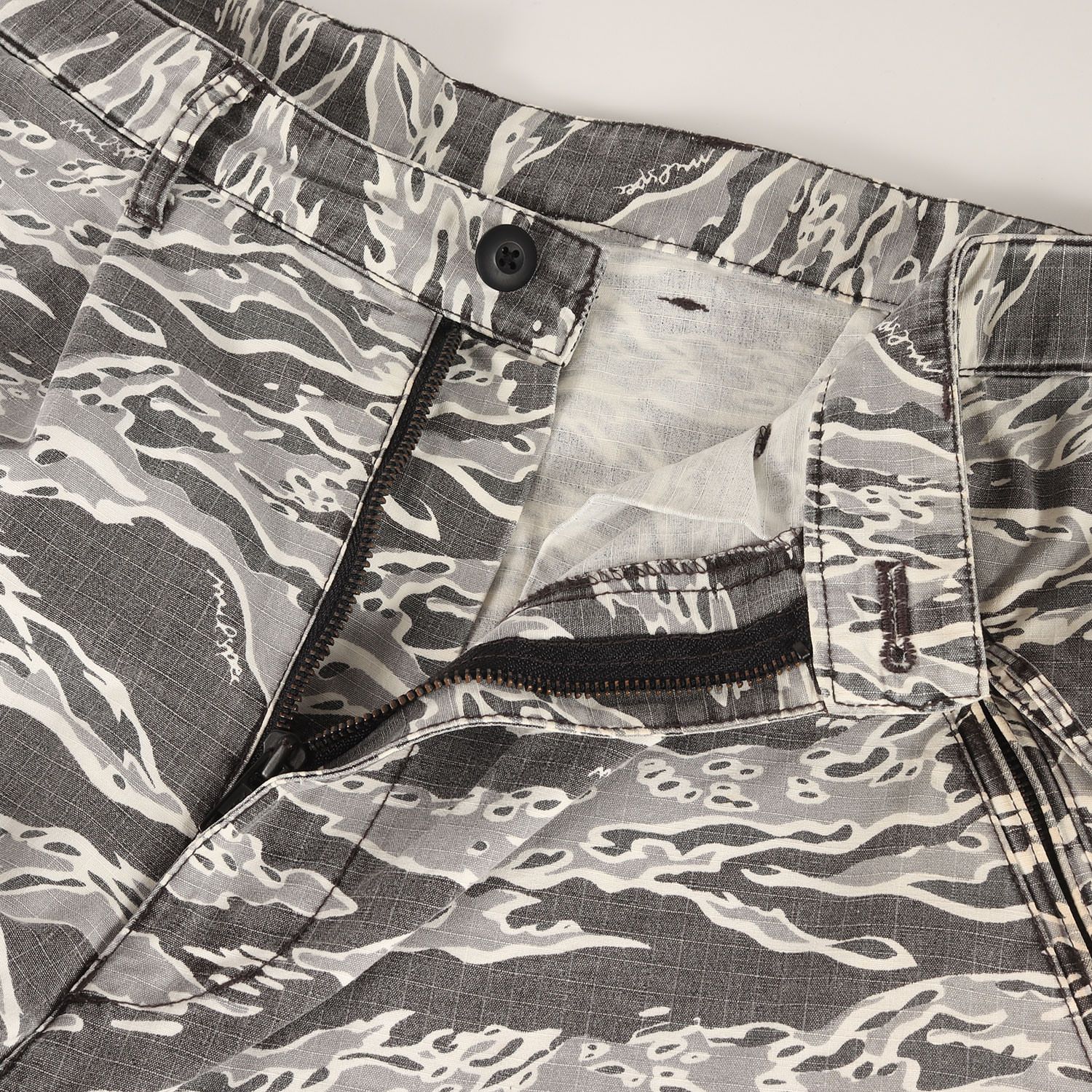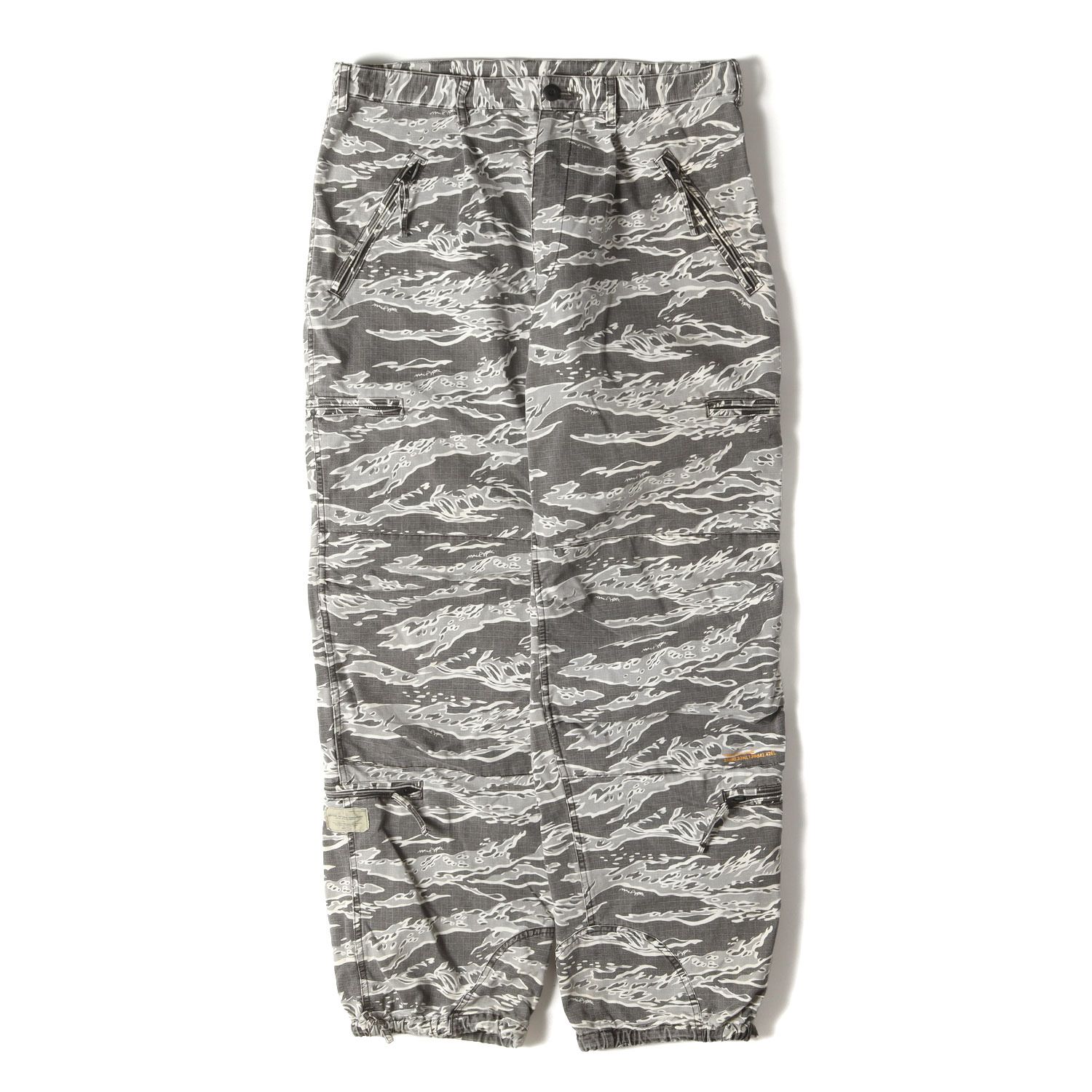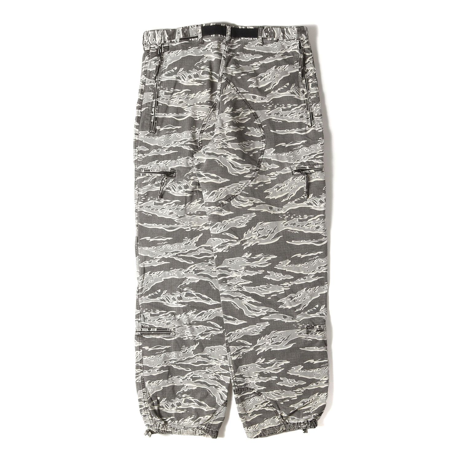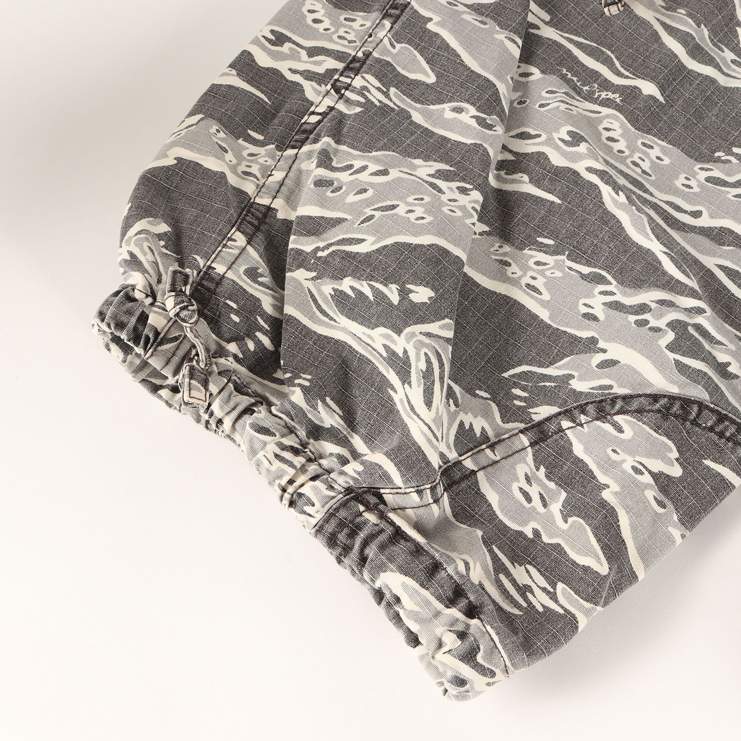 多数のジップポケットがデザインされたヘリクルーパンツです。ボディにはタイガーカモ柄のリップストップコットン生地を使用しております。