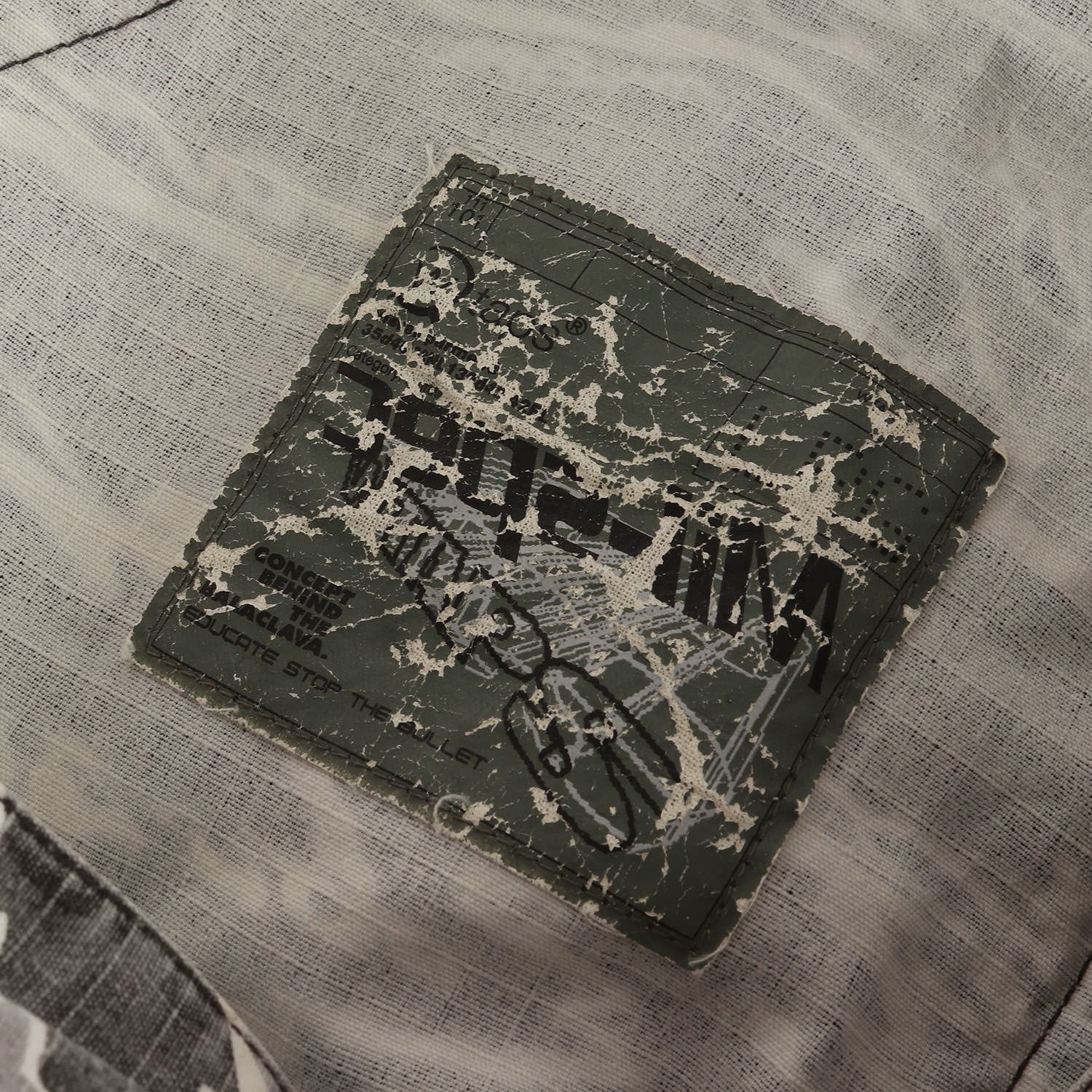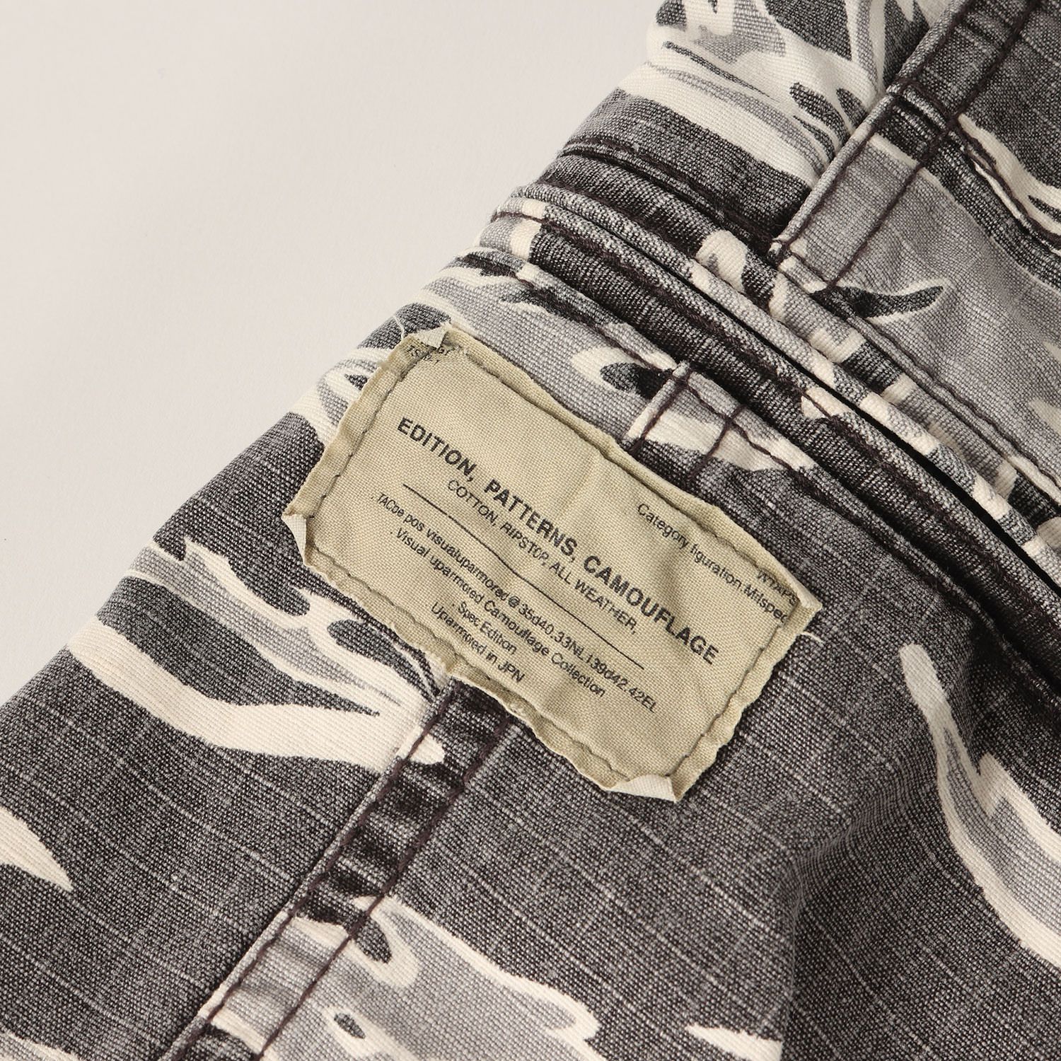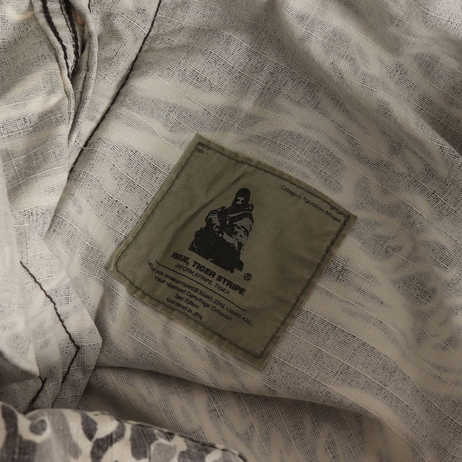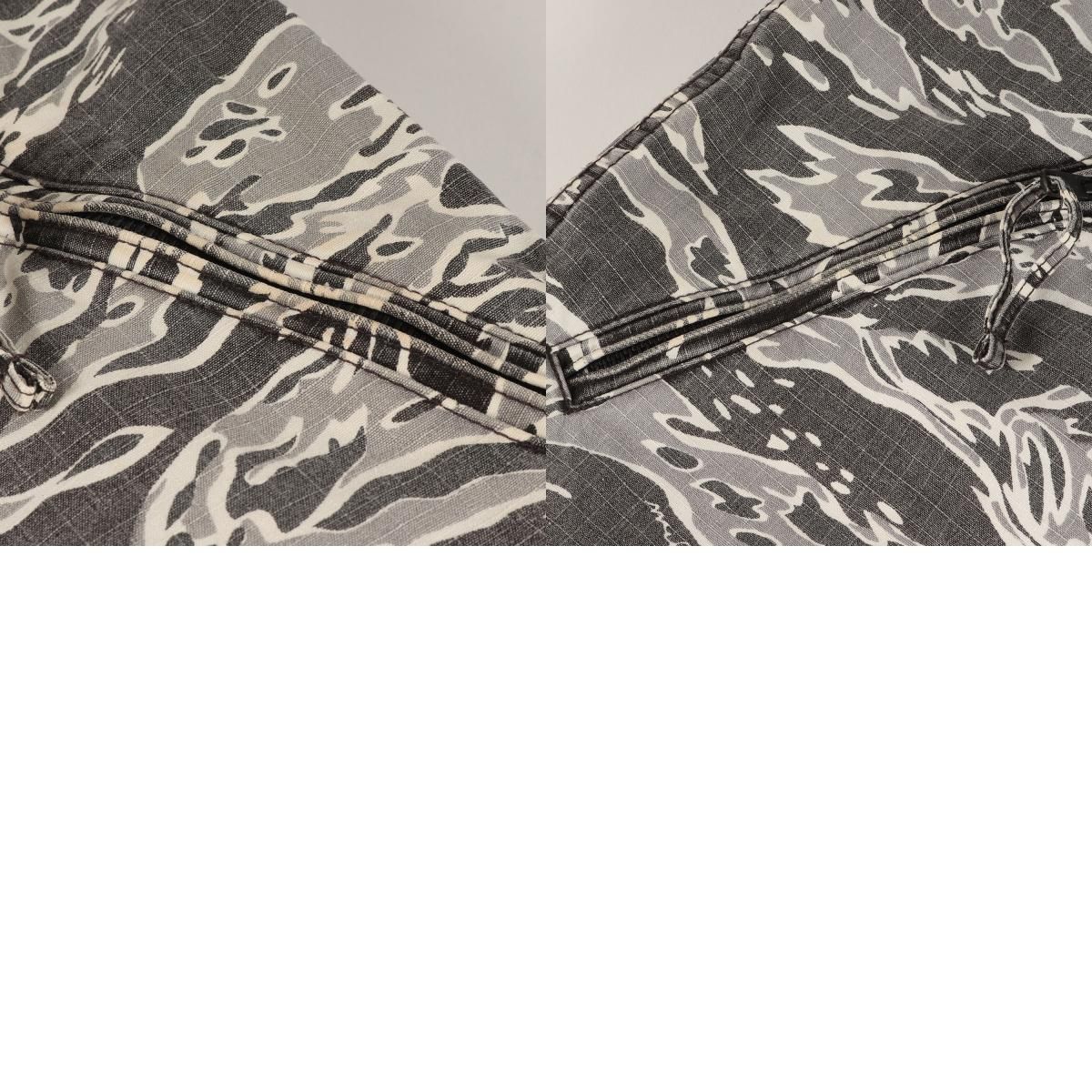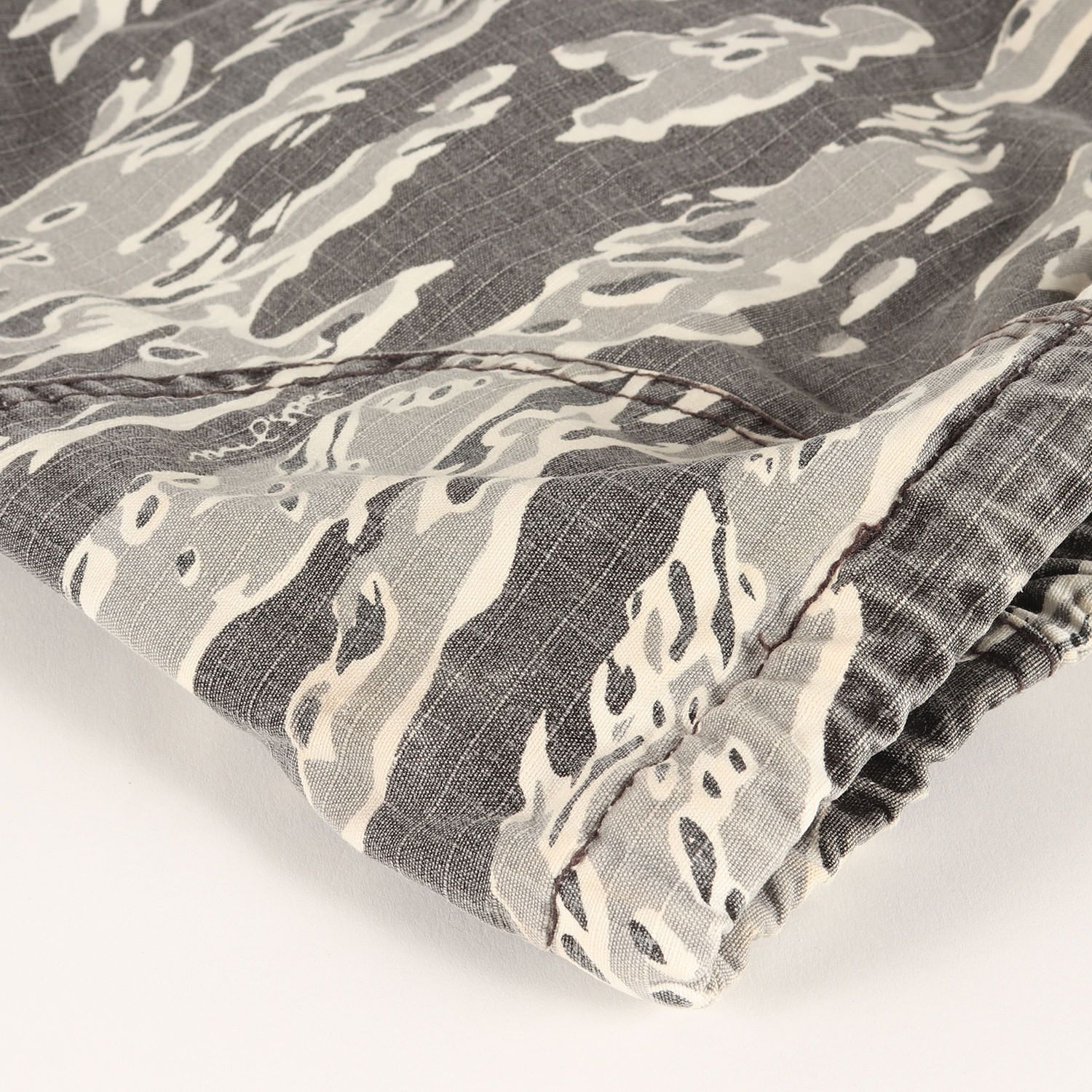 多数のジップポケットがデザインされたヘリクルーパンツです。ボディにはタイガーカモ柄のリップストップコットン生地を使用しております。