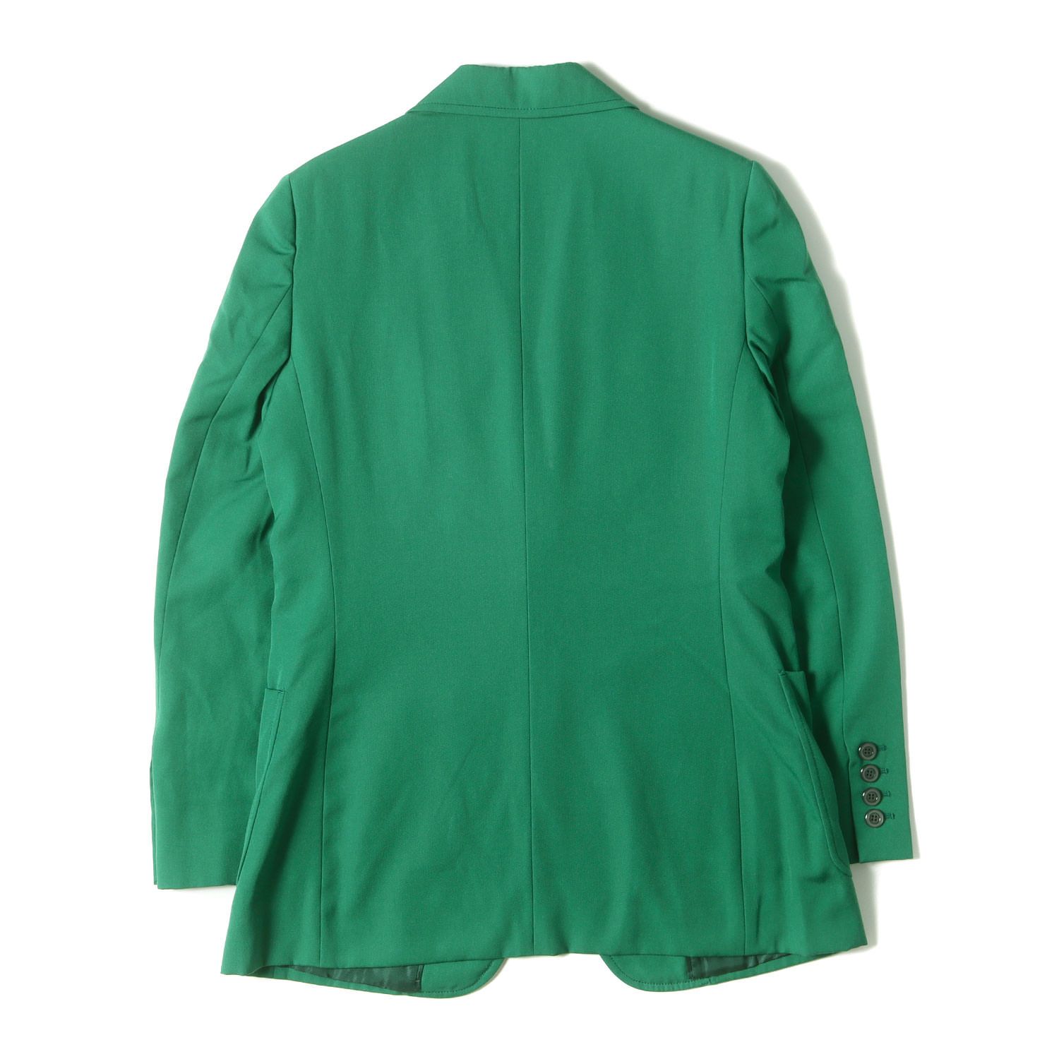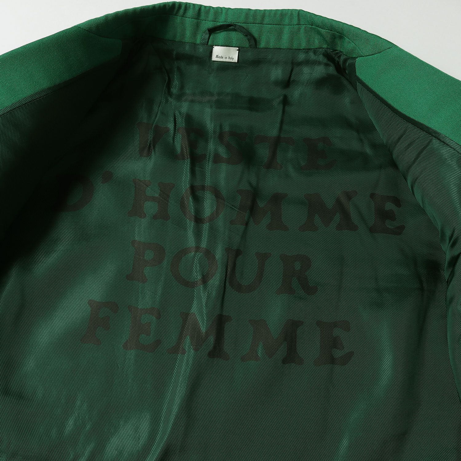 色鮮やかなグリーンで仕上げたピークドラペルテーラードジャケットです。裏地にプリントした「VESTE D'HOMME POUR FEMME」というメッセージロゴがポイントです。