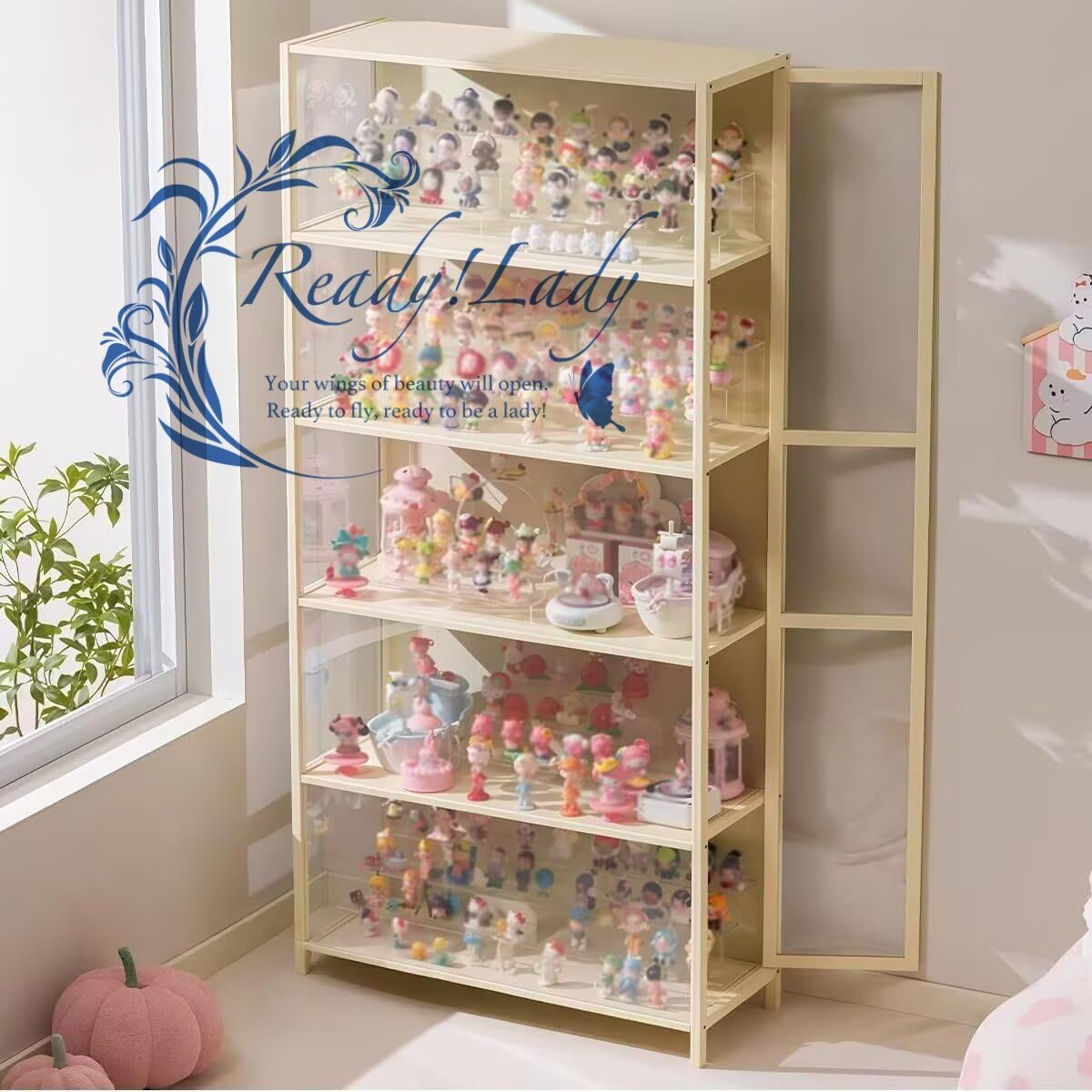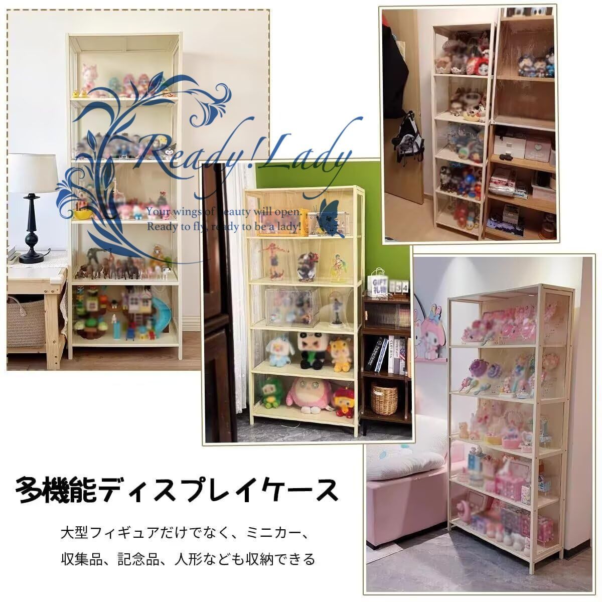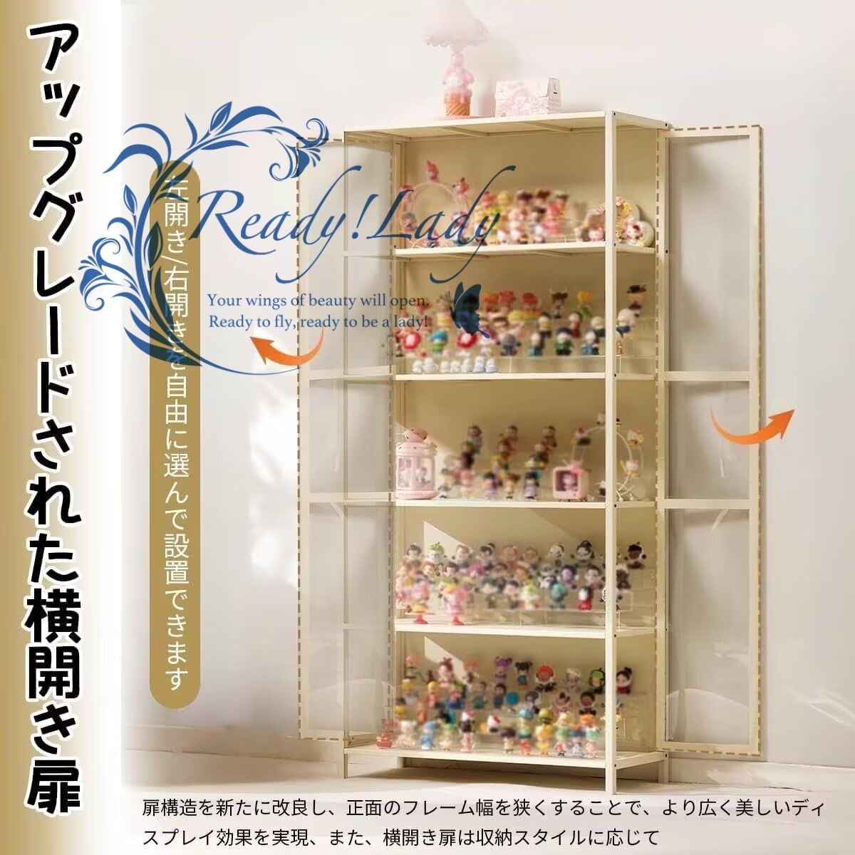 🍭【アップグレードされた横開き扉】扉構造を新たに改良し、正面のフレーム幅を狭くすることで、より広く美しいディスプレイ効果を実現。視認性が向上し、快適な鑑賞体験が得られます。また、横開き扉は収納スタイルに応じて、左開き/右開きを自由に選んで設置できます。