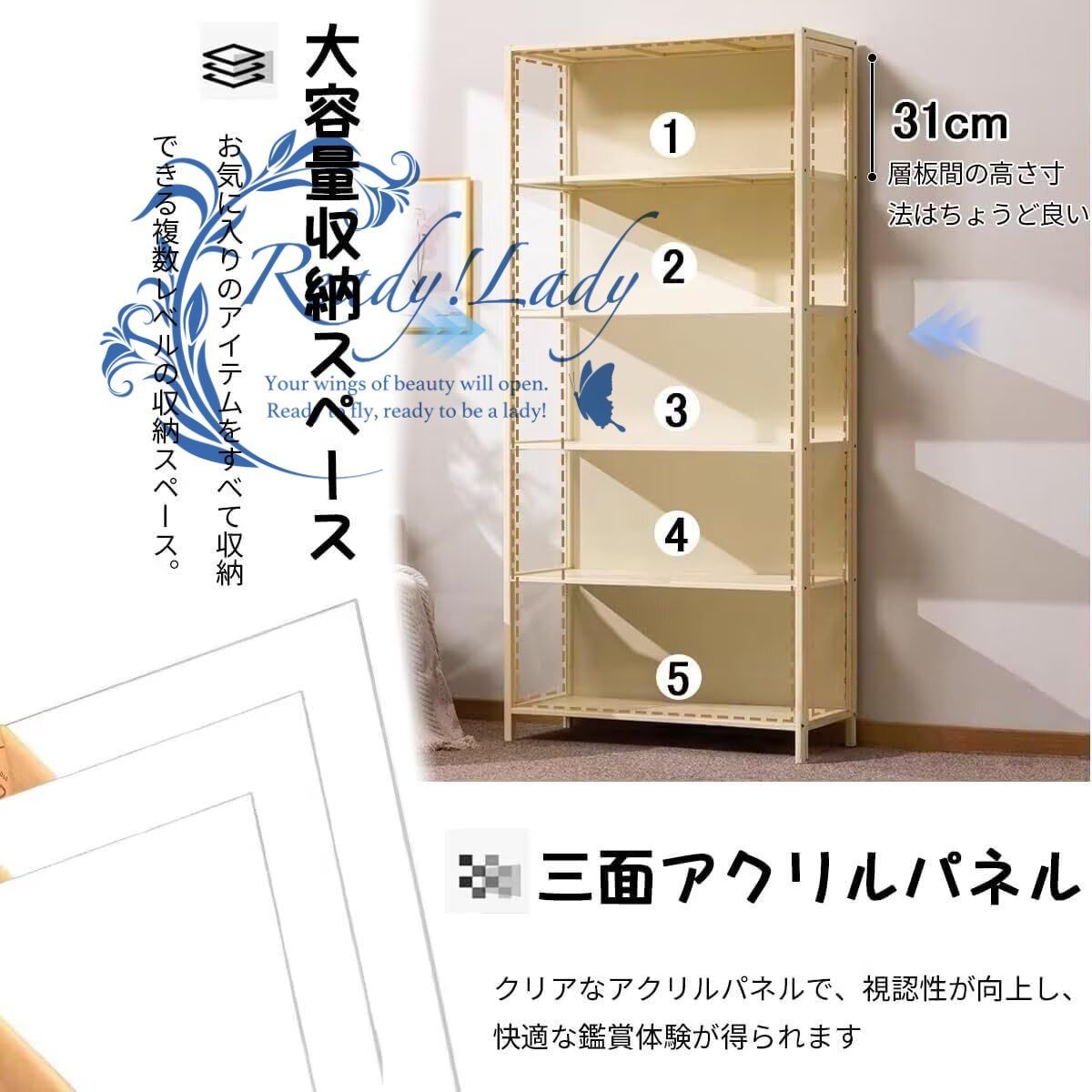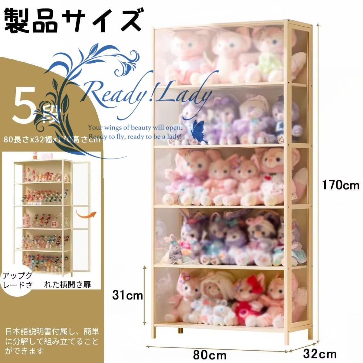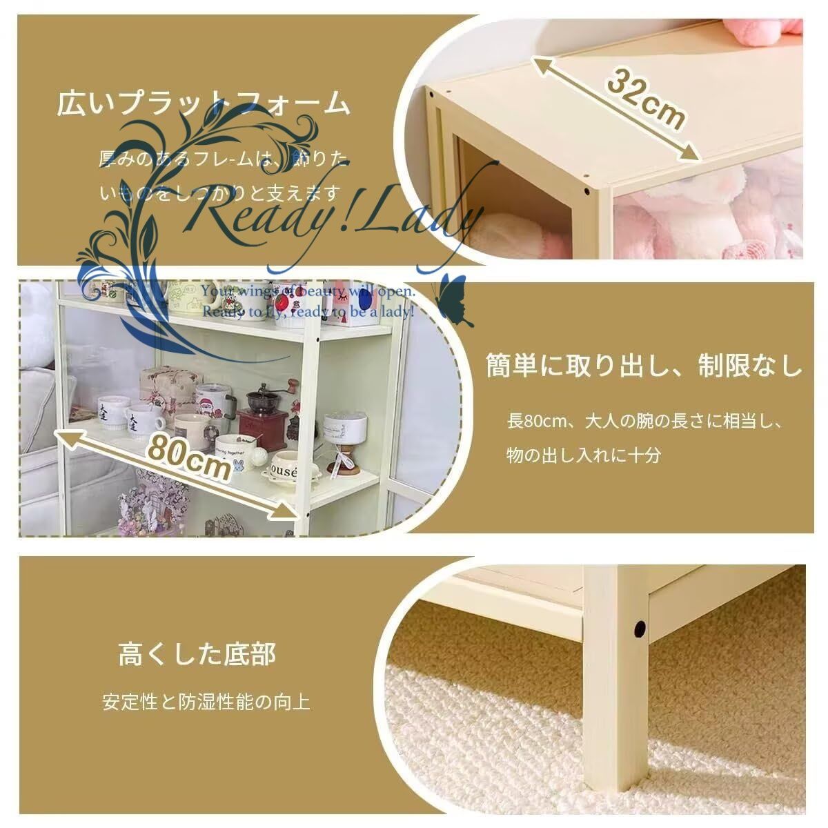 🍭【アップグレードされた横開き扉】扉構造を新たに改良し、正面のフレーム幅を狭くすることで、より広く美しいディスプレイ効果を実現。視認性が向上し、快適な鑑賞体験が得られます。また、横開き扉は収納スタイルに応じて、左開き/右開きを自由に選んで設置できます。