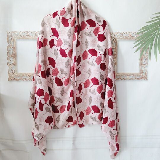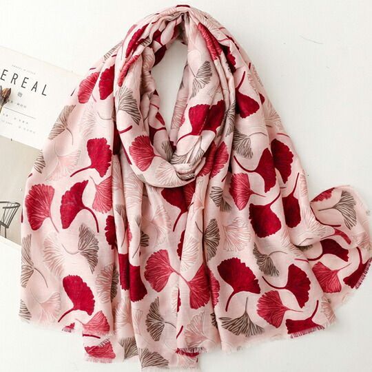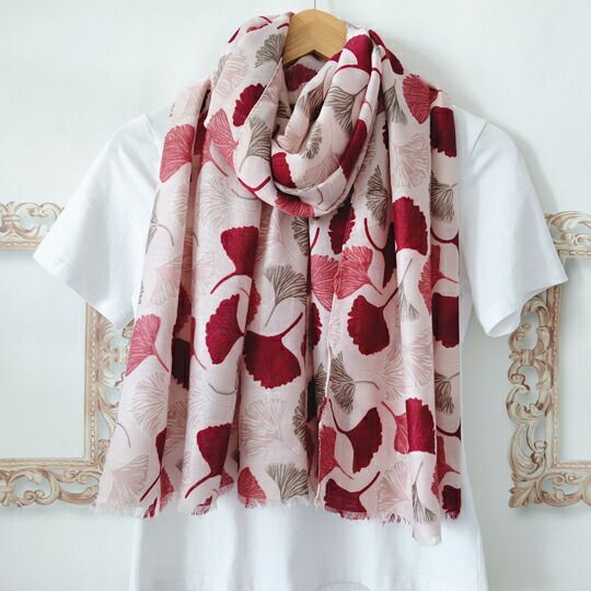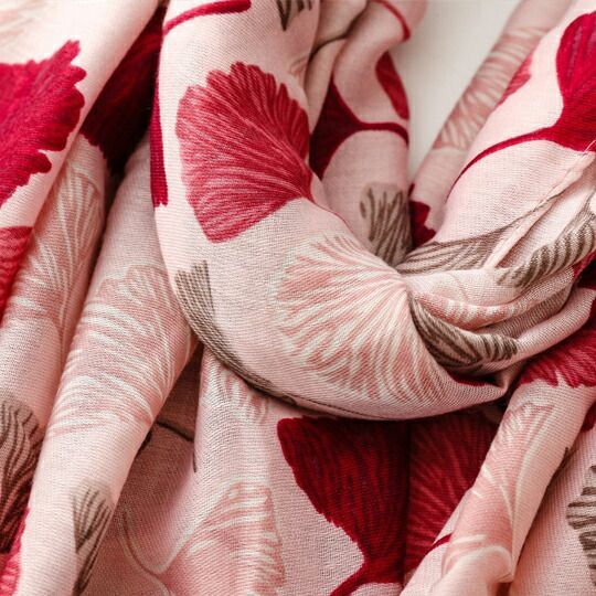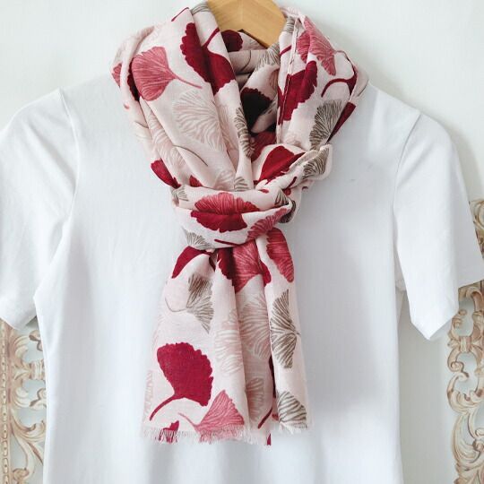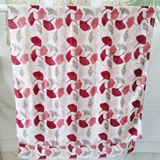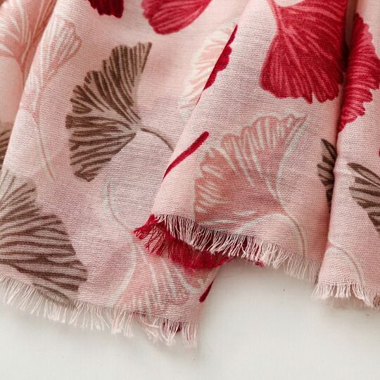 イチョウの葉が美しくデザインされたストールです。さまざまなピンクの色合いが織り成す「柔らかなグラデーション」が、上品で温もりある印象を与えます。秋の装いにぴったりのこのアイテムは、シンプルなコーディネートに華やぎと立体感をプラス。一枚羽織るだけで、秋のファッションを一層引き立ててくれるでしょう。
