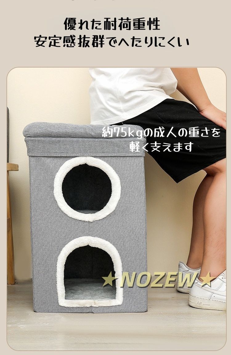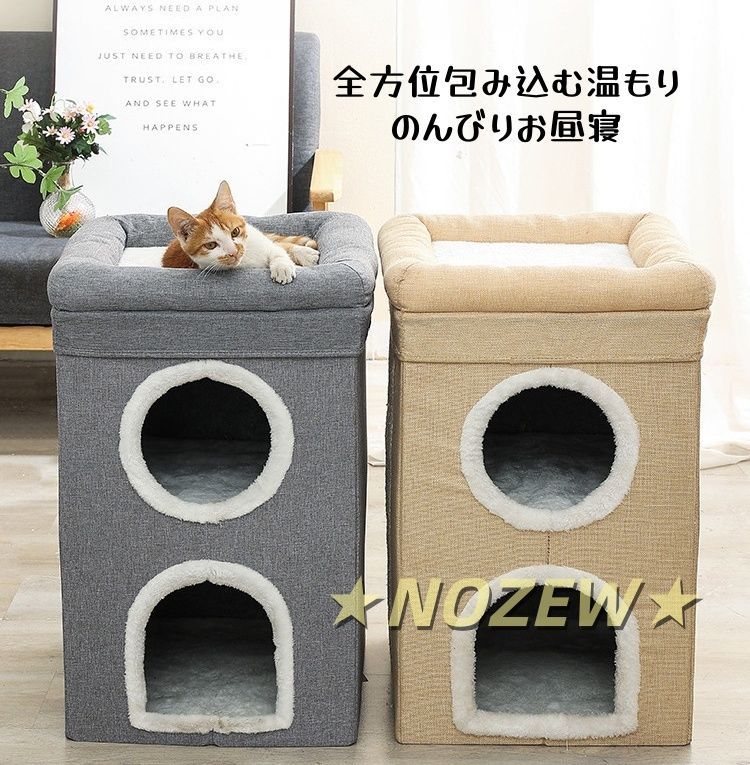 【快適でソフト・可愛いデザイン】二階建ての猫ハウスは半密閉式の設計なので隠すことが好きな猫ちゃんの天性に合います。猫ちゃんや小動物たちにとって快適な空間を提供してくれるアイテムです。中のベッドはソフトなPP綿を使用しており、ふわふわで、クッション性を実現でき、暖かくペットを包んでくれます。