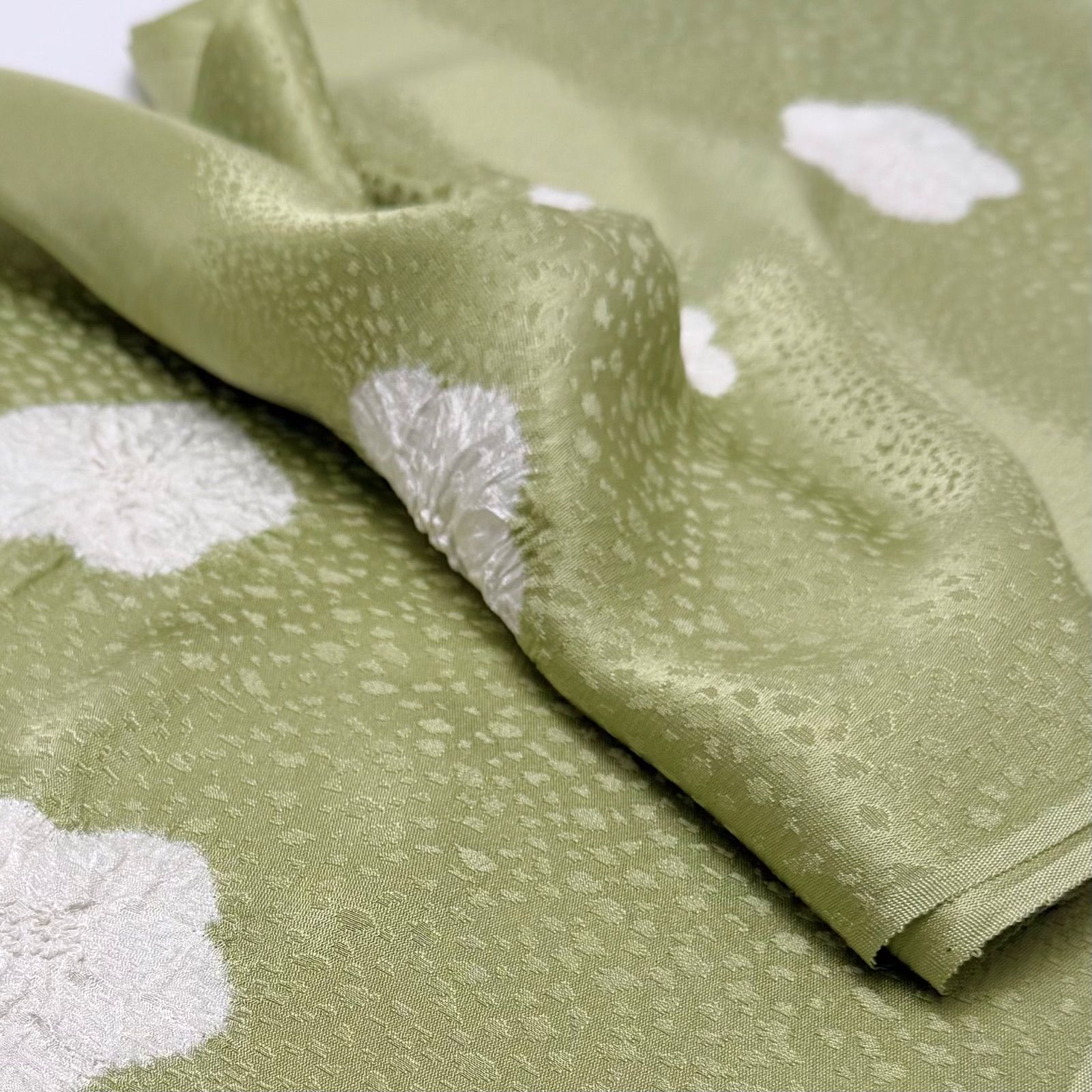 せせらぎのような水の地紋に、輪出しの花がひとつひとつ咲いた帯揚げ。
