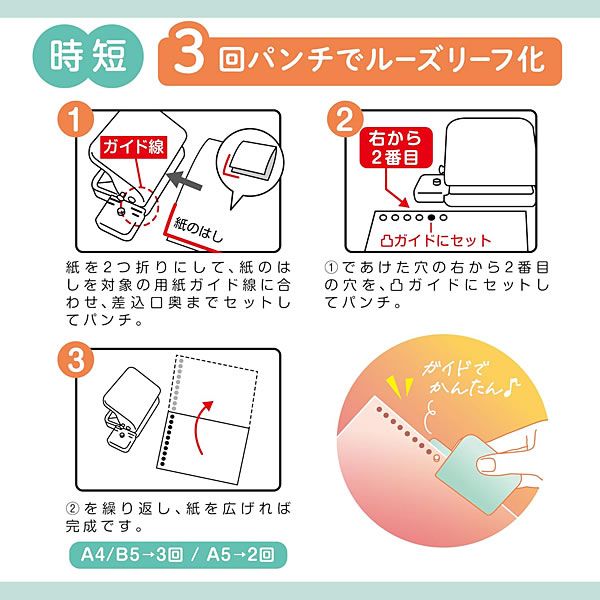 A5(20穴)、B5(26穴)、A4(30穴)用紙に対応。最大穴あけ枚数は5枚までです。