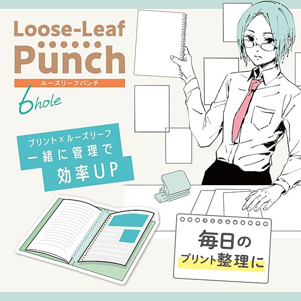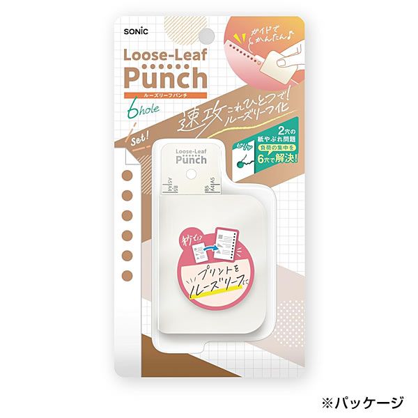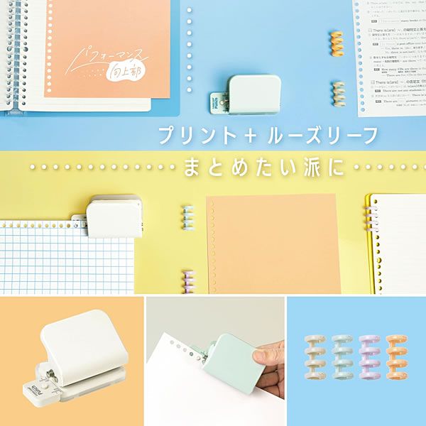 6穴のパンチをガイドを使って正確にずらして穴をあけていけるので、簡単にプリントのルーズリーフ化が出来ます。