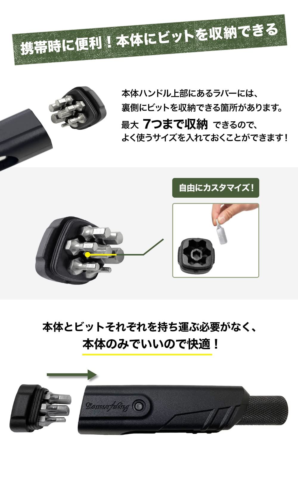 ???♂?【マグネットでビットを固定!作業しやすく快適】ビットホールド部はマグネット式のため、ビットが落ちることなく快適。またビット自体もそのまま磁化してネジをくっつけることができるため、手元が安定し作業がしやすくなっています。