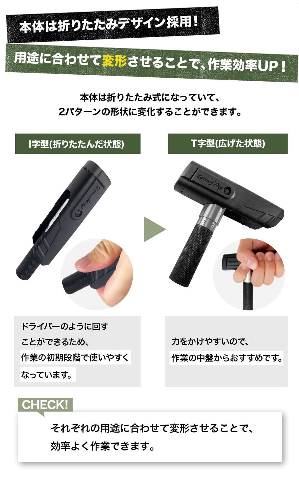 ???♂?【本体は折りたたみ式!用途に合わせて変形させて作業効率UP!】本体は、折りたたみ式になっていて、2パターンの形状に変化します。①I字型(折りたたんだ状態):ドライバーのように回すことができるため、作業の初期段階で使いやすくなっています。②T字型(広げた状態):力をかけやすいので、作業の中盤からおすすめです。