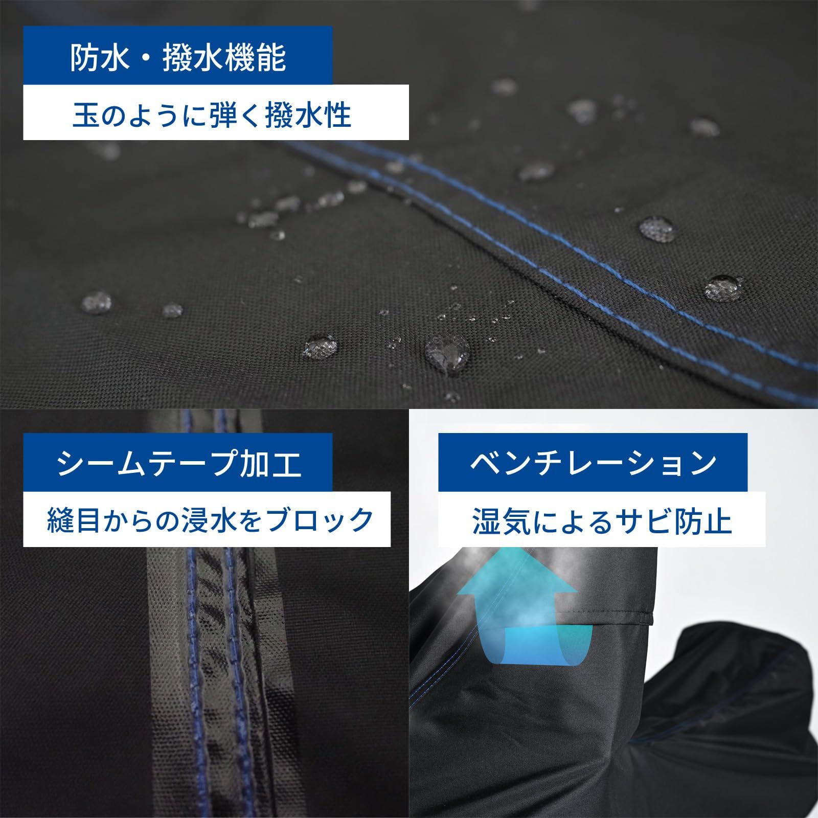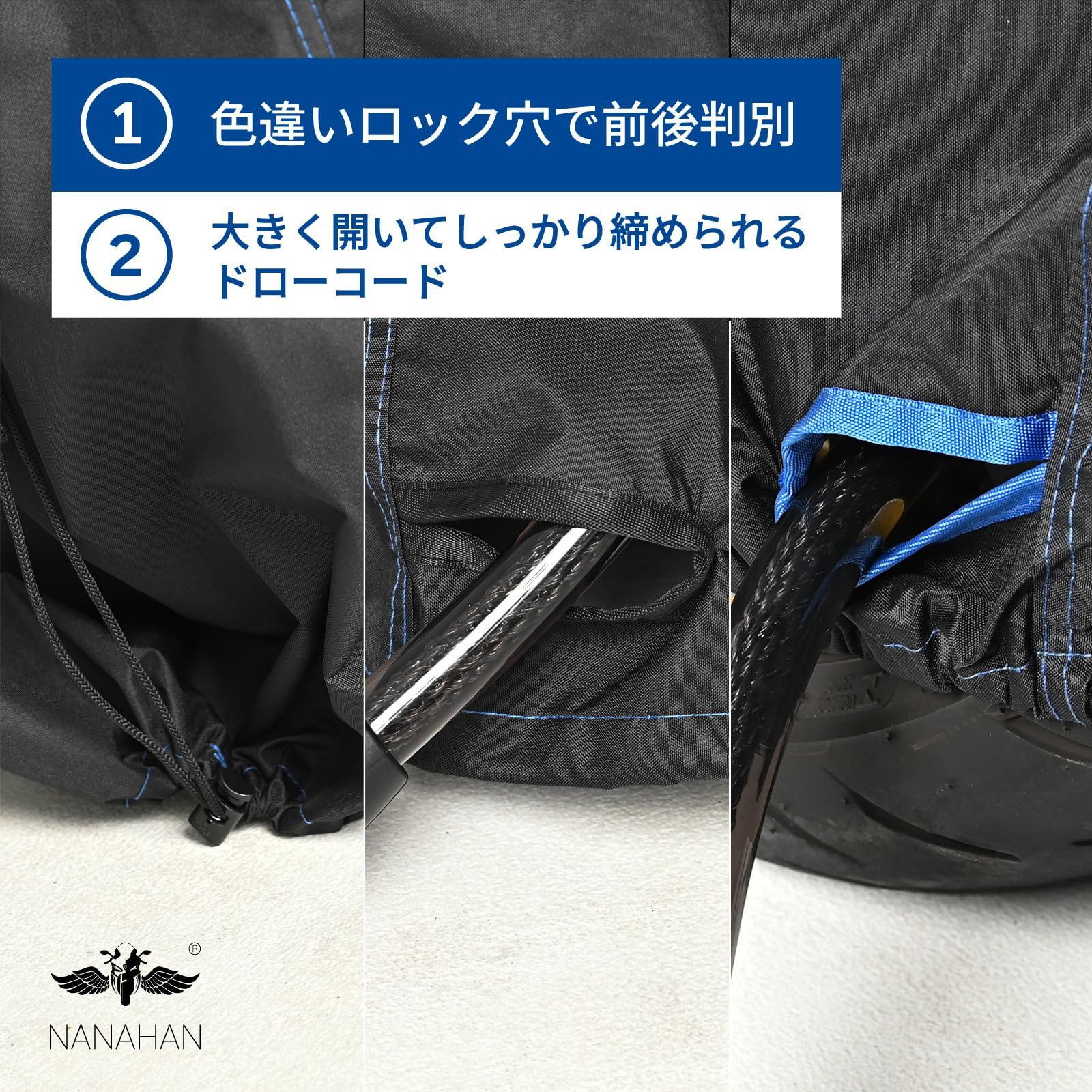 スマート設計で使いやすい防水・撥水・防風バイクカバー:NANAHANの防水バイクカバーは、降雨防水・高撥水・耐風機能を兼ね備え、盗難防止機能も搭載。後輪部は裾ゴムではなくドローコード仕様のため、広く開いて素早く着脱できる使いやすさを実現しました。前後で色分けされた大径ロック穴を備え、取り付け時にカバーの前後を一目で判別可能。あらゆる悪天候や風からバイクをしっかり守ります。