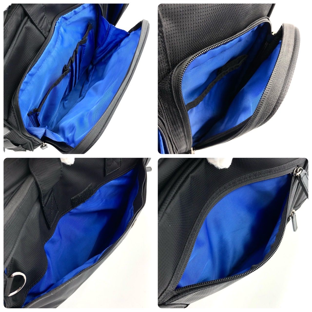 ■多機能な3WAY仕様で、手持ち、ショルダー、リュックとしてシーンに合わせて使い分けが可能です。収納ポケットが非常に豊富で、内装の鮮やかなブルーが中身の視認性を高めています。