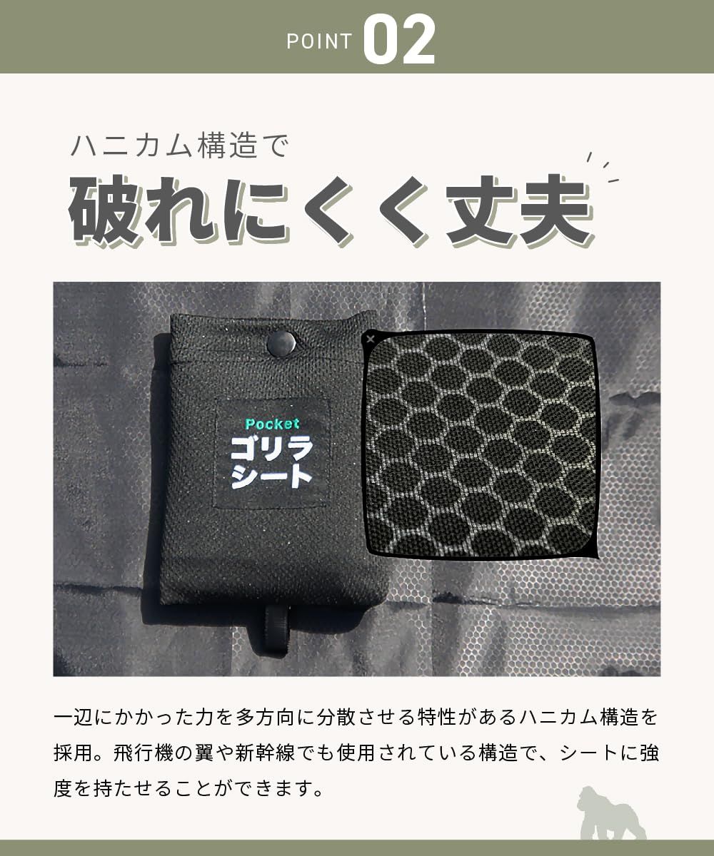 【軽くて強靭】ハニカム構造で軽くて強靭!ゴツゴツした石や砂利の上にゴリラシートを用いても安心してご利用いただけます。
