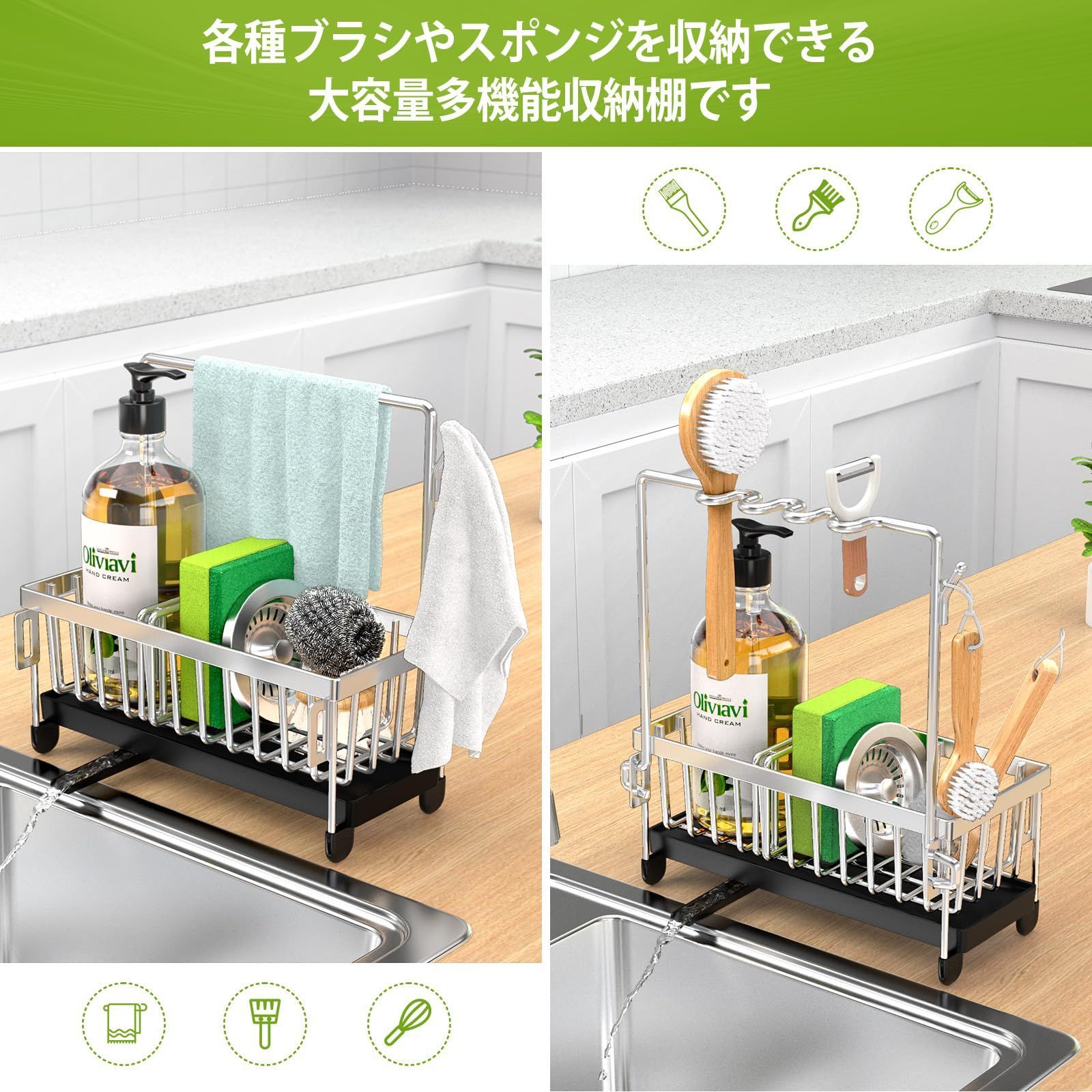 【多機能使用】キッチンシンクのキャディーは1つの取り外し可能な仕切りがあります。スポンジやたわし、食器用洗剤やハンドローションなど、洗い物の必需品をすべて収納できる十分なコンパートメントを備えた広々としたデザインが特徴です。さらに、タオルやブラシ専用のラックもあり、キッチン収納に多機能な使い方を提供します。