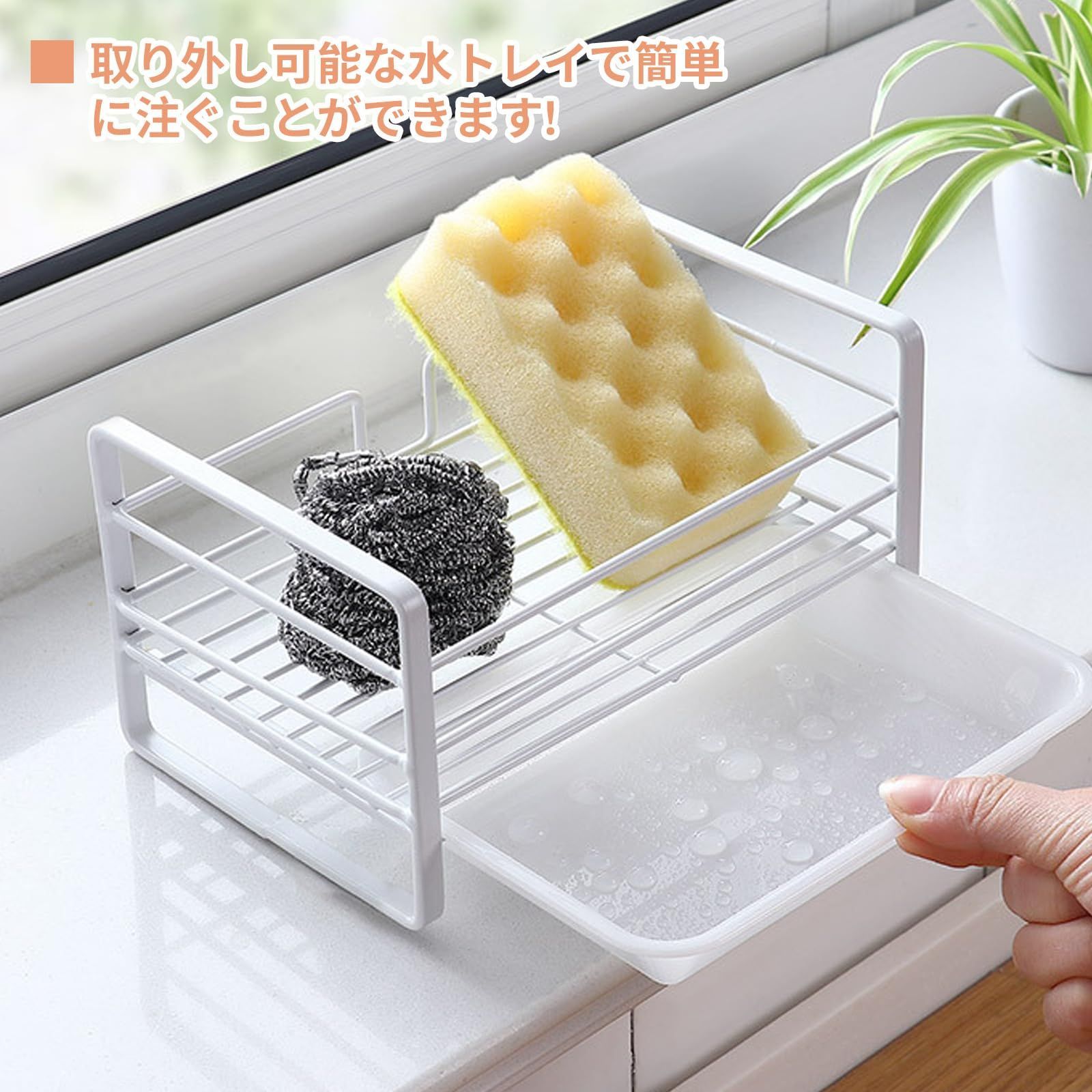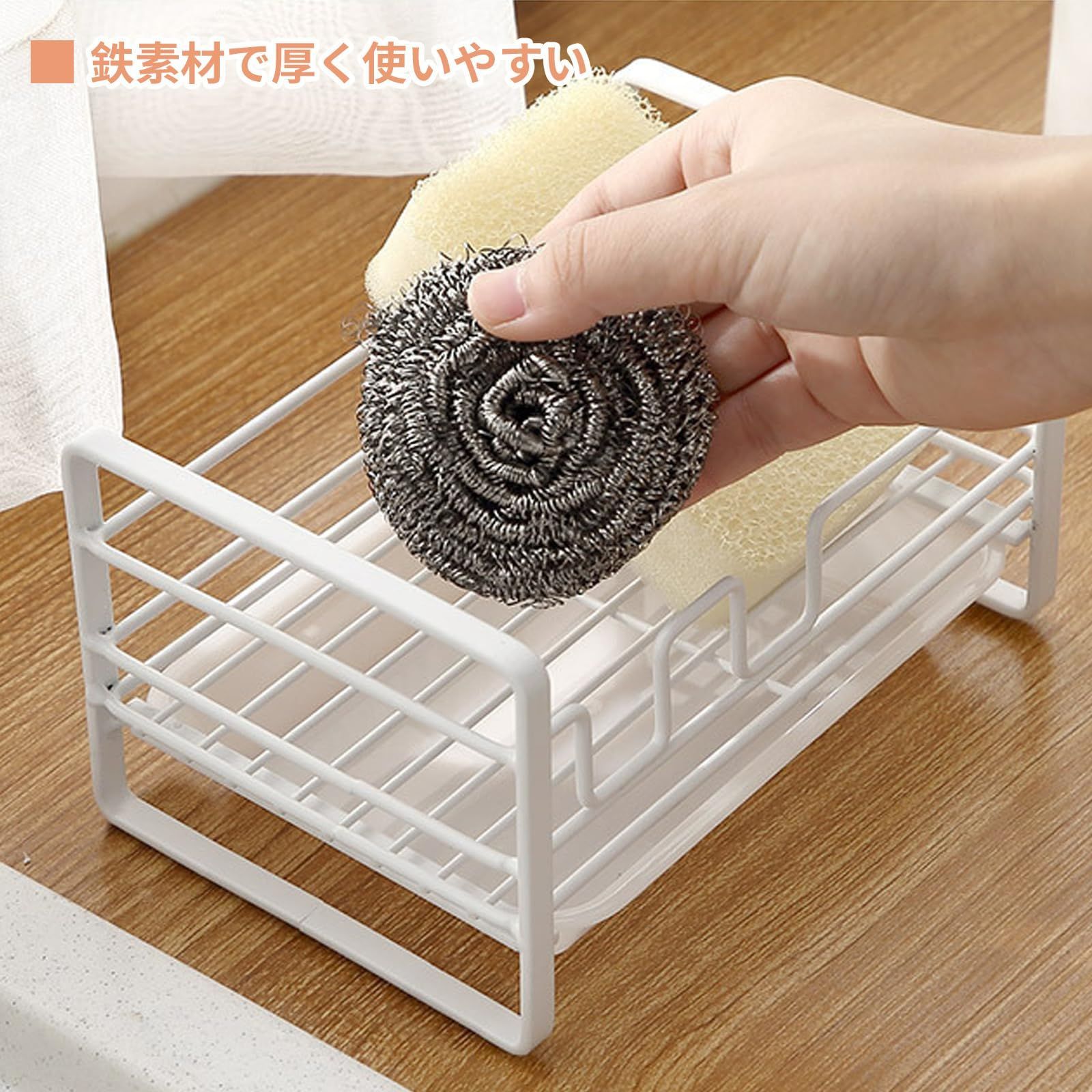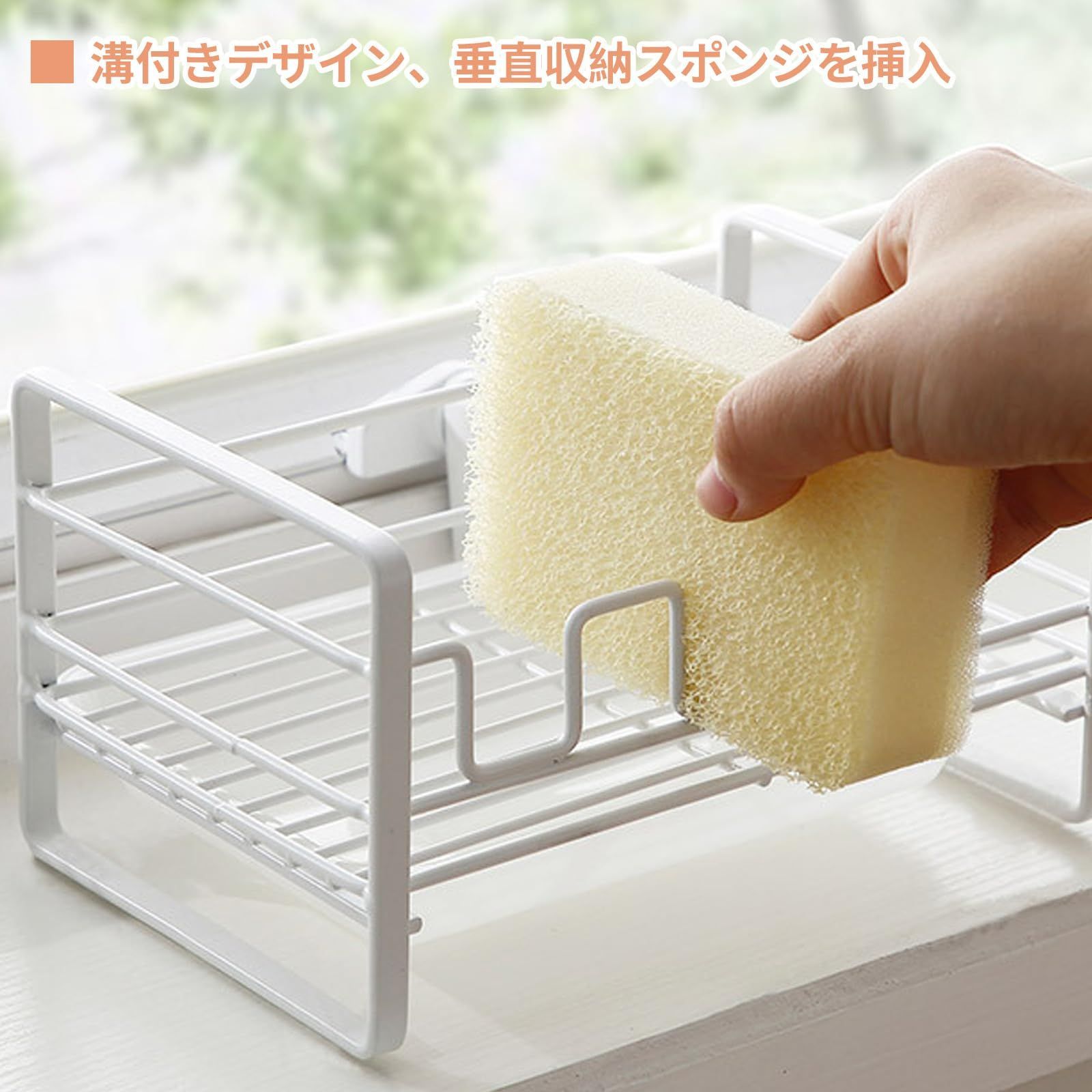 スポンジホルダー 水が流れる スポンジ置き ラック ふきん掛け付き たわし入れ ステンレス製 洗剤ホルダー 水切り 防錆 洗面所 キッチン シンク収納 ホワイト
