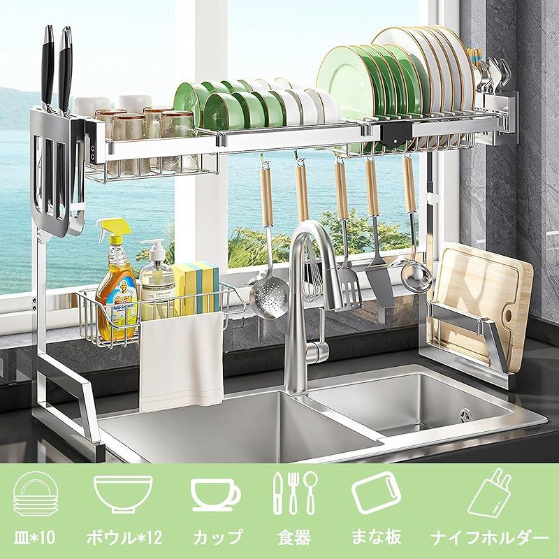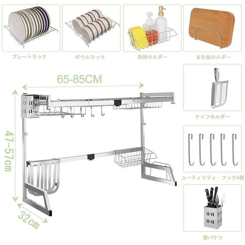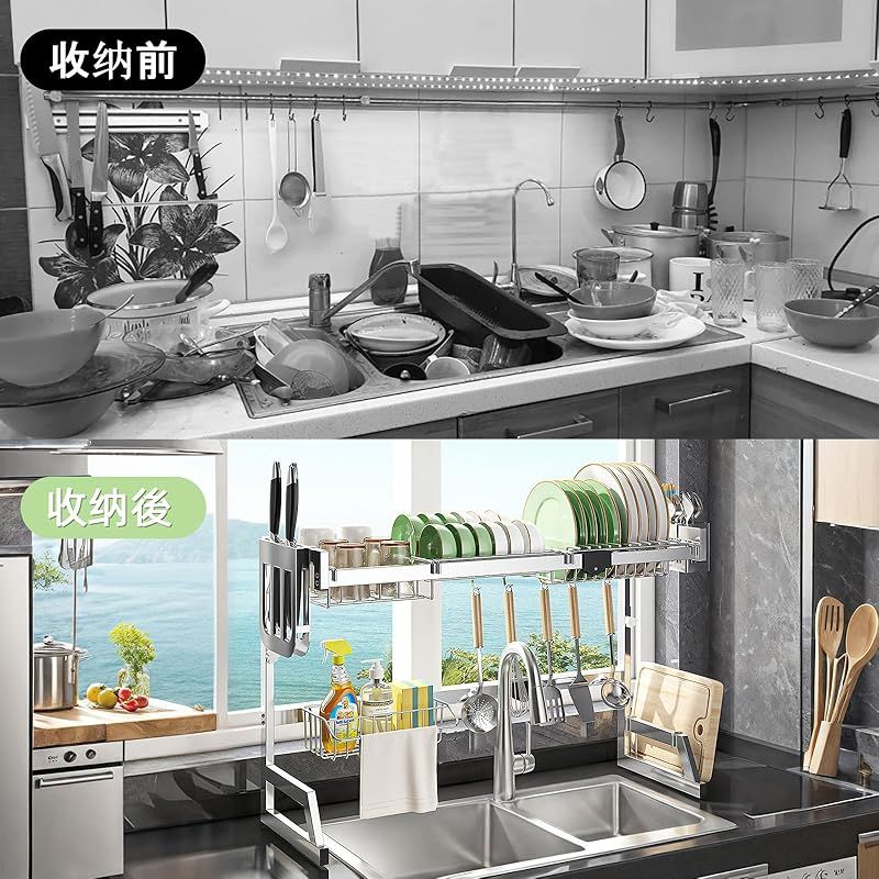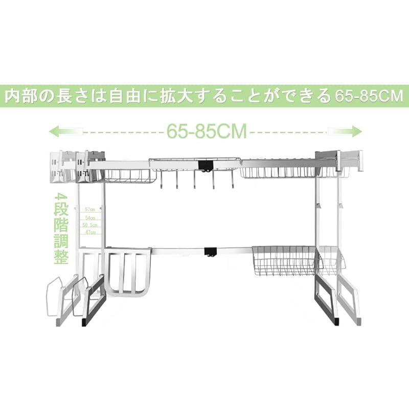 調節可能なディッシュラック:水切りラック シンク上ほぼすべてのサイズの家庭用シンクに適しており、幅(62 - 85CM)と高さ(43 - 53CM)の間で自由に調節可能で、特定のニーズに応じて柔軟に調整することができます(より良い適用性を得るために、シンクの幅が85CM未満であること、タップの高さが43CM未満であることを確認してください。