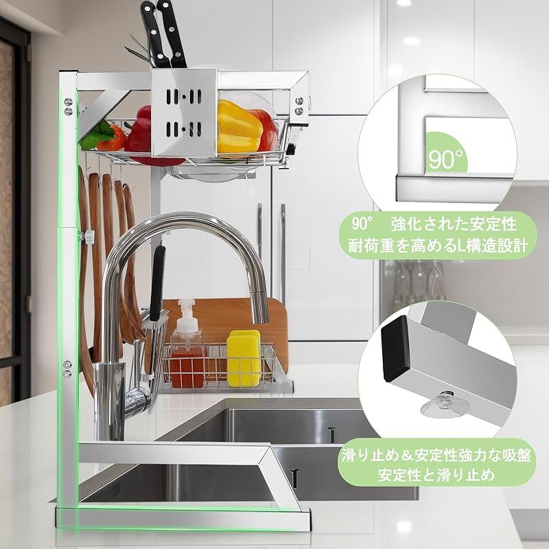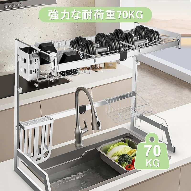 高品質素材: シンク上の食器乾燥ラックは高品質の304ステンレススチール製で、錆びたり腐食したりせず、耐久性を確保します。耐荷重は約50kgで、安定性が高く、キッチンで洗った食器を整理するのに便利です。