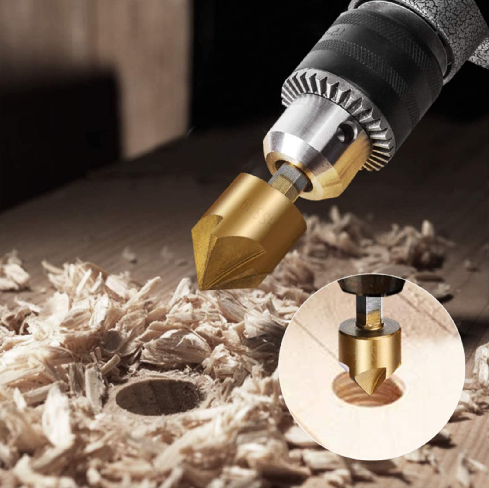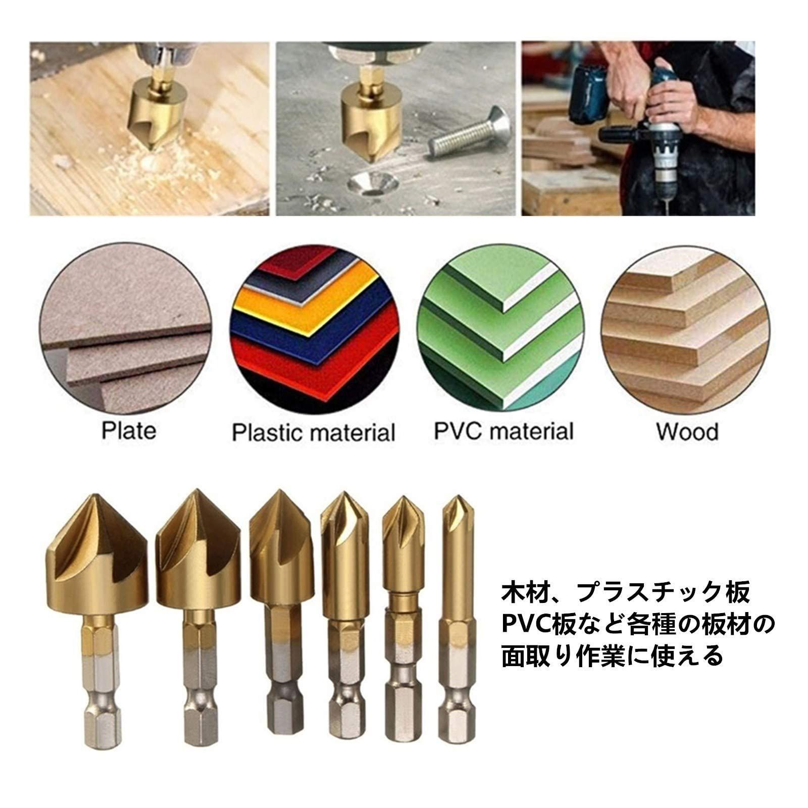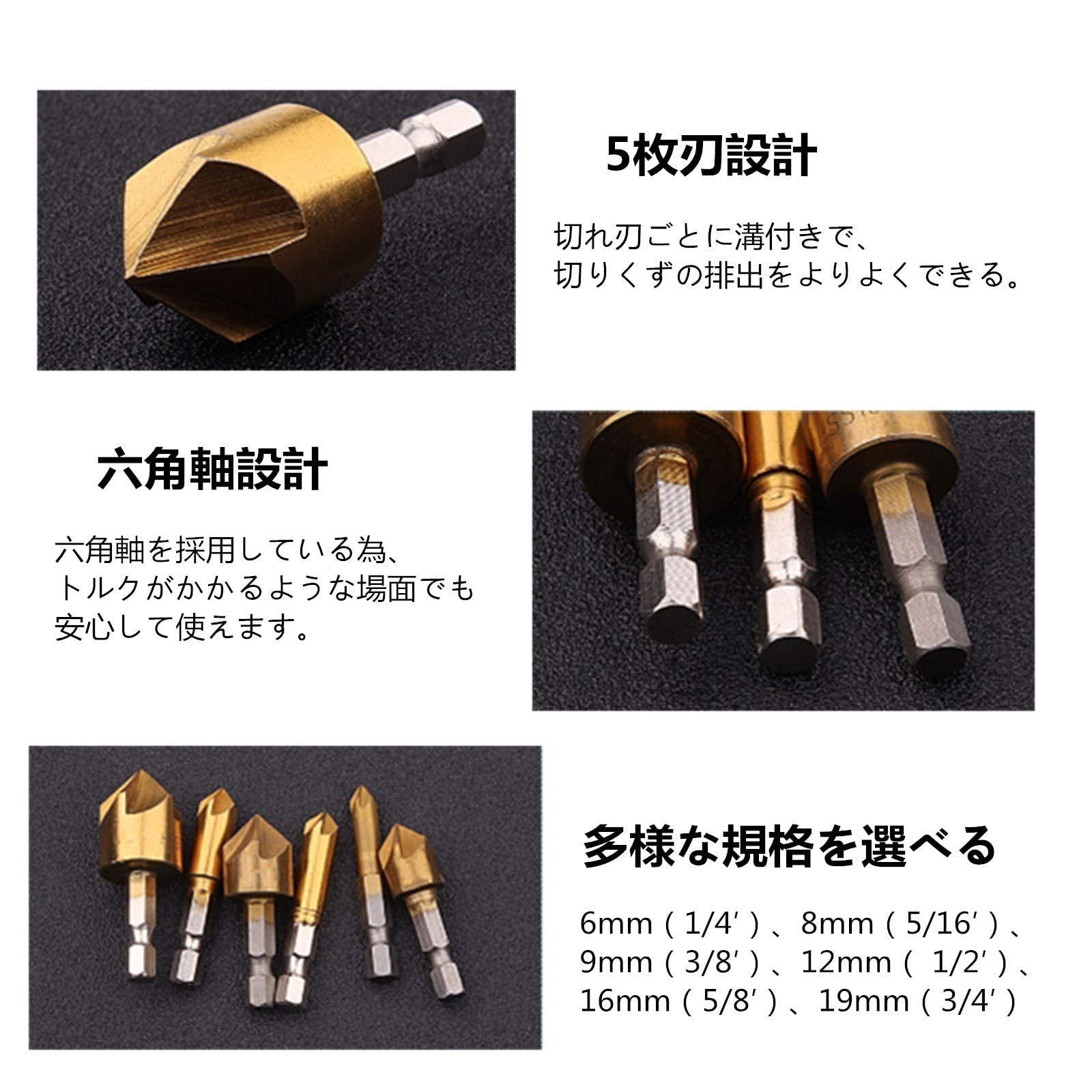 YFFSFDC 皿取り錐ドリル ビット 7本セット 6/8/9/12/16/19mm+1本自動センターポンチ 皿取錐 下穴錐 座ぐり 面取りカッター バリ取り セット 六角軸 5枚刃 チタンコーティング ドリルビット