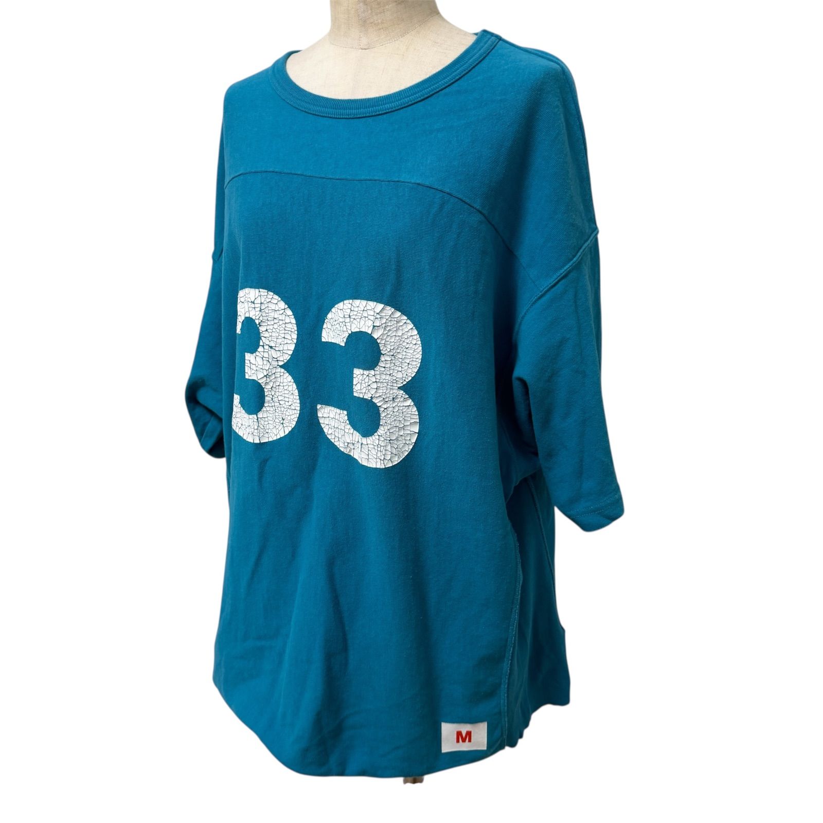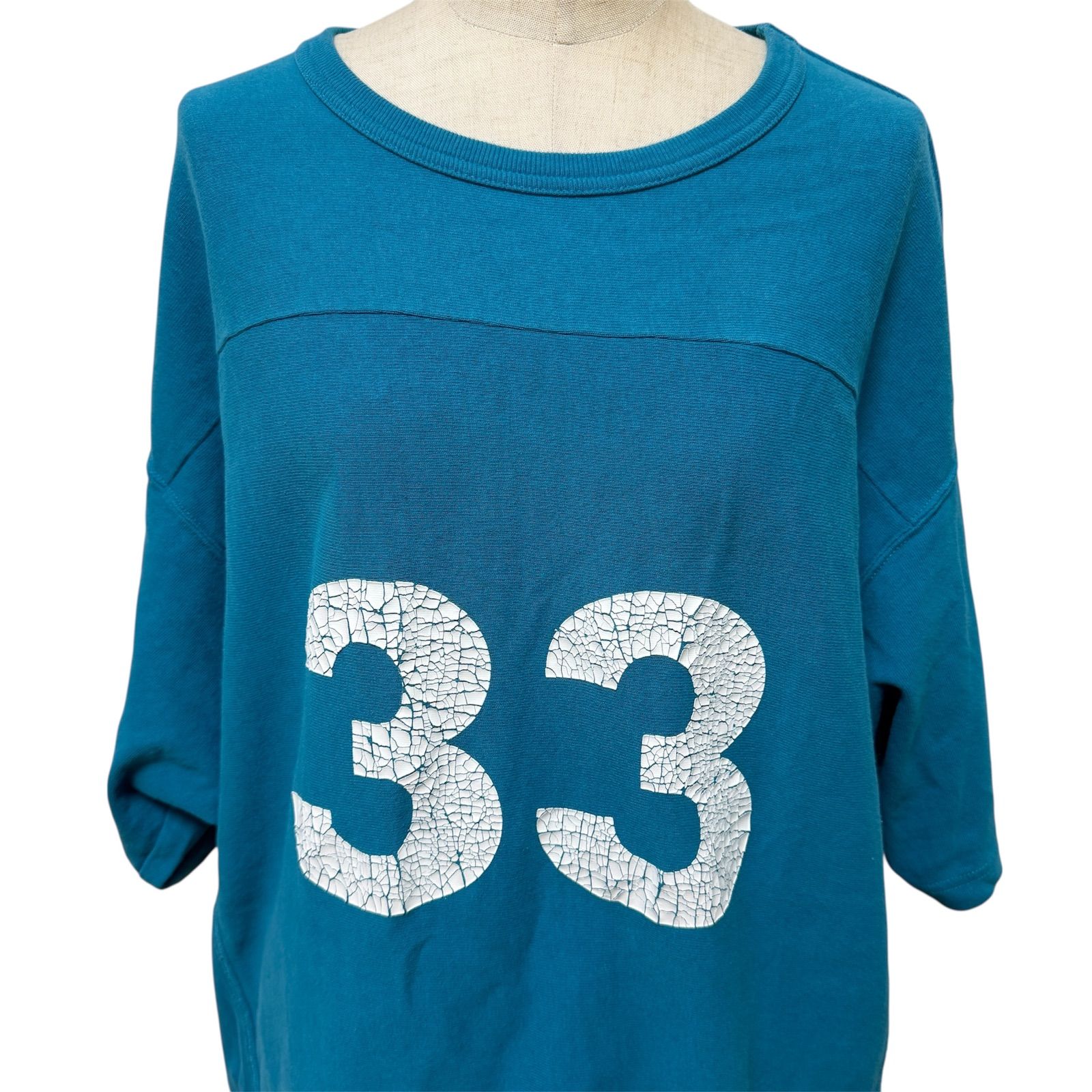 最大の特徴は、フロントに施された「33」のナンバリングプリント。ヴィンテージファンにはたまらない、経年変化によるひび割れ(クラック)加工が絶妙な仕上がりとなっており、現行品には出せない唯一無二の雰囲気を醸し出しています。