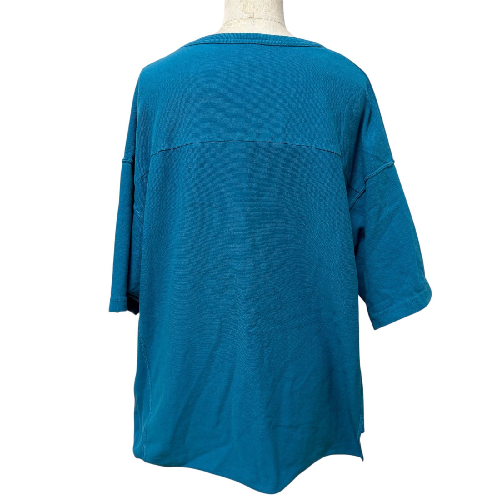 リバースウィーブならではのヘビーウェイト(厚手)なジャージー素材を使用しているため、タフで型崩れしにくく、着込むほどに肌に馴染みます。カラーは珍しい深みのあるターコイズブルー(青系)で、デニムやチノパンとの相性も抜群。