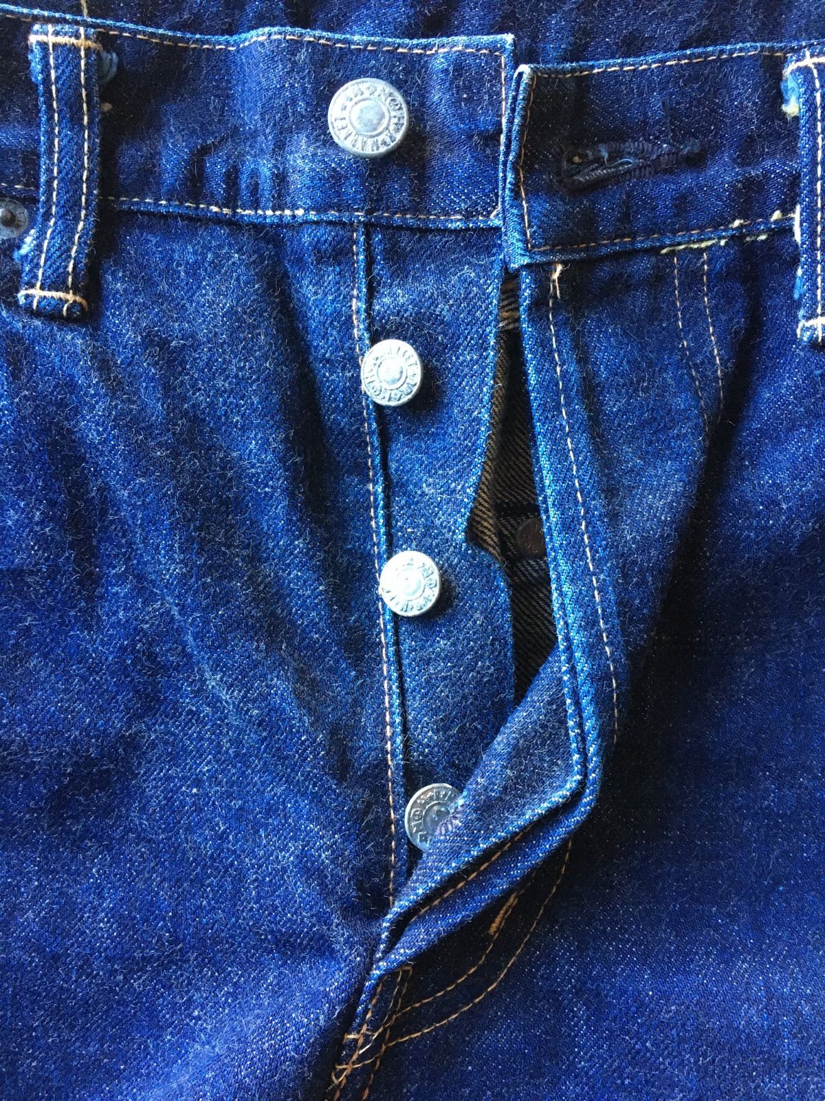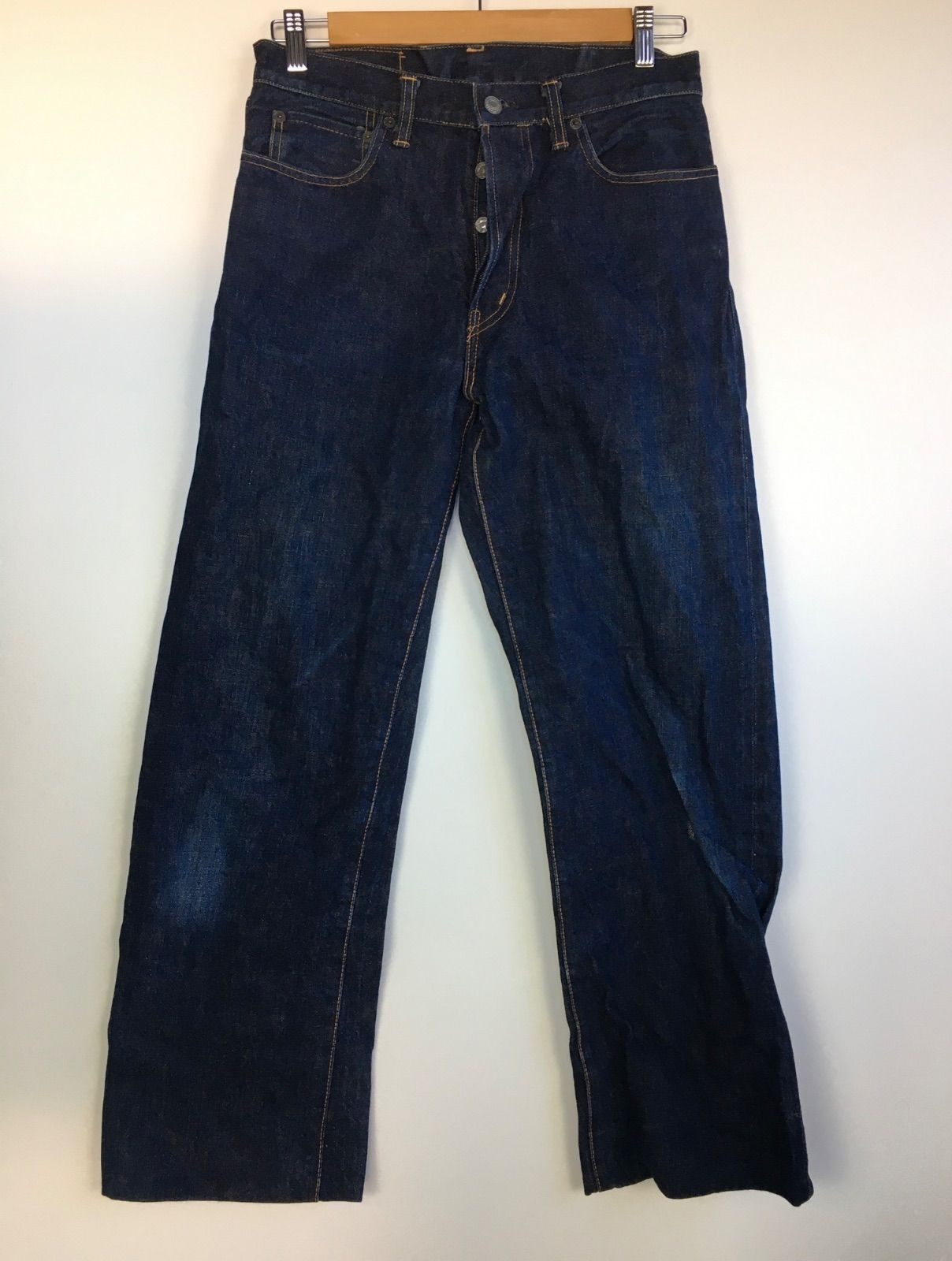 程よい厚みのデニム生地を使用した、オーソドックスな5ポケットジーンズです。フロントはクラシックなボタンフライ仕様で、自然な色落ち加工が施されたしっとりとした質感のブルーが特徴です。ストレートに近い綺麗なシルエットで、幅広いカジュアルスタイルに重宝します。