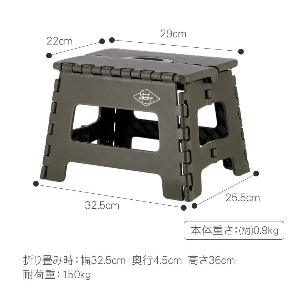 横幅:32.5cm 奥行:22.5cm 高さ:22cm 座面29×22cm 折り畳み時:32.5×4.5×36cm 重さ:0.9kg 耐荷重150kg 素材:ポリプロピレン(本体) TPR(滑り止め)