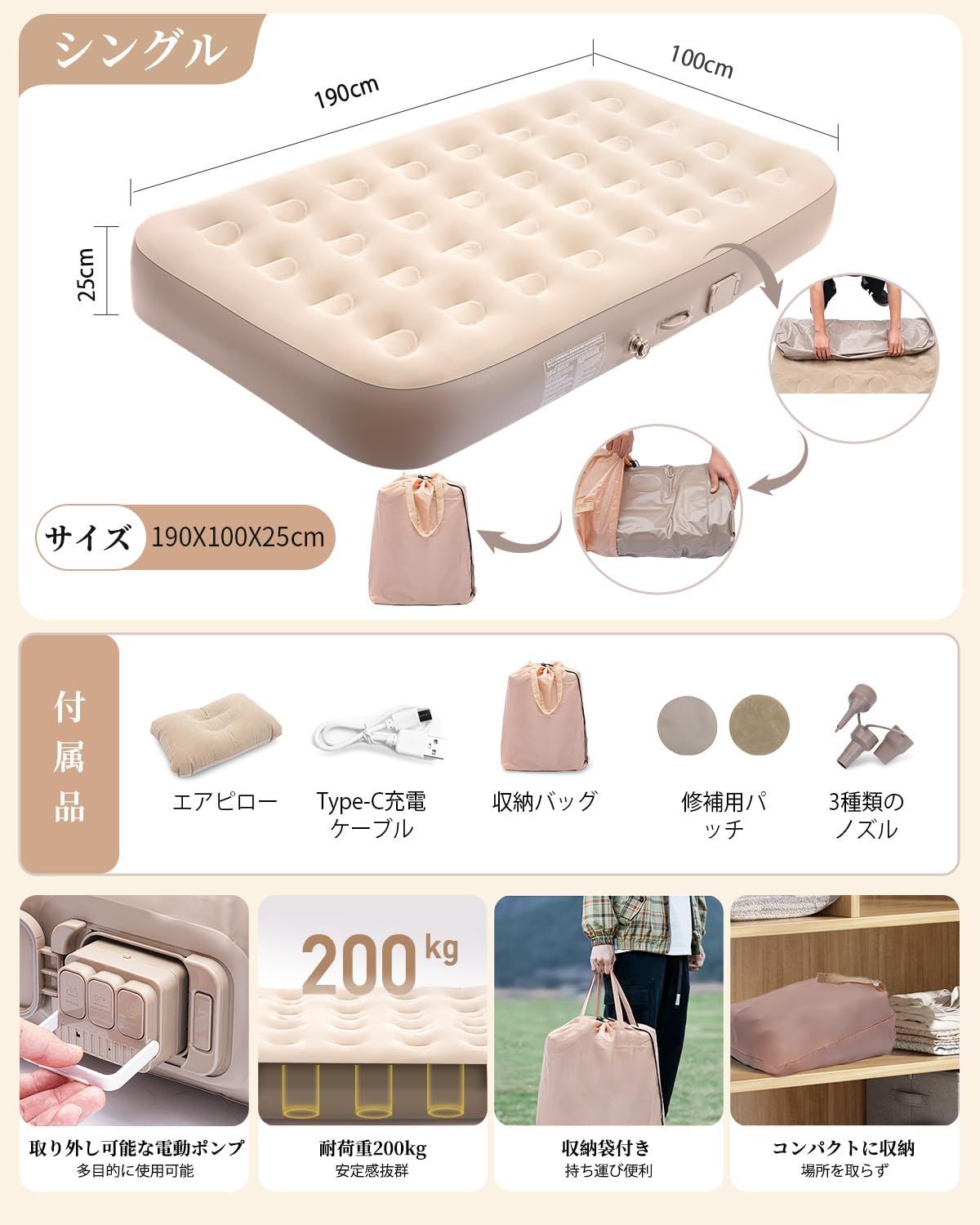 ♀♀【安心のアフターサービス・12ヶ月の付き】ご購入いただいたエアーベッドは、購入日から12ヶ月間のが適用されます。期間が終了しても、延長や製品に関するご疑問や問題があれば、お気軽にお問い合わせください。豪華な5点セットが付属しています:エアピロー、3種類のノズル(様々なエアー製品に対応可能)、Type-C充電ケーブル、収納バッグ、修補用パッチ(万が一の破損にも迅速対応)。さらに、日本語取扱説明書も同梱されていますので、初めての方でも安心してご使用いただけます。