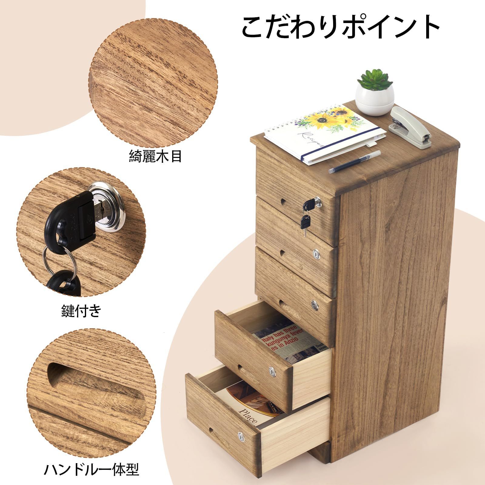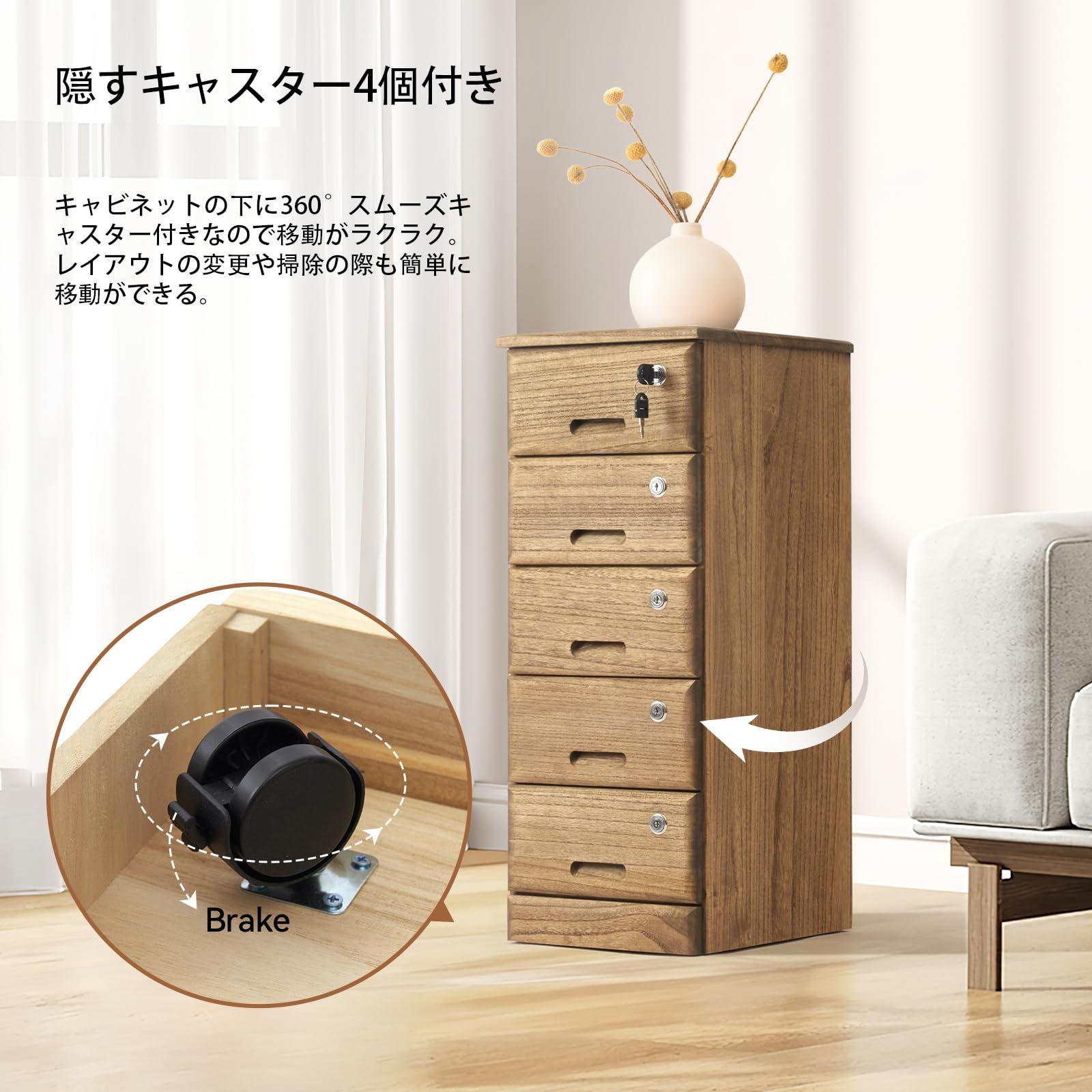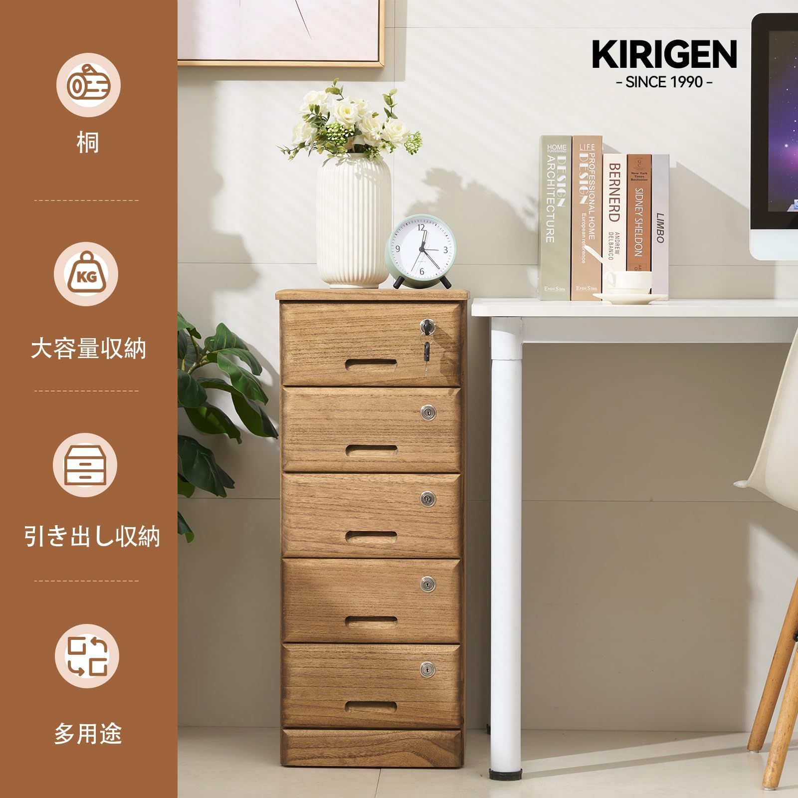 KIRIGEN 天然木 キャビネット 完成品 オフィス 袖机 5段 チェスト デスクワゴン 全段鍵付 キャスター付き A4対応 植物オイル塗装仕上げ ブラウン