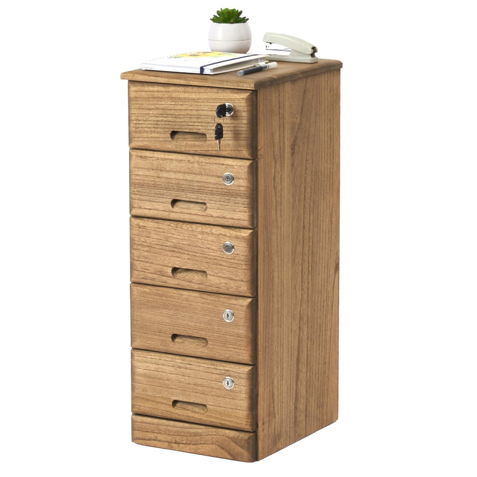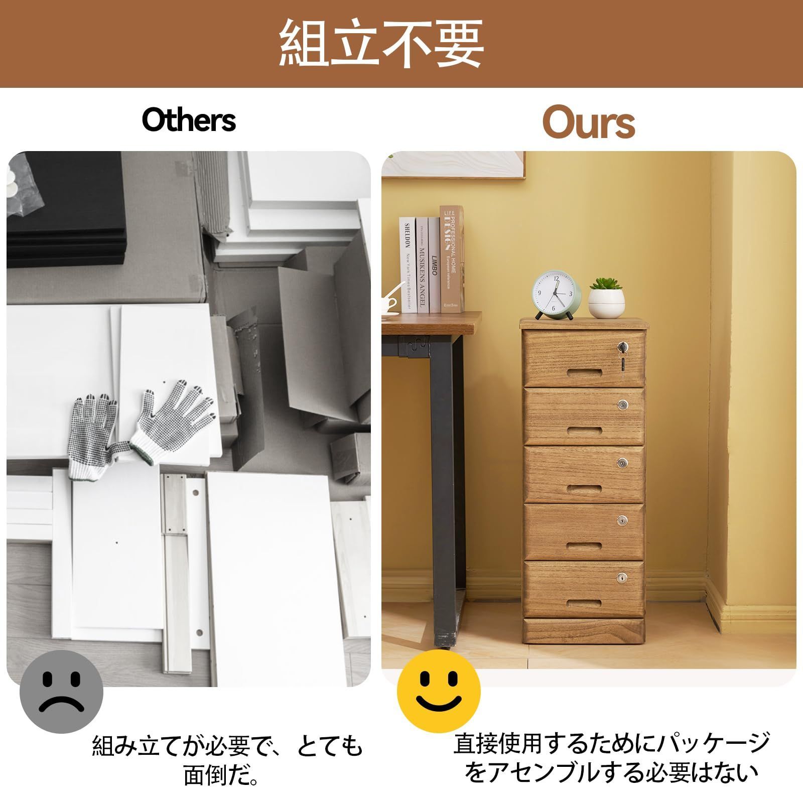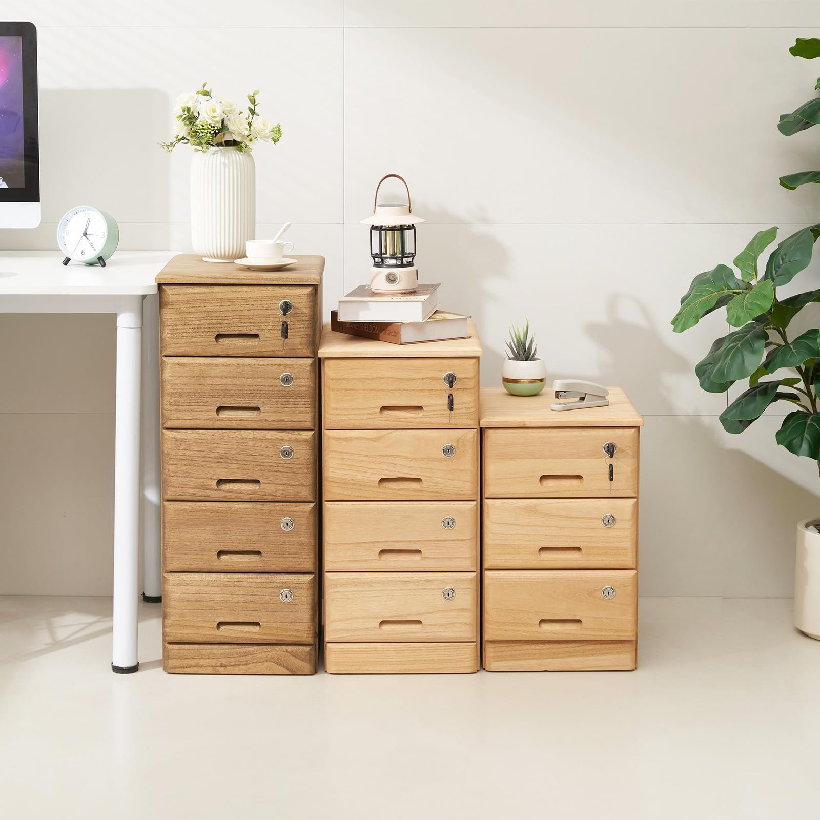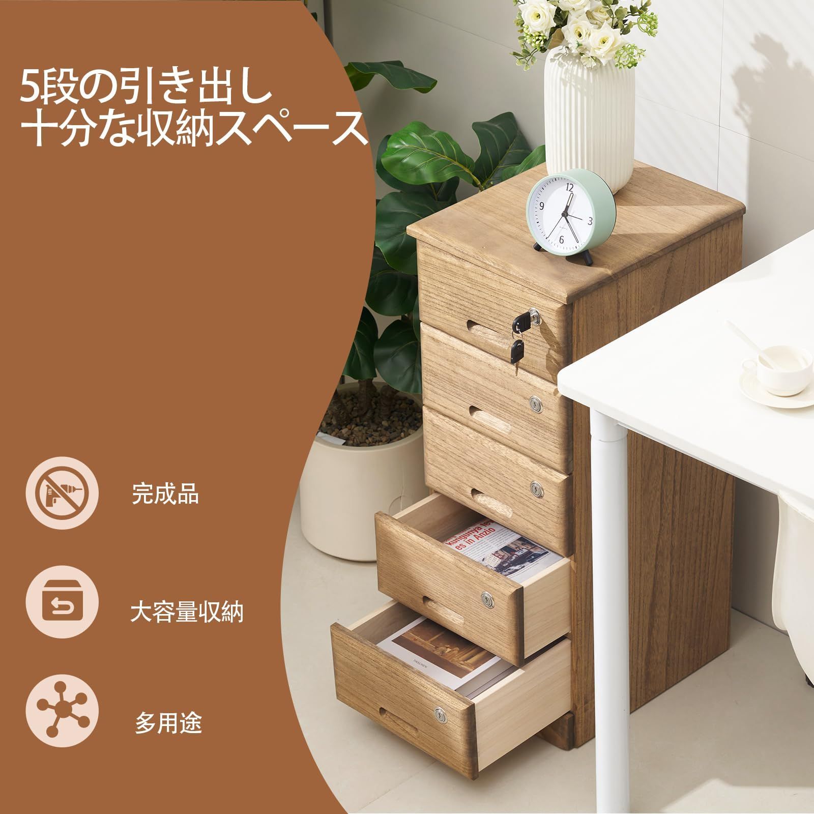 KIRIGEN 天然木 キャビネット 完成品 オフィス 袖机 5段 チェスト デスクワゴン 全段鍵付 キャスター付き A4対応 植物オイル塗装仕上げ ブラウン