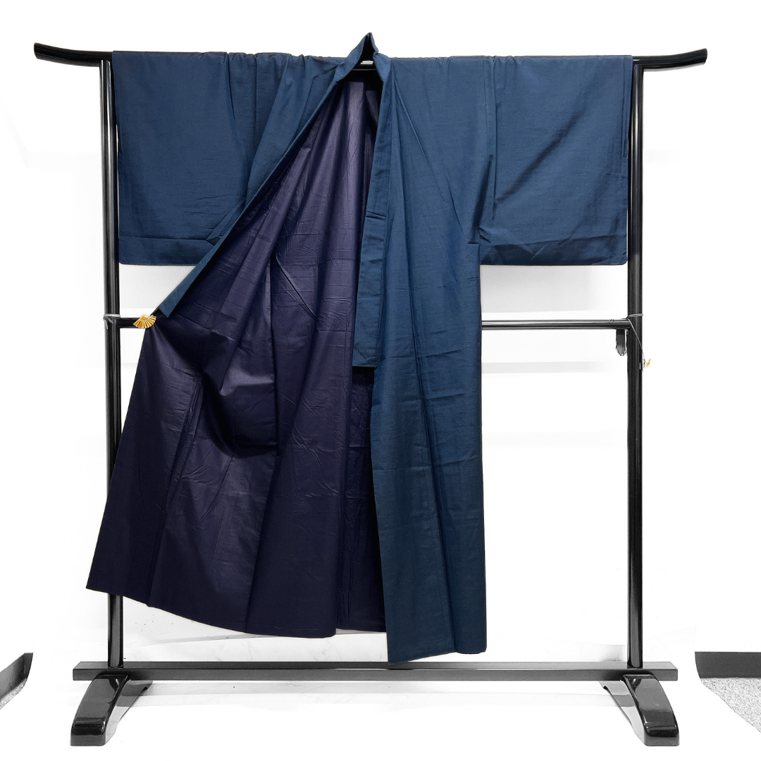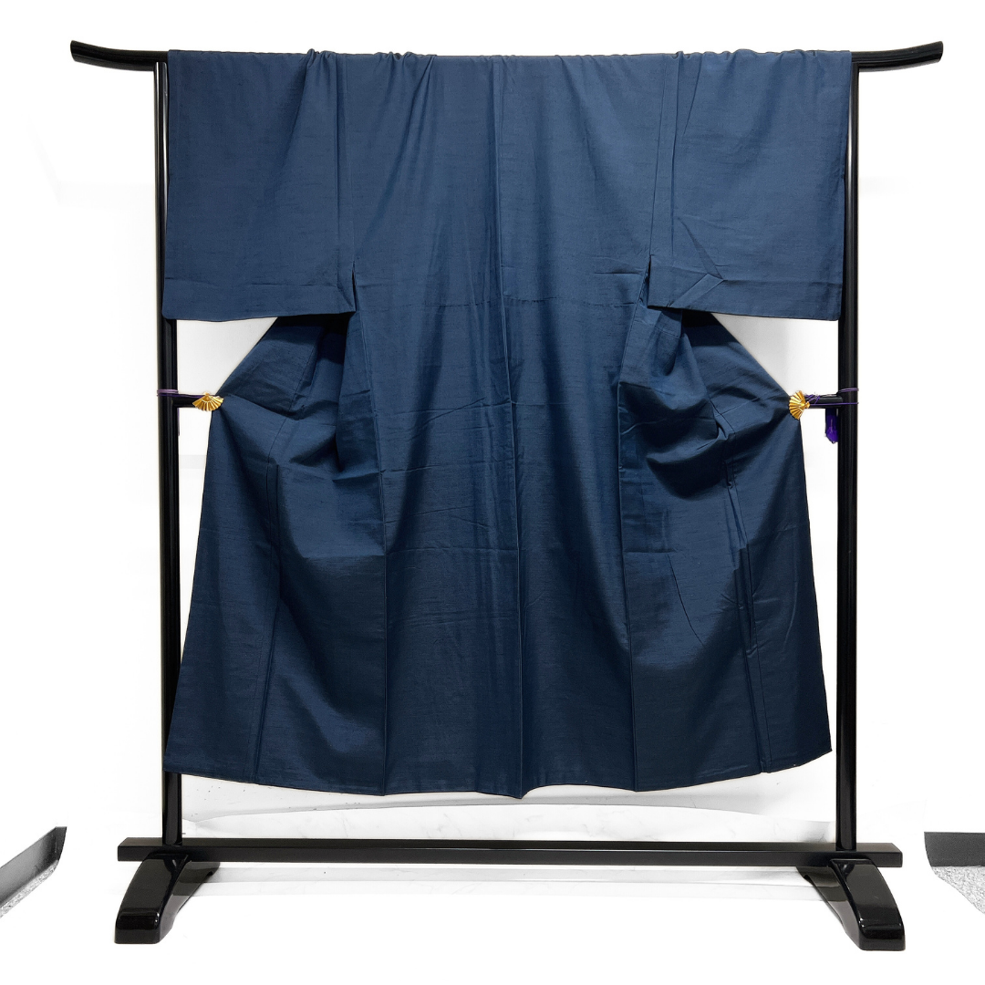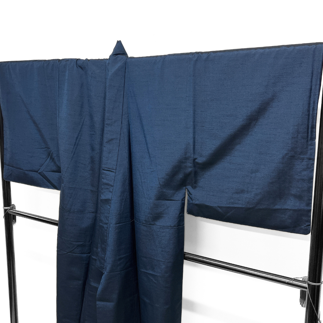 本場真綿絢結城紬で織られた深いネイビーのお色味がお洒落な雰囲気の一着です。