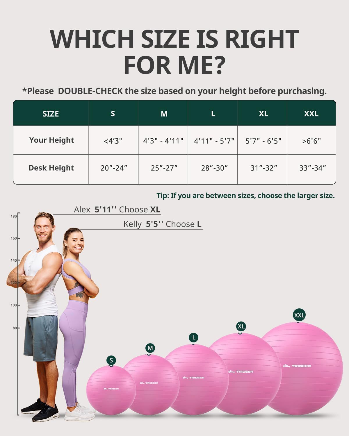 Trideerエクササイズボールには、クイックインフレーションポンプ(ハンドポンプを装備した45/55/65cm、フットポンプ搭載、75/85cm)、エアストッパー2つ、詳細な説明書が付属します。すべてのニーズを満たす5つのサイズをご用意しています。