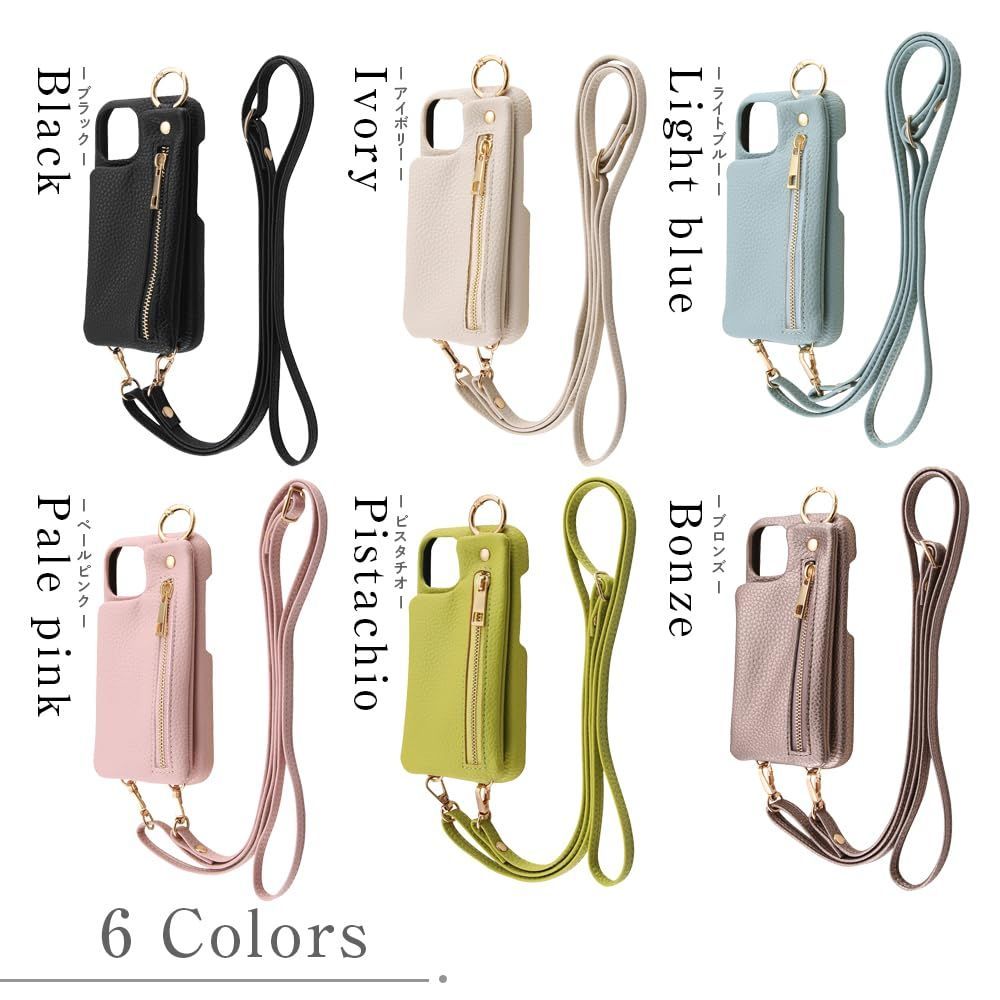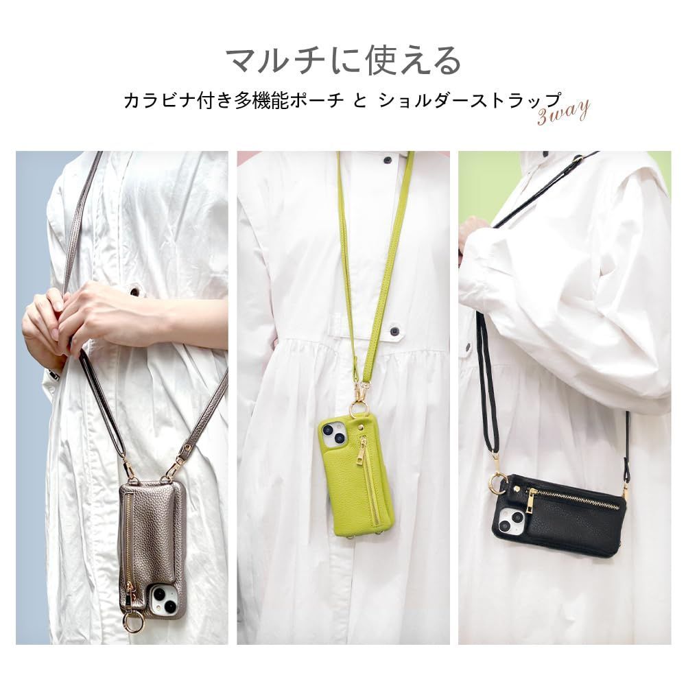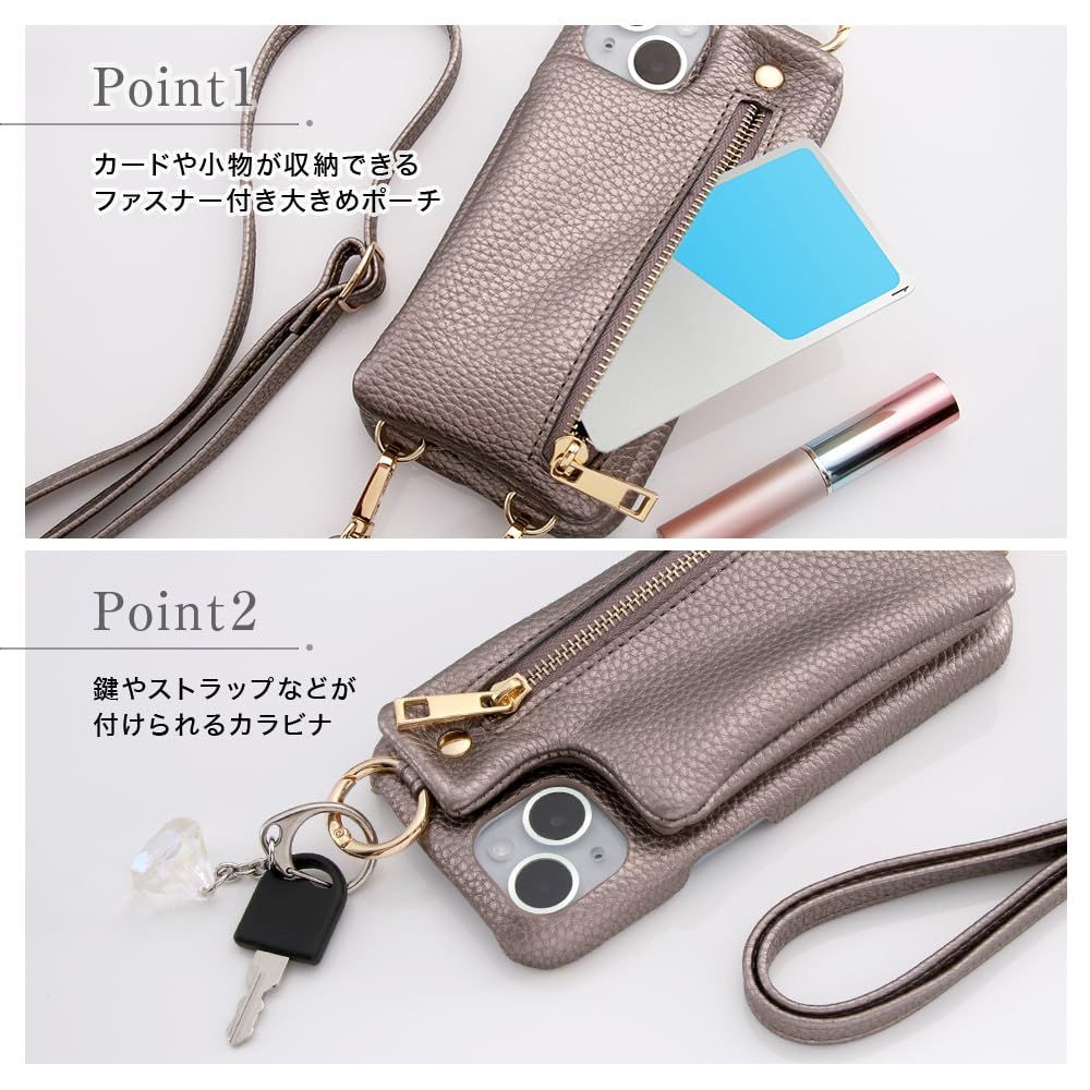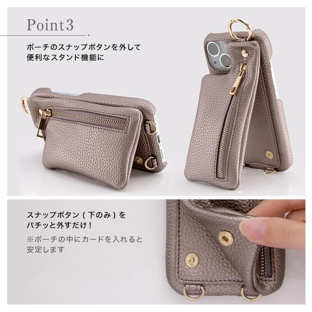 カードやリップなどが入る便利なポーチ付き!。ポーチはスタンドとしても使用可能。ショルダーストラップは長さ調整が可能。