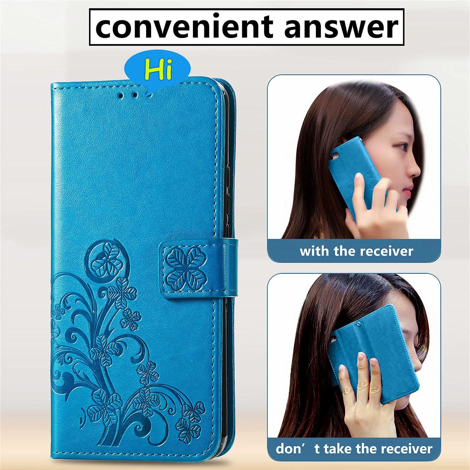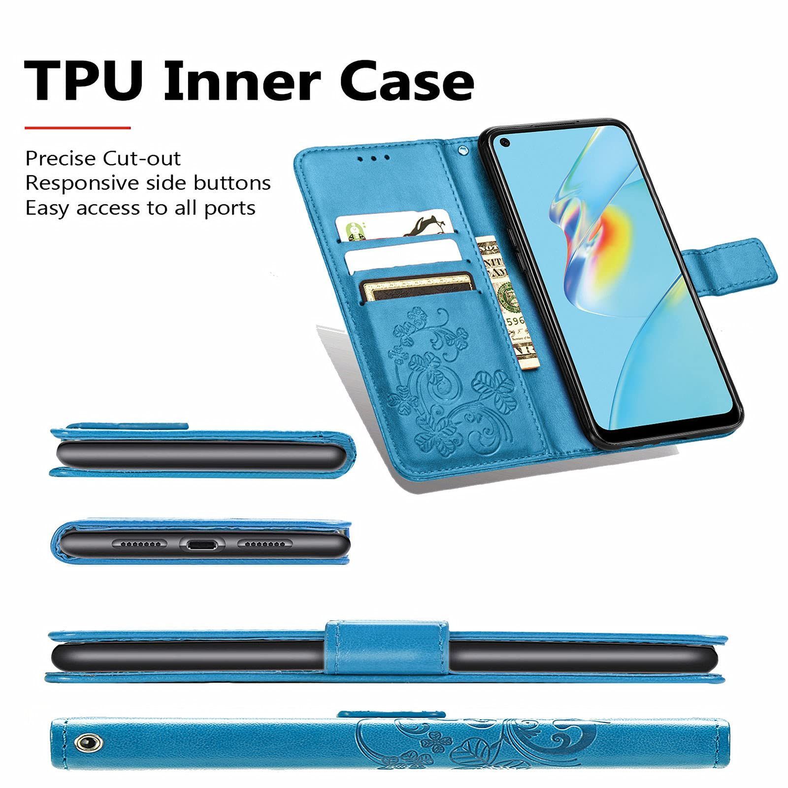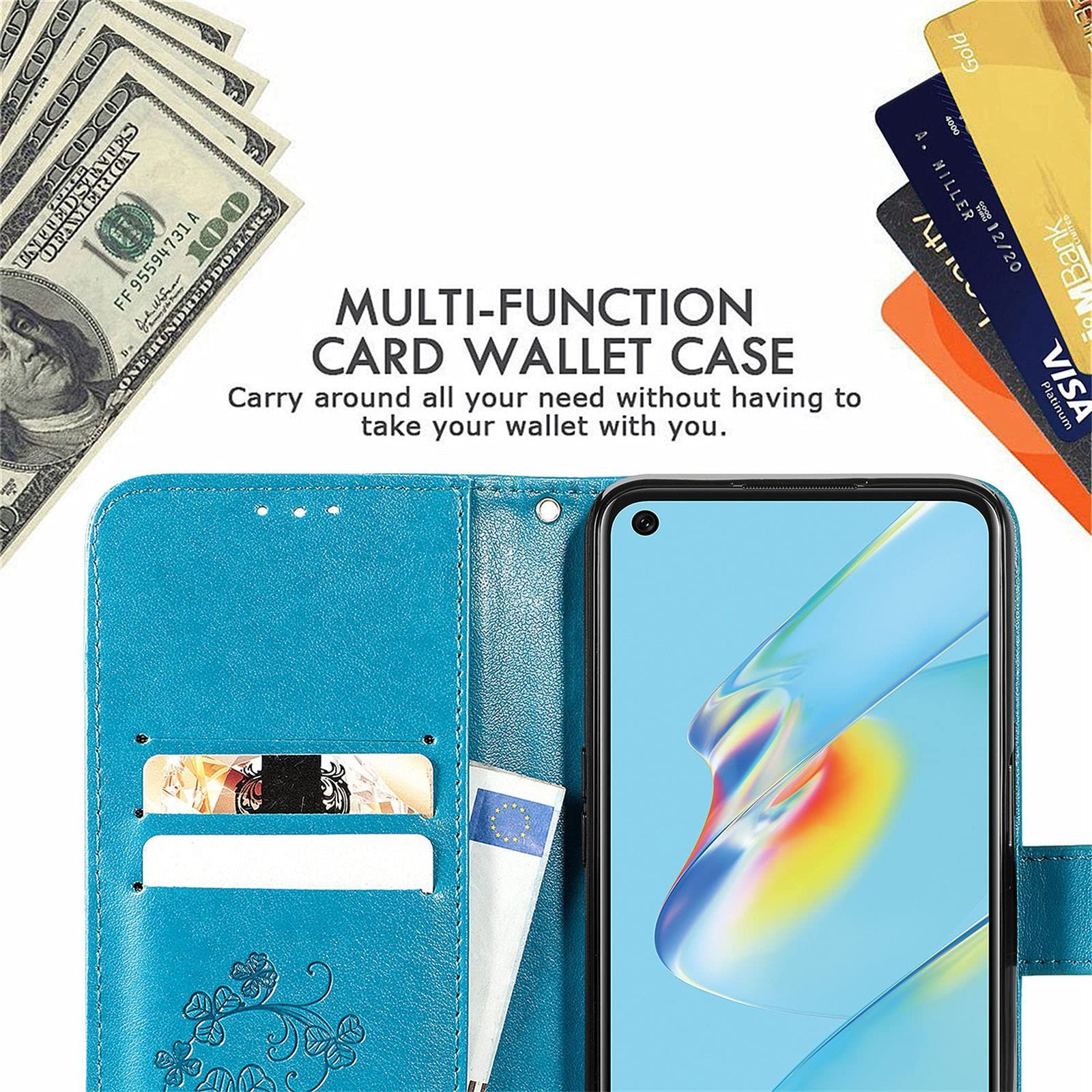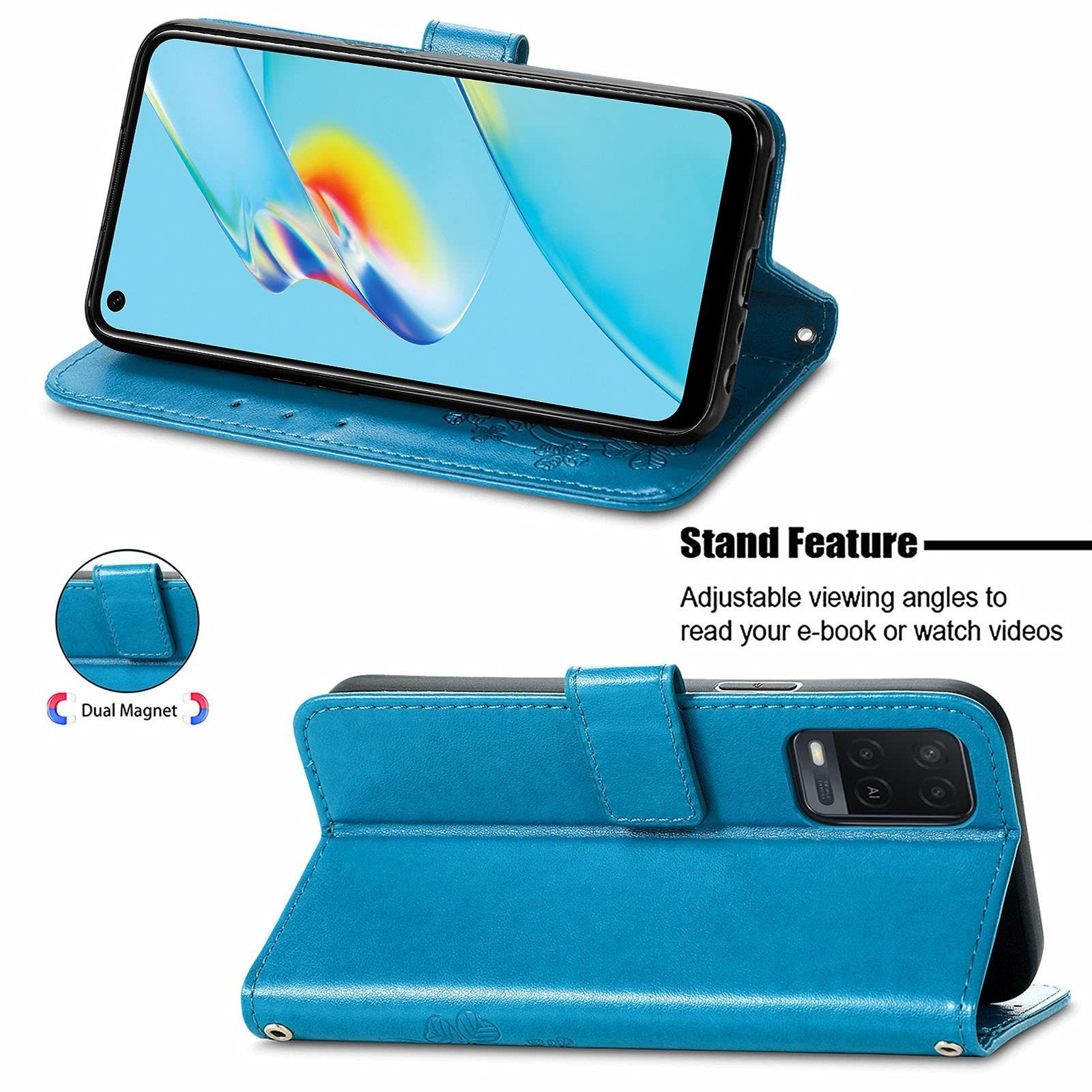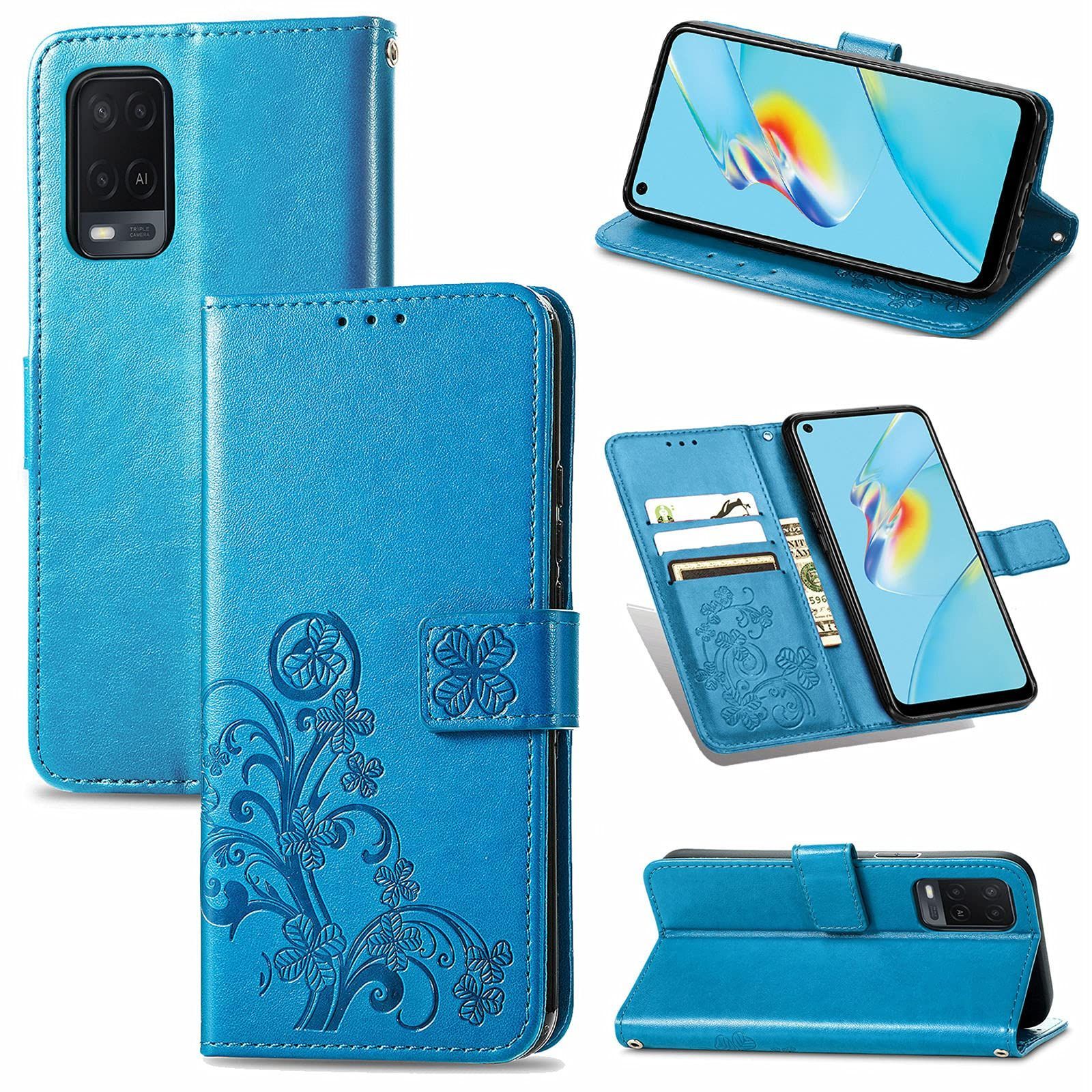 OPPO A54 5G au OPG02 / OPPO A74 5G / OPPO A93 5G ケース 手帳型 ノートブック型携帯電話保護カバー多機能携帯電話ホルスター財布携帯電話ホルダーバンプパターンテクスチャ耐久性摩擦耐性携帯電話ケース男性と女性に適した多色オプション (四つ葉のクローバーブルー)