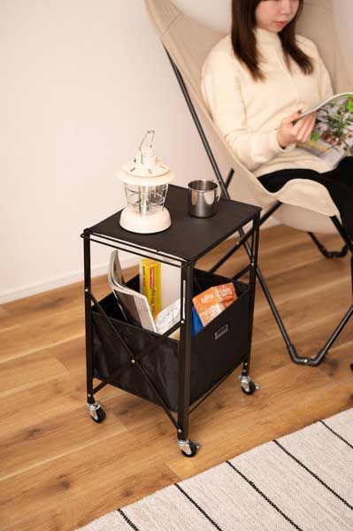 おしゃれ シリーズ リーズナブル 安い シンプル かっこいい スタイリッシュ デスクワゴン キッチンワゴン サイドテーブル ナイトテーブル トレー天板 トレイ天板 フォールディング 折り畳める マルチ 屋外 野外 ソファサイド 木板 カラーバリエーション 色違い 黒色
