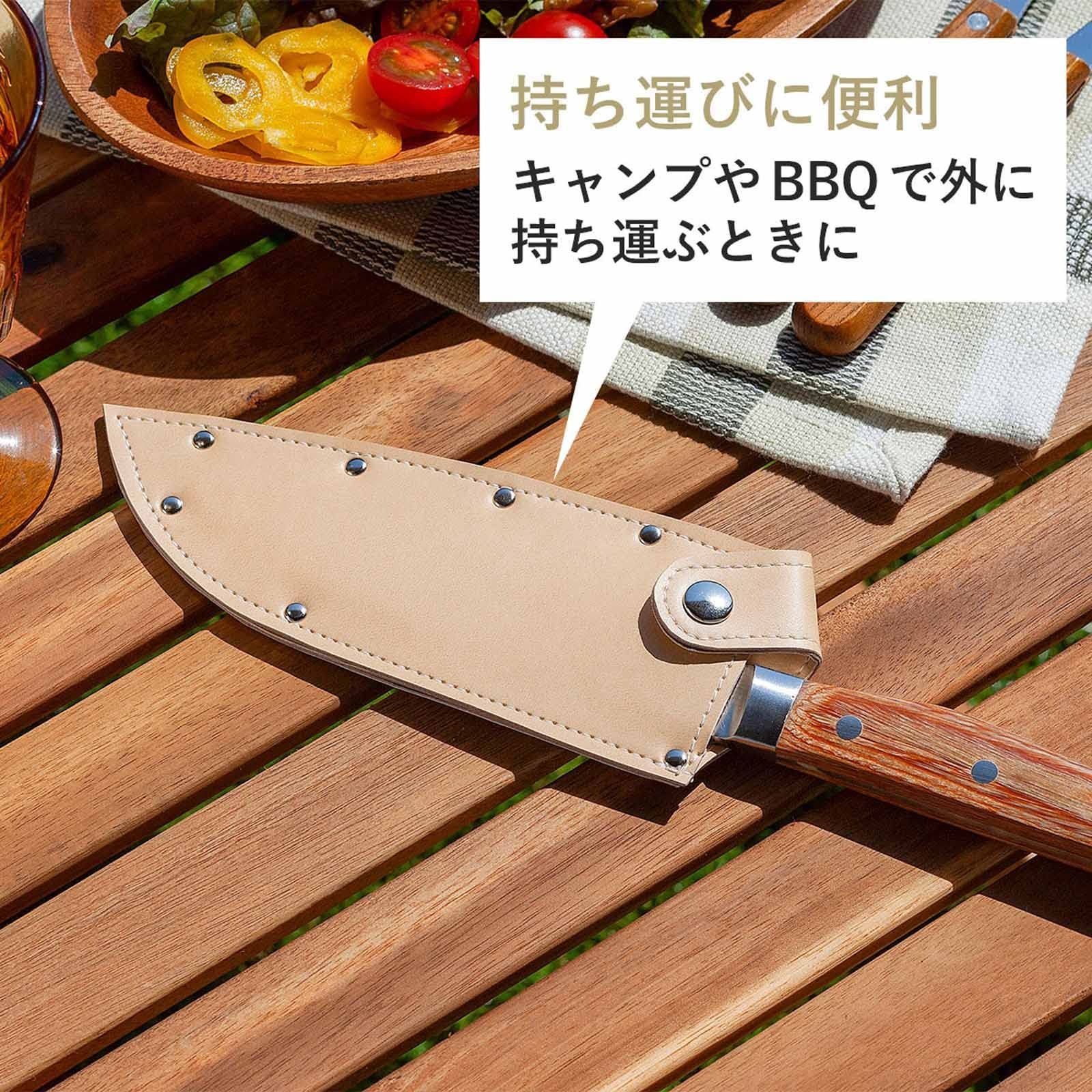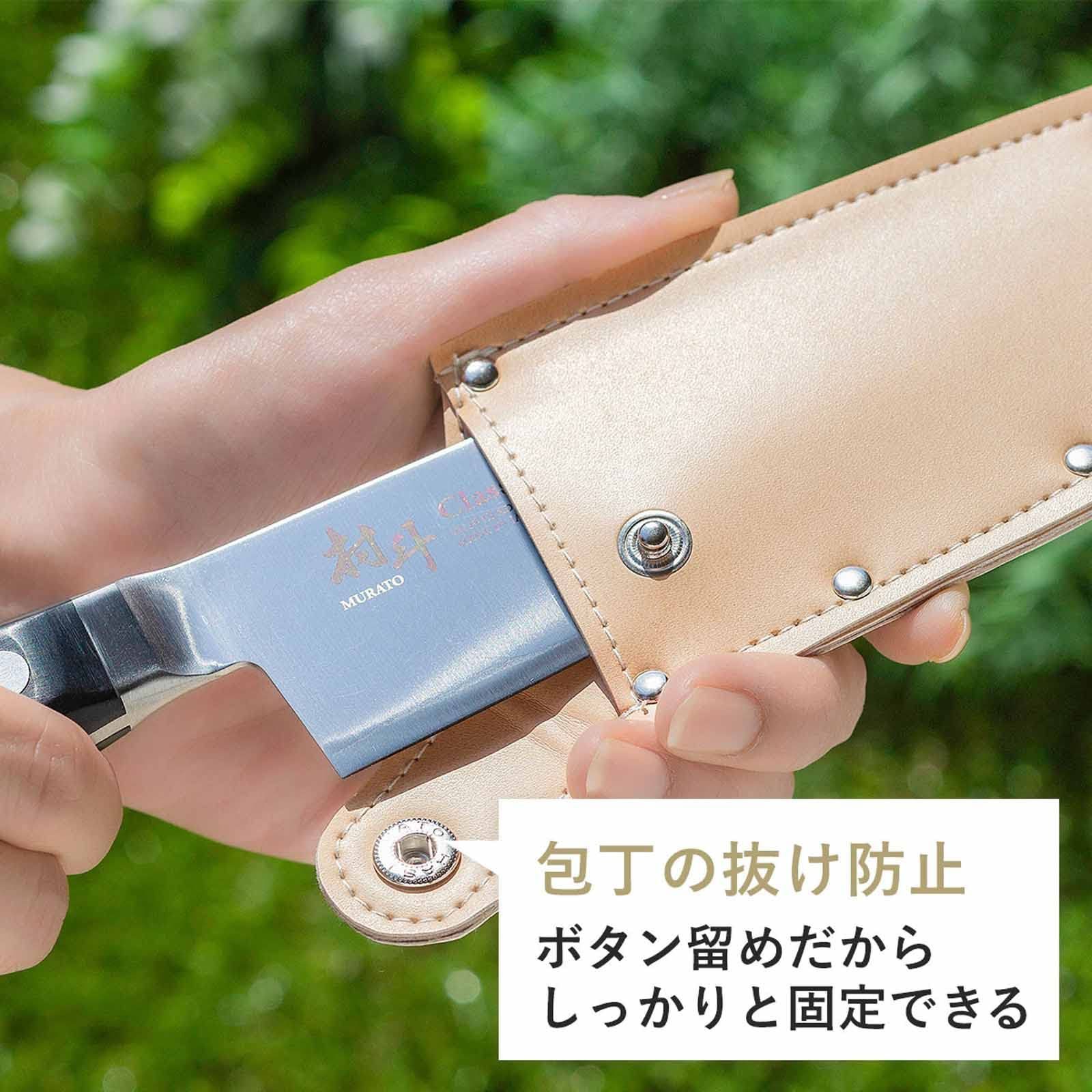 三徳包丁ケース。シンプルで入れやすい形柄の付け根をボタンで留めるだけで抜けを防止できる普段よく使う包丁をアウトドアへ持ち込める便利なケース