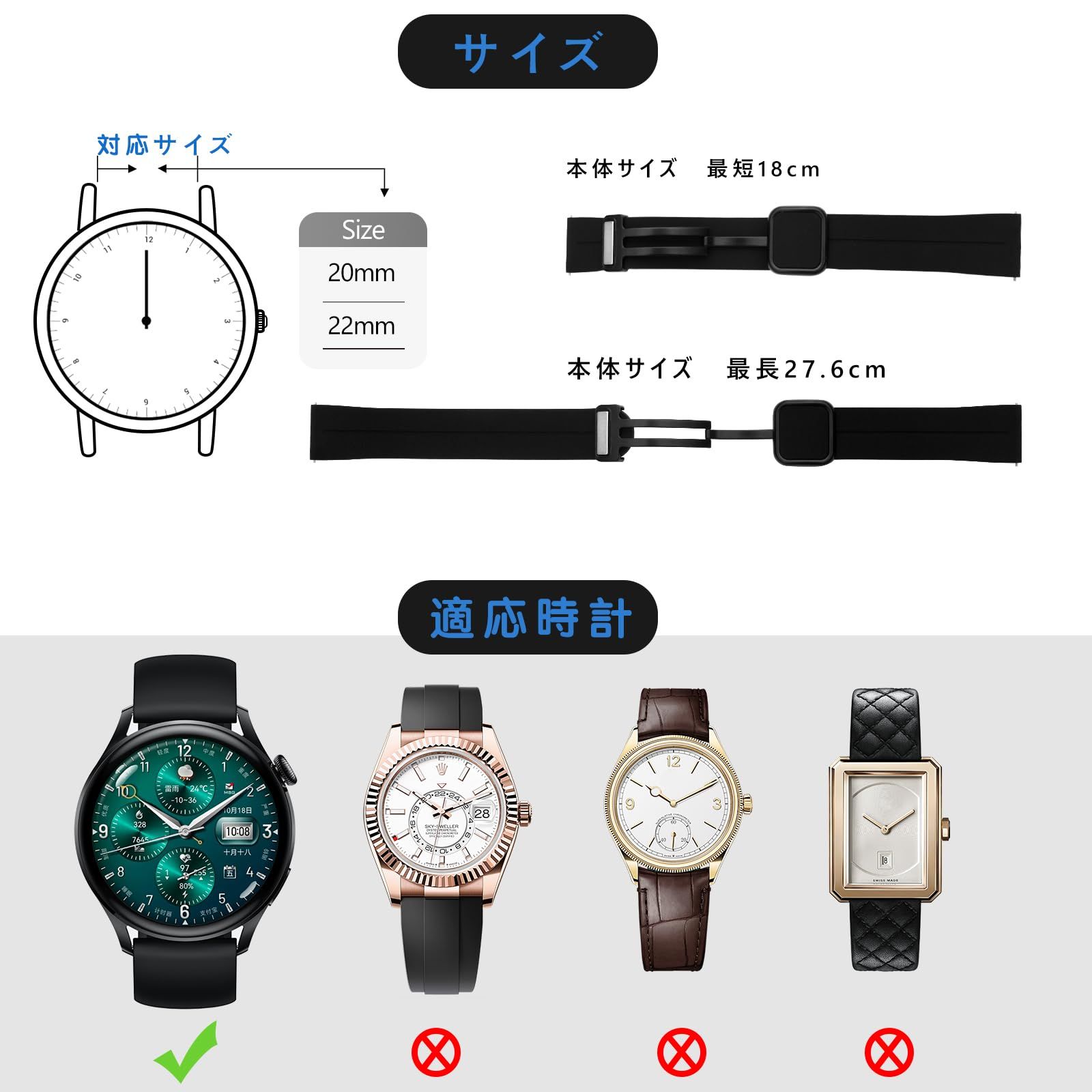 【環境にやさしく快適&防水性】時計ベルトは高強度の環境にやさしいシリコン製です。 太陽の下での黄変、可塑剤、油、汚れに強い、汚れに強い、手触りが柔らかく、弾力性があり、柔らかく快適です。完全防水なので、日常生活だけでなく、プールや海などのマリンスポーツでも使用することができます。