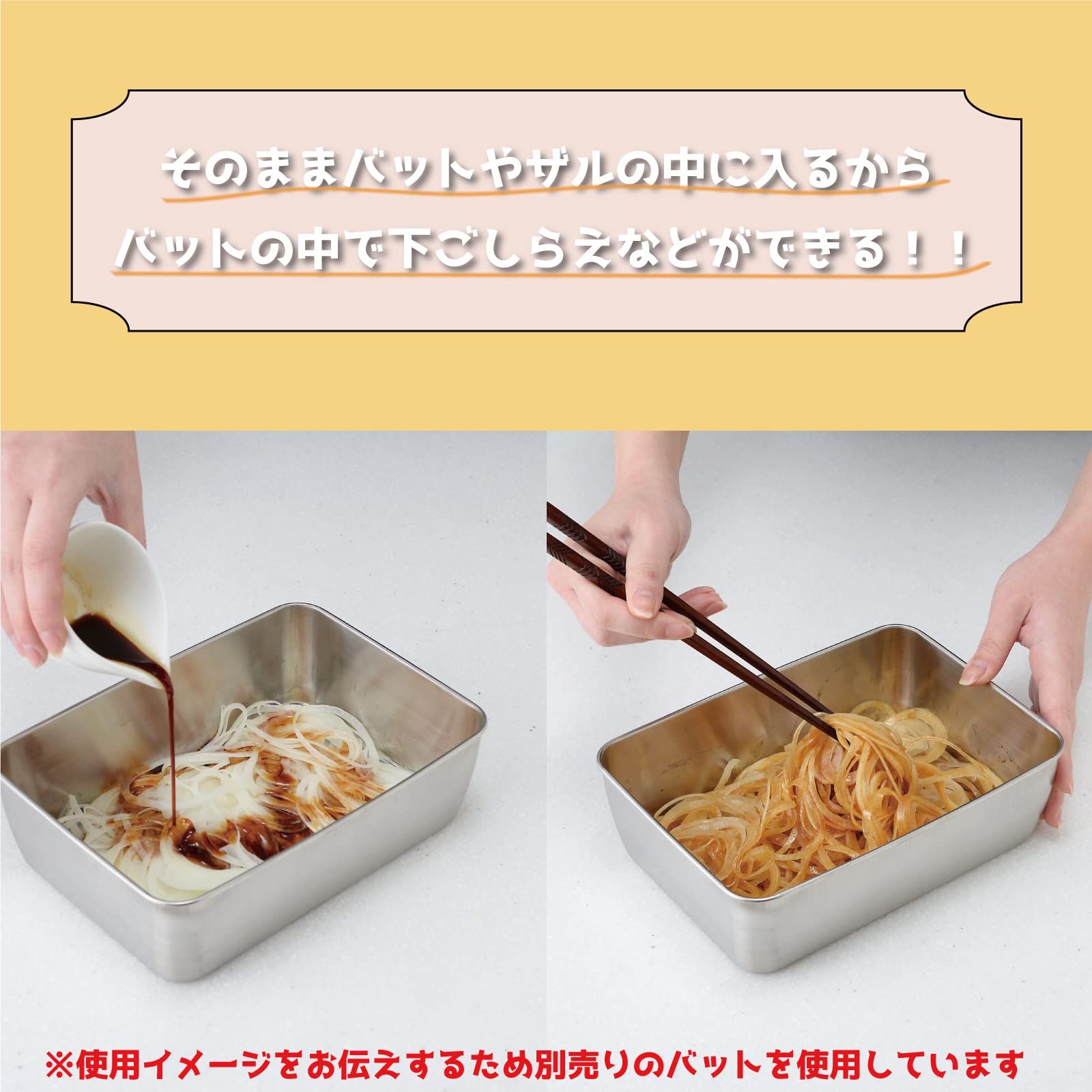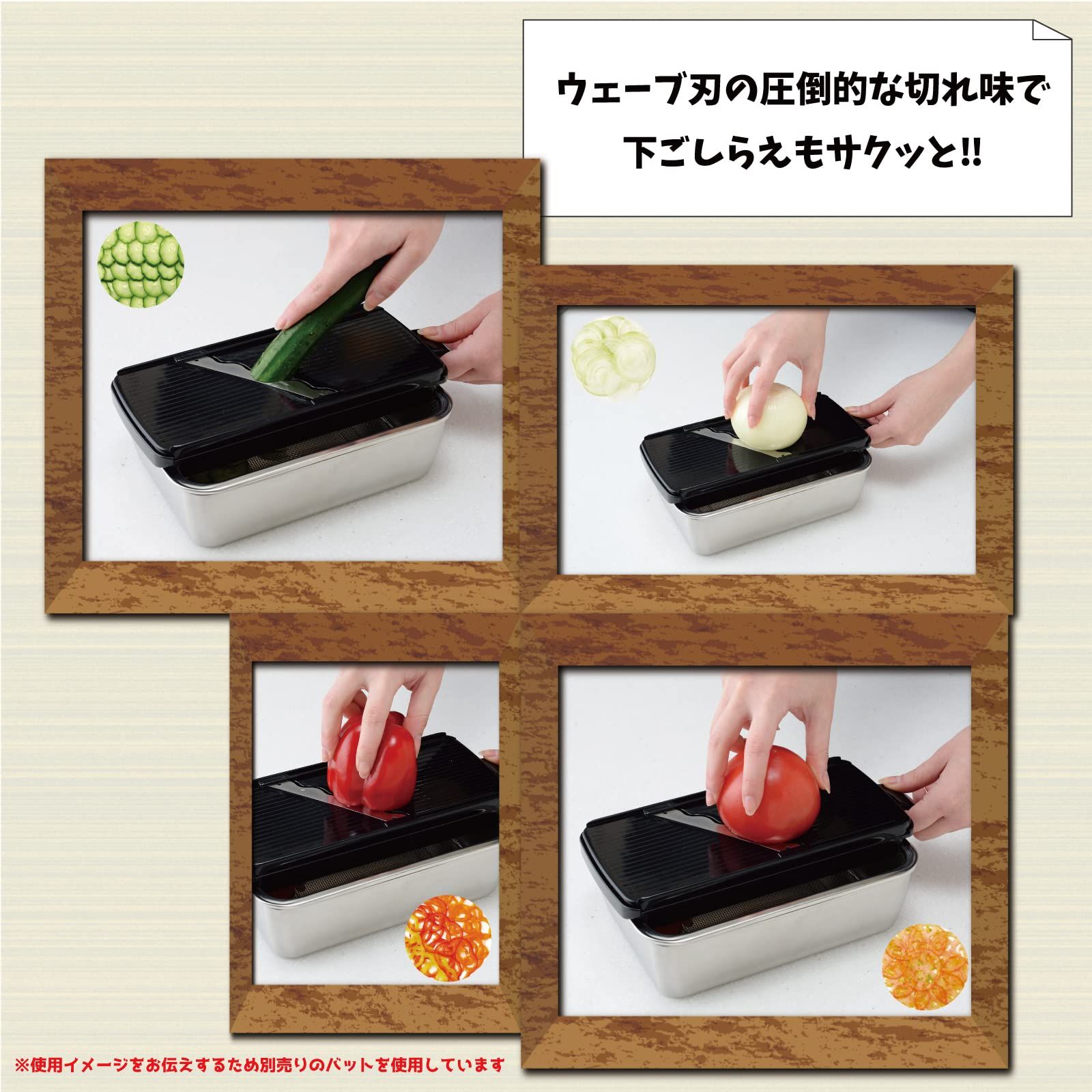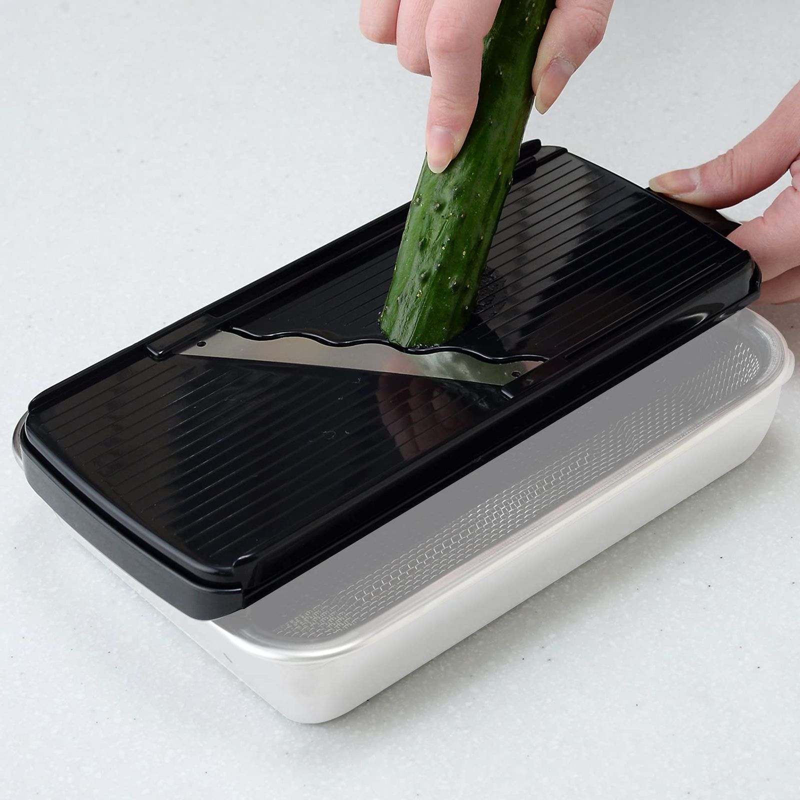 専用の角型バット、ザルにセットしてスライスすれば、バットの中でそのまま下ごしらえしたり、ザルをセットして水を入れておけば、そのまま水さらしや水切りなどにも使える