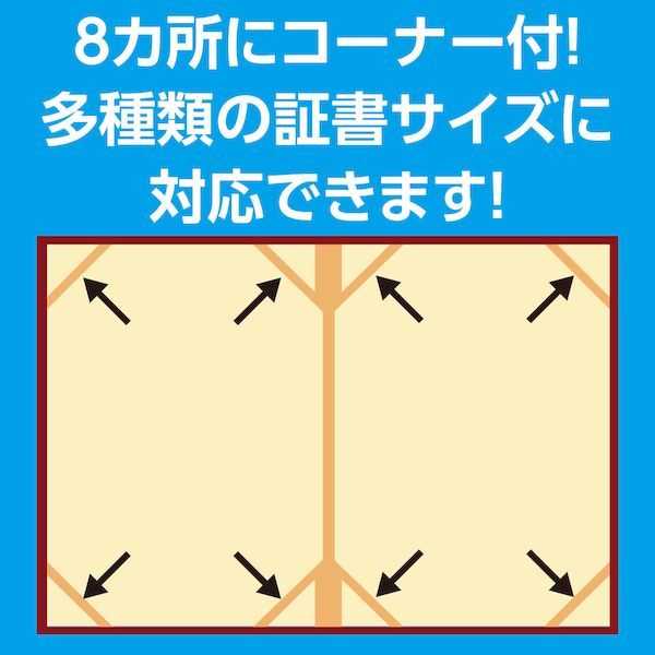 ●品質にこだわった、格調高いスエードの証書ファイルです。卒業証書や卒園証書だけでなく、感謝状や認定証、免状なども収めるのに便利なファイルです。曲がりや衝撃に強いパッド有りタイプ。8カ所にコーナーがついており、片面・見開きのどちらにも対応しています。さまざまなサイズに対応が可能です。証書適合サイズ:420×297~430×299mm、297×210~299×215mm。別売の「5940:コーナーポケットシール」を好きな位置に貼れば、適合サイズよりも小さい証書を固定することができます。