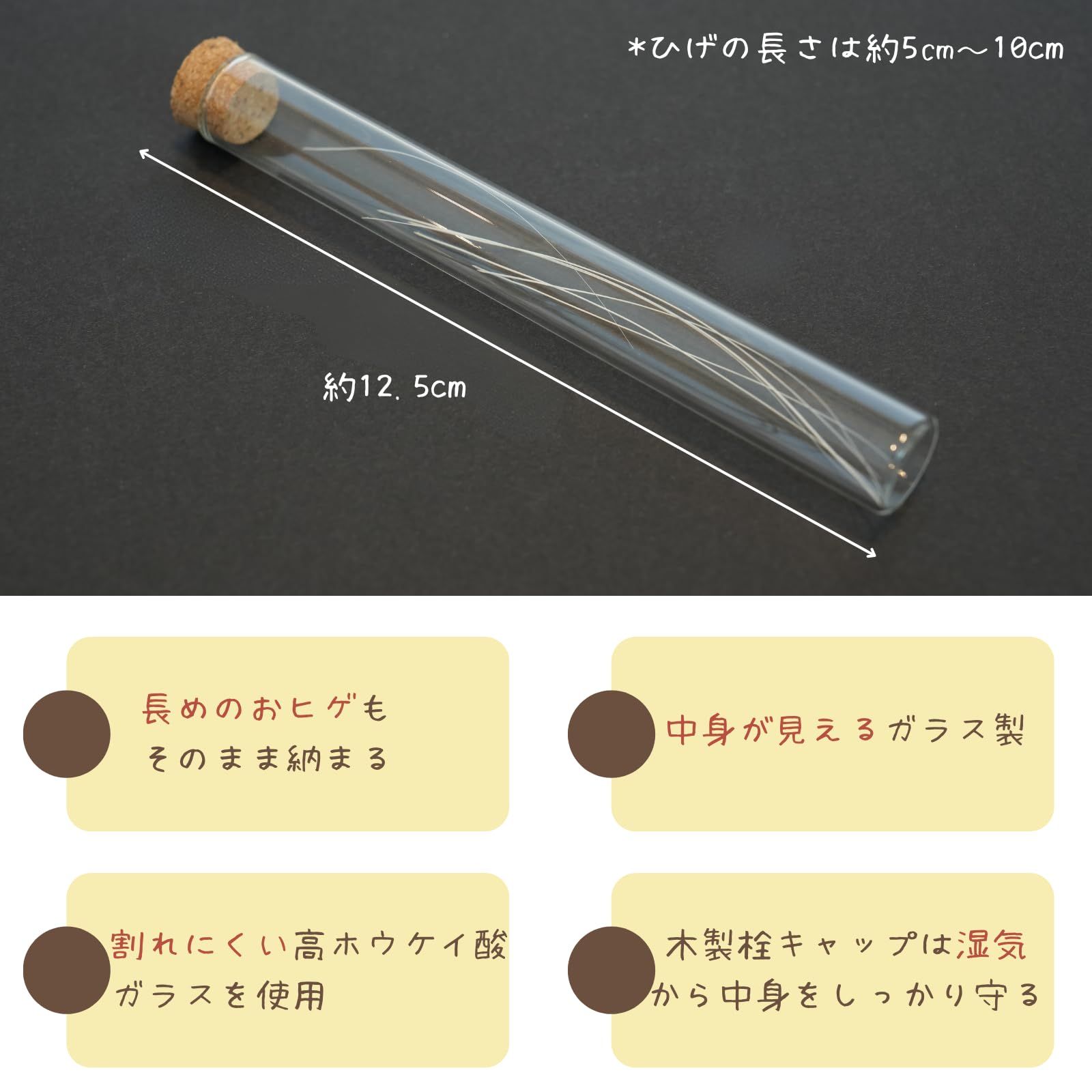 【まっすぐ入る。ヒゲ専用サイズの透明ガラス瓶】猫のヒゲは意外と長くて、普通の瓶だと曲がってしまうことも。 このボトルは猫のヒゲがそのまま入る長さに設計されているので、きれいな形で保存できます。そして、透明なので、まるで小さな宝物のよう。いつでも中が見えて安心です。