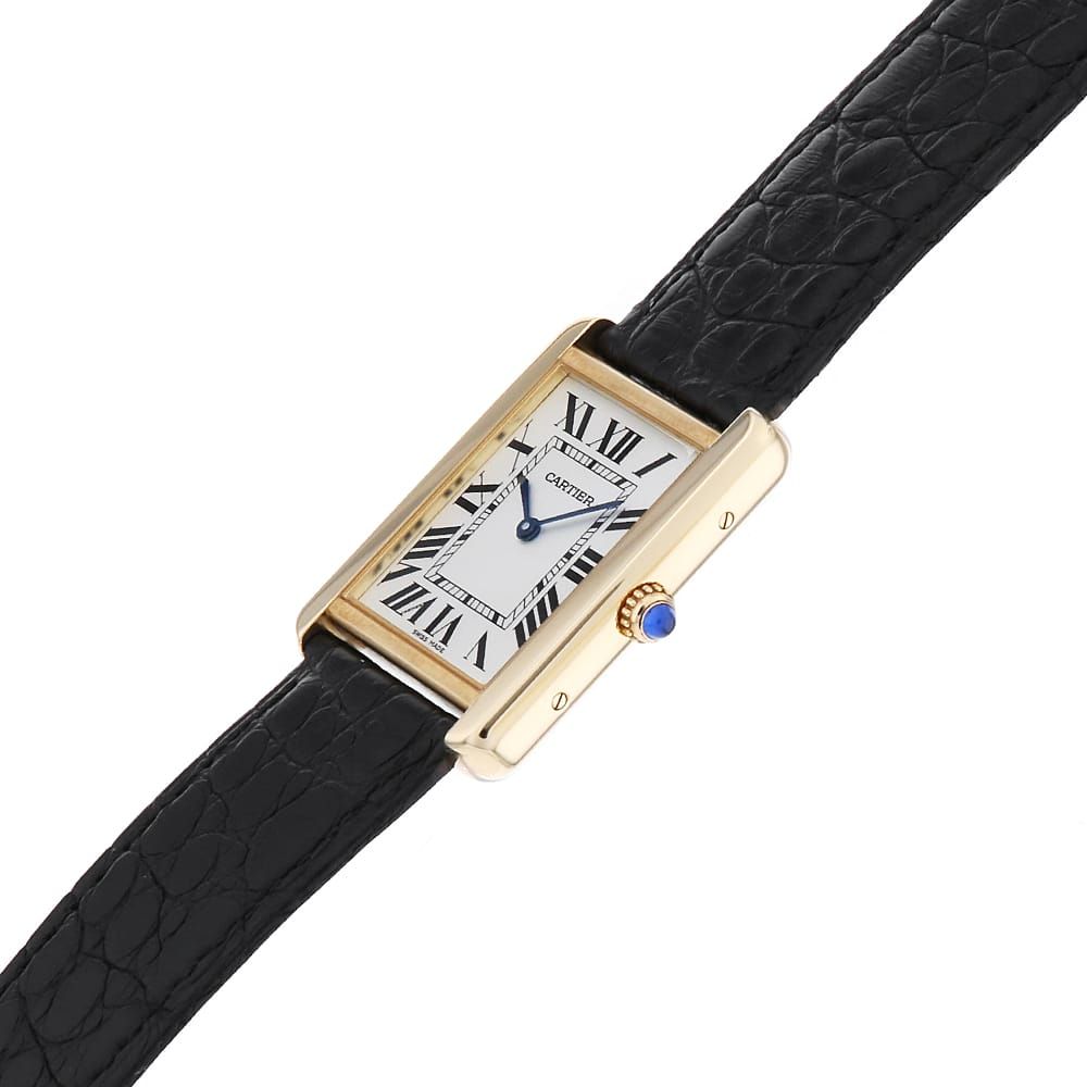 ■モデル情報:シンプルな角型ケースにシルバーのダイアルが配された、\"タンク\"シリーズの中でもクールで爽やかなイメージを与えるモデルです。ブラックのクロコストラップとの組み合わせが大変シックで、コーディネートのポイントとして永く愛用できます。7時のローマンインデックスのVの一部にCARTIERの文字を使用しており、細部にまでこだわりが感じられる逸品です。