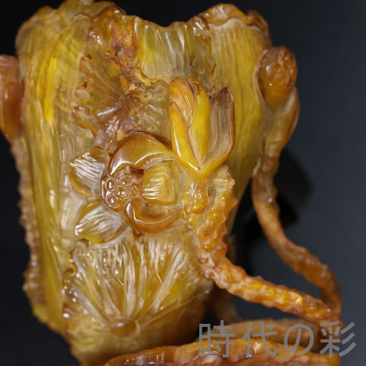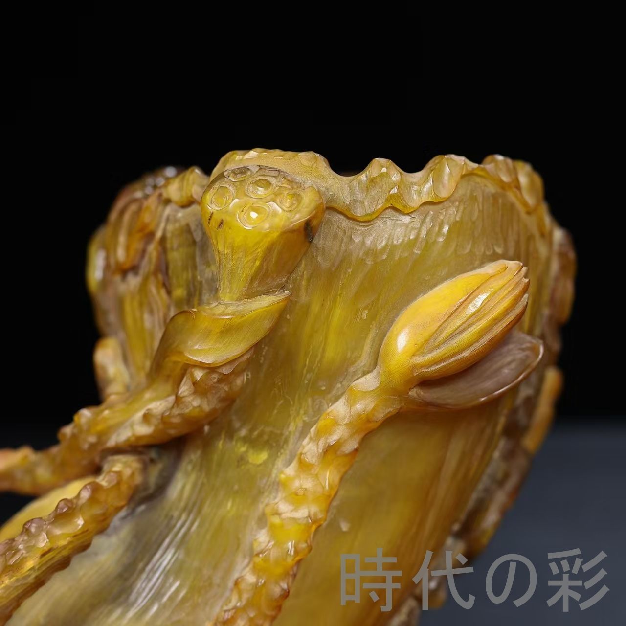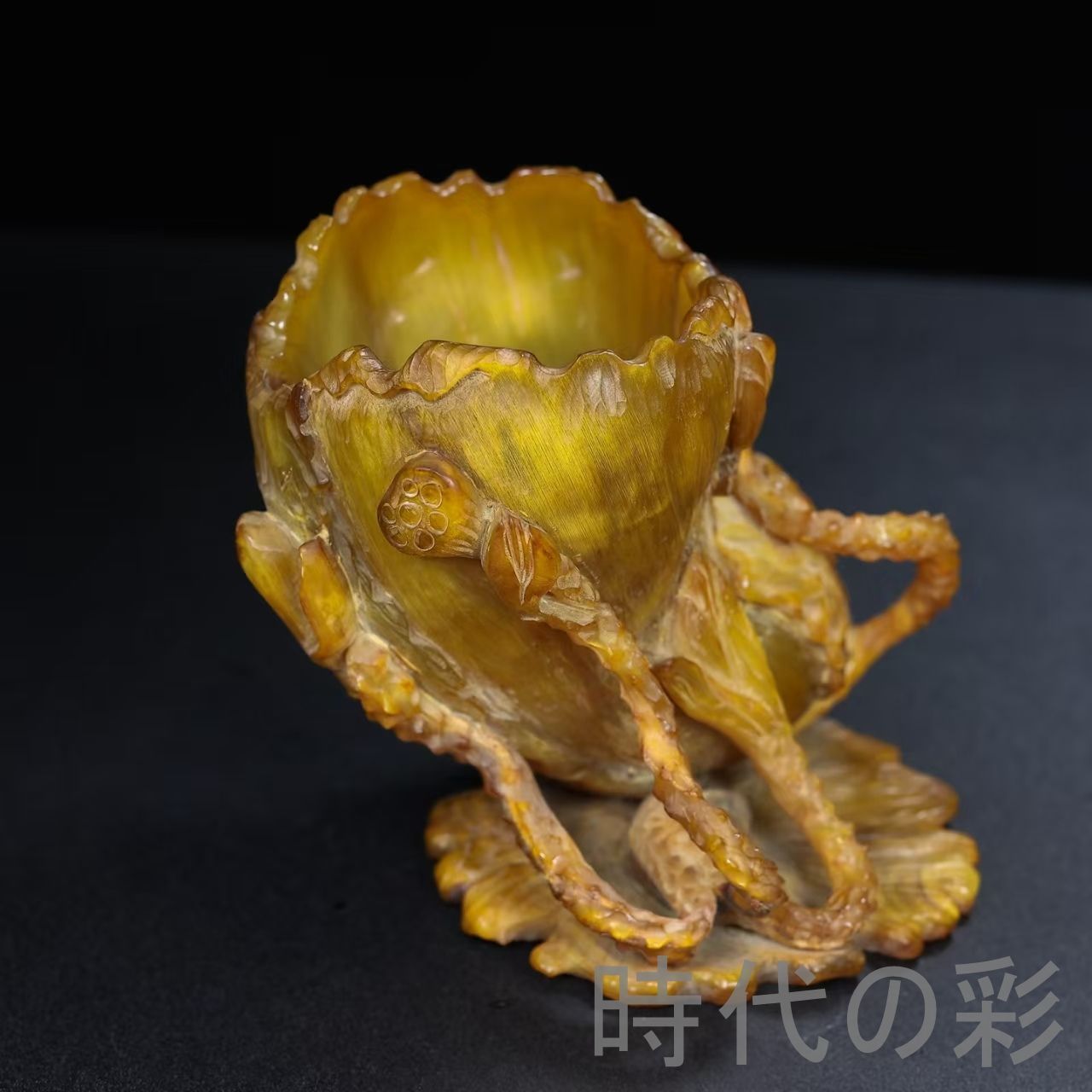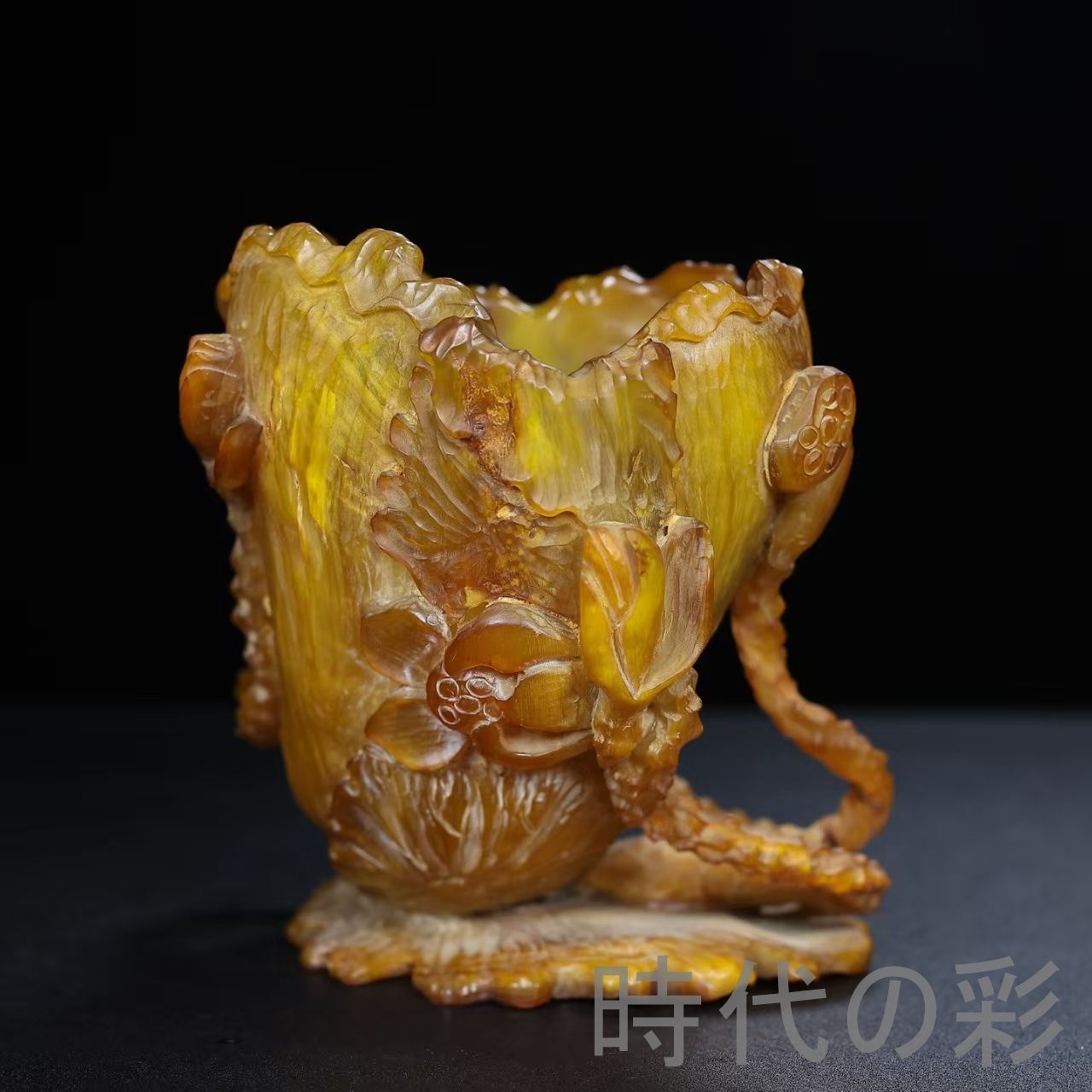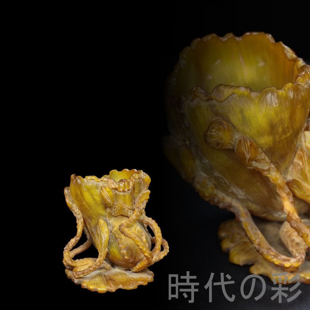荷花文様を彫刻した牛角製筆筒。落ち着いた質感で書斎空間に調和する文房工芸品です。