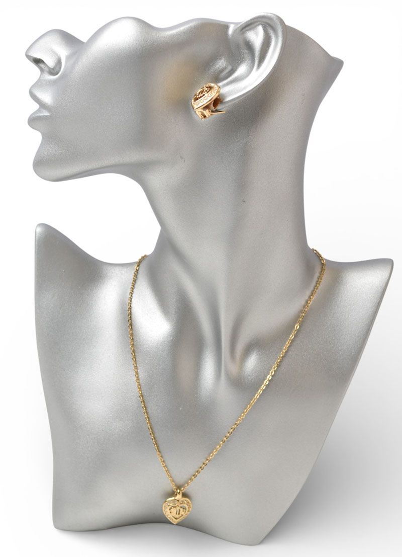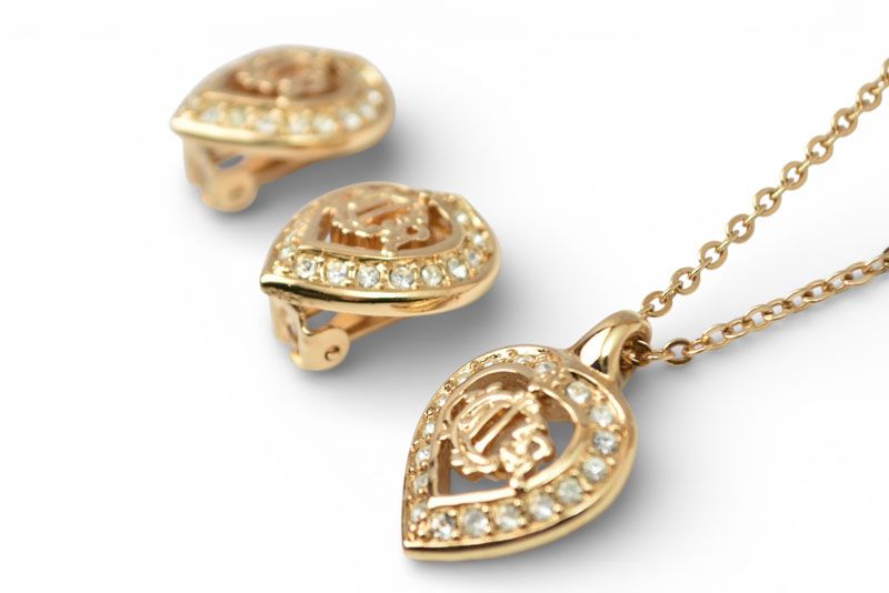 ディオールより、ネックレスとイヤリングのセットです。ハートの中にラインストーンが華やかです。普段使いはもちろん、幅広く使いやすいデザイン!スタイルに合わせて、ワンピース、パーティーシーンなどで、大活躍しそうです。普段の装いに魅力的な輝きを添える洗練されたジュエリーです。