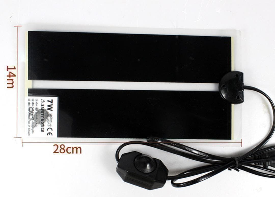 ①ケージの下や、水槽の下・側面にパネルヒーターをセット。パネルは裏表加熱します。