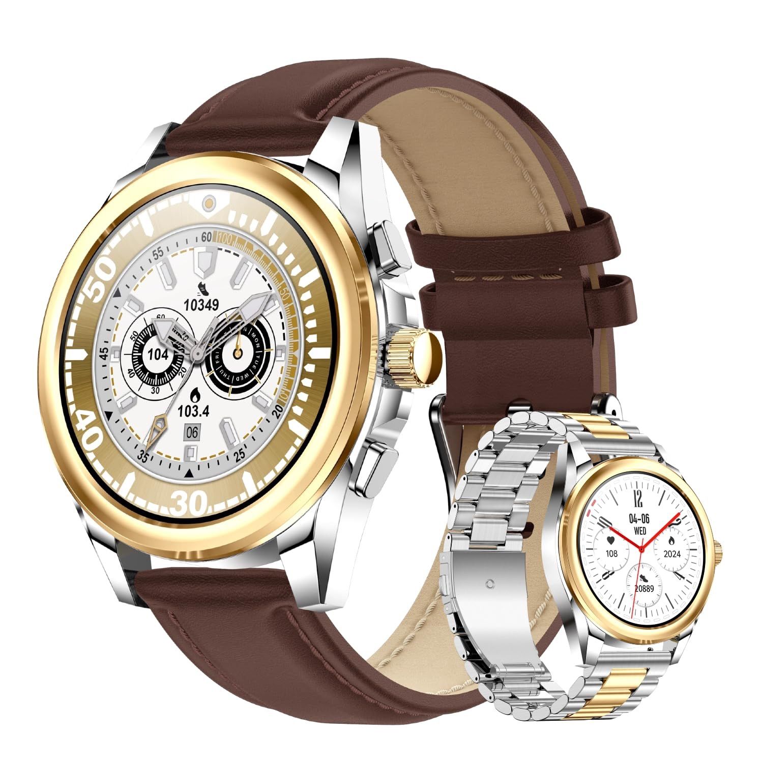 【その他の便利機能】 音楽再生コントロール、カメラ遠隔操作、目覚まし、天気表示など、日常生活をサポートする機能も充実。付属品はスマートウォッチ本体、2種類のベルト、USB充電ケーブル、取扱説明書です。