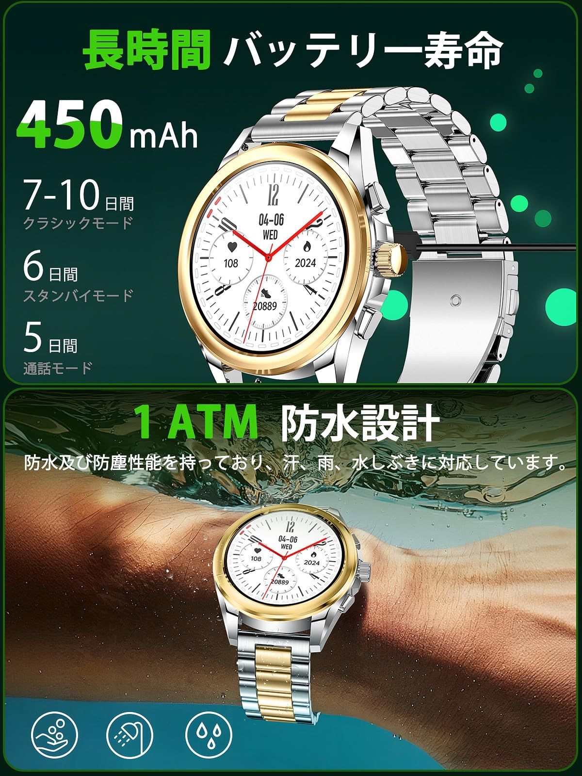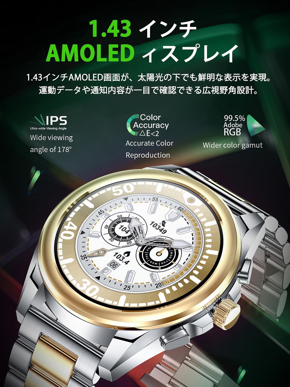 【1.43インチAMOLED高精細画面】 1.43インチのAMOLEDディスプレイを採用し、屋外でも見やすいクリアな表示を実現。専用アプリで好みの文字盤を選べ、オリジナルの写真を背景に設定することもできます。1ATM防水仕様で、雨や手洗い時の使用にも対応(湯船・潜水時の使用は不可)。