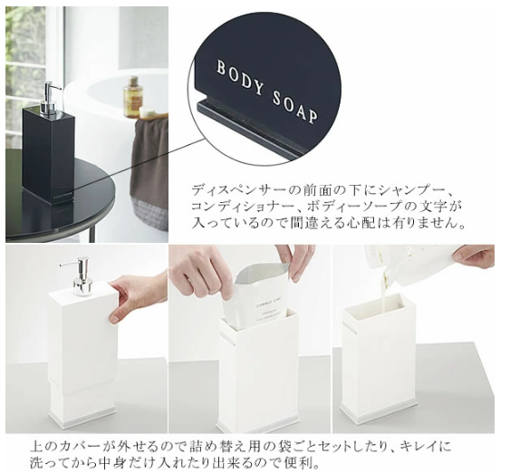 カバーを外せるので、詰め替えの時に中を洗って入れ替える事が出来るので衛生的。