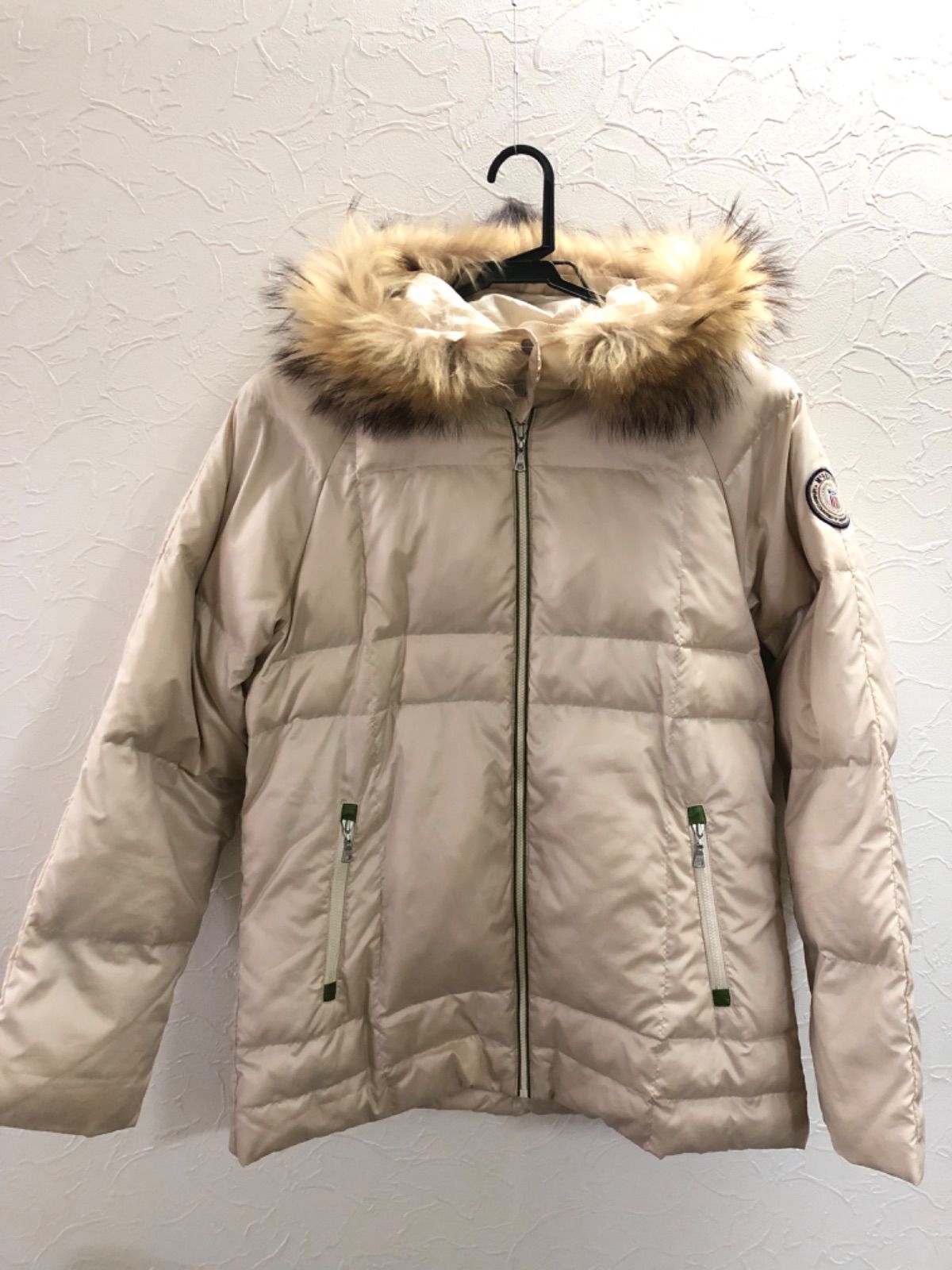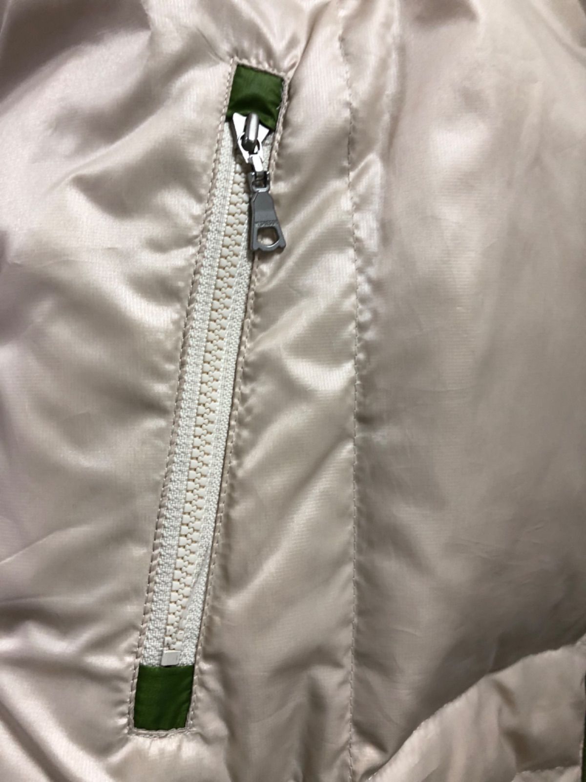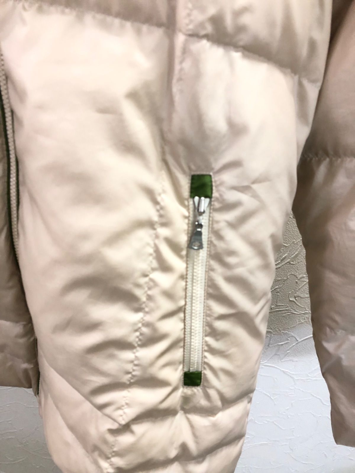 色も綺麗なベージュで軽くて着心地は良いです。中は鮮やかな黄緑色で素敵なダウンジャケット 二の腕部分にロゴのワッペンがありおしゃれポイントです。内ポケット一つありいざという時に使えるポケットです。